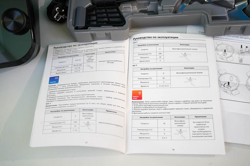 В комплекте идет подробное руководство по эксплуатации с описанием всех режимов и советами по использованию техники, чтобы вы могли раскрыть все возможности прибора. Инструкция на русском языке, так что проблем с изучением материала не должно быть. Забегая вперед скажу, что интерфейс робота интуитивно понятный, а рецепты в приложении — достаточно подробные, чтобы не постоянно прибегать к этому руководству.