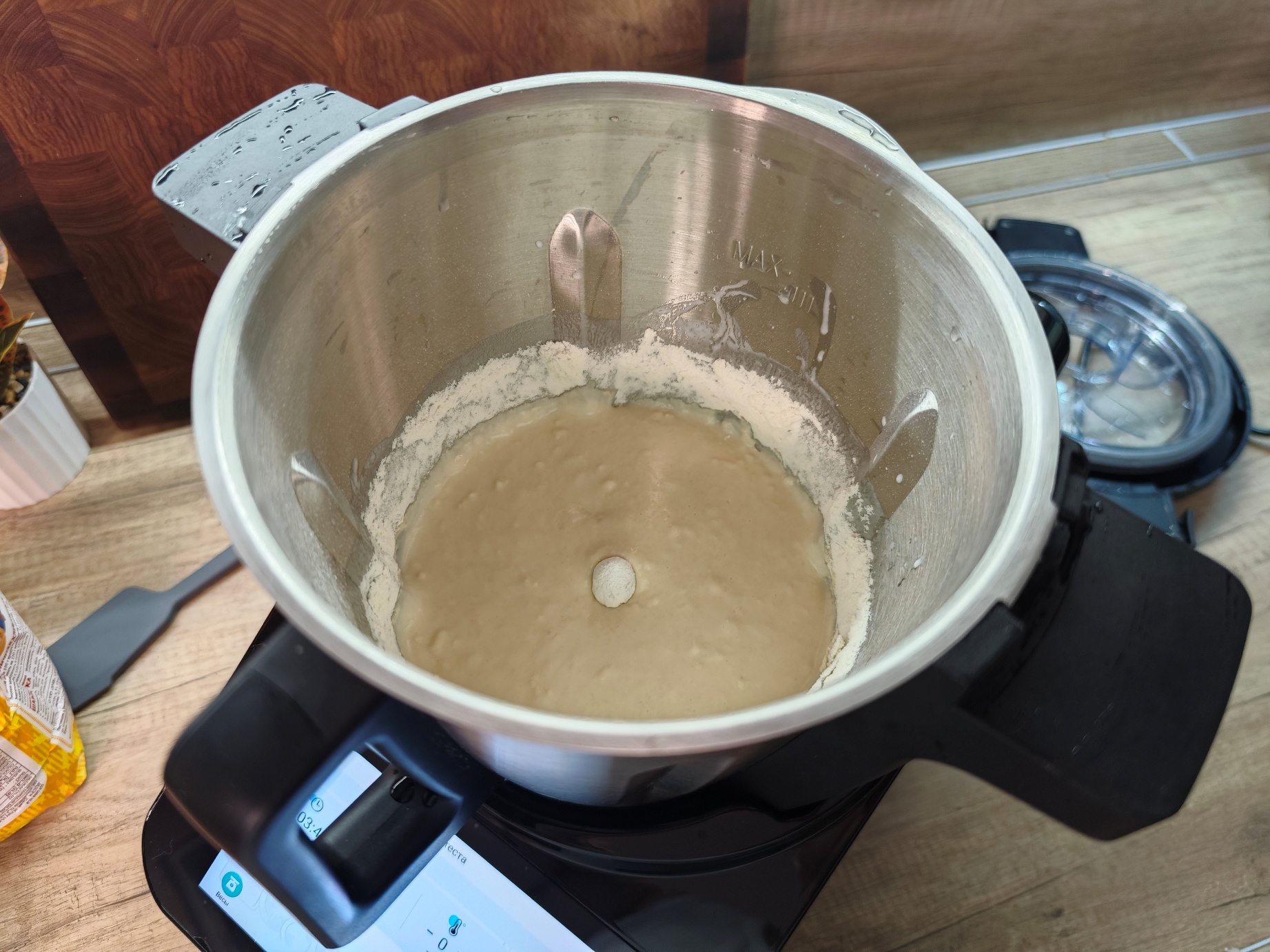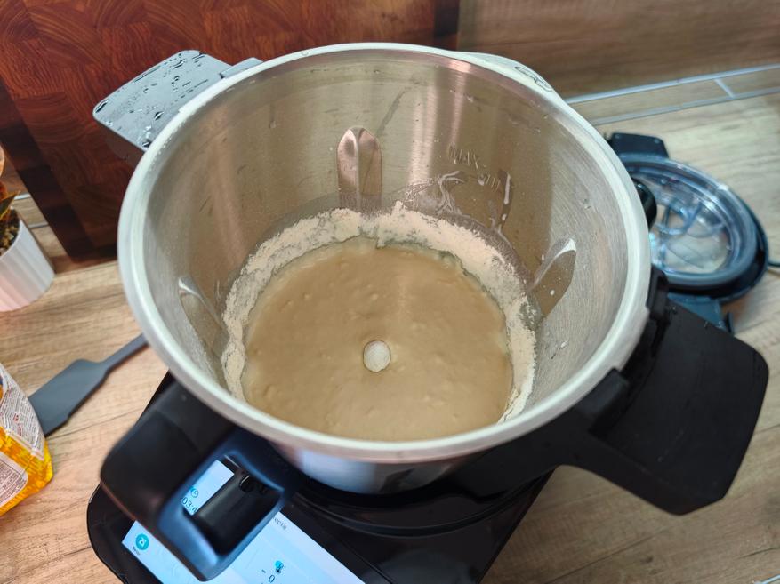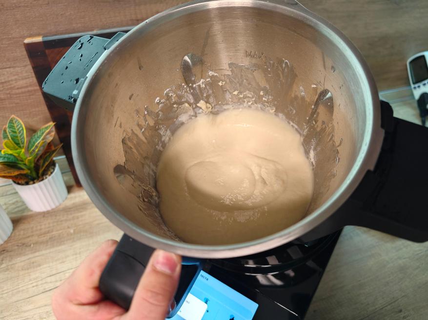 В режиме «Тесто» можно подготовить тесто для выпечки. Выше я показывал специальную лопаточку для замешивания теста — устанавливаем её, затем выбираем нужную программу. В данном случае я активно использую встроенные весы для контроля количества ингредиентов (по рецепту). Добавляем нужные ингредиенты по списку, замешиваем. Если требуется — можно делать паузу, добавляя новые ингредиенты.