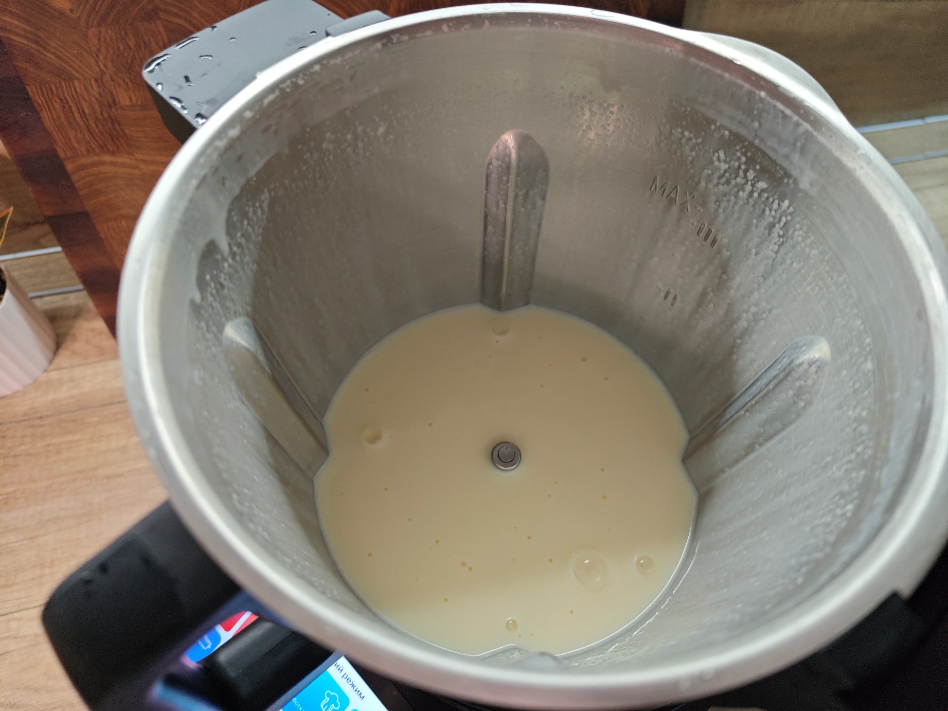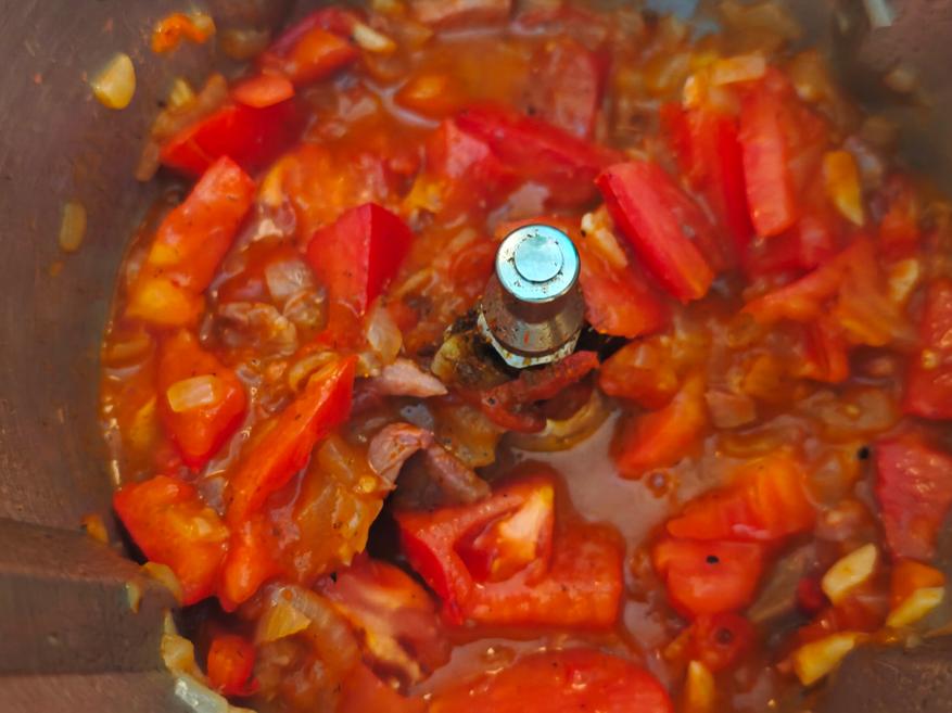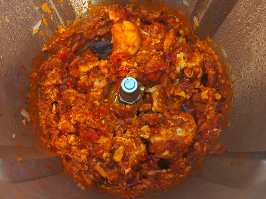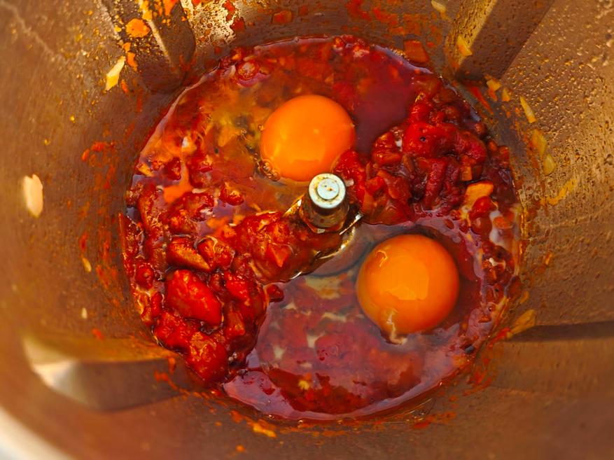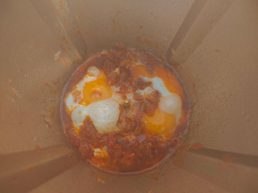 Было интересно попробовать рецепт яичницы-шакшуки, который ранее не пробовал, так как пошаговое приготовление отнимает много времени. А тут вполне себе цель — приготовить все с помощью одного кухонного прибора, без постоянного помешивания. Сначала готовлю лук — программа измельчение с помощью универсального ножа в самом роботе. Затем пассируем лук (программа-жарка). Следующий шаг — добавляем помидоры/томатную пасту и специи. Минут 10-15 обжариваем с вращением лопатки, чтобы выпарить лишнюю воду. Не забывайте подсолить по вкусу. Потом добавляем 2-3 яйца. В этом моменте можно перейти в ручной режим и включить обжаривание без вращения лопатки (скорость 0, температура 100, мощность 10), но лучше все-таки оставить режим с перемешиванием (крайнее фото). Получилось действительно вкусно. А тот факт, что обжарка с перемешиванием не требует внимания пользователя — экономить значительное количество времени: я могу спокойно собираться утром, не отвлекаясь на приготовление завтрака. А после того, как ёмкость освободится, достаточно запустить режим глубокой очистки — щеточка уберет остатки томатной пасты с поверхности.