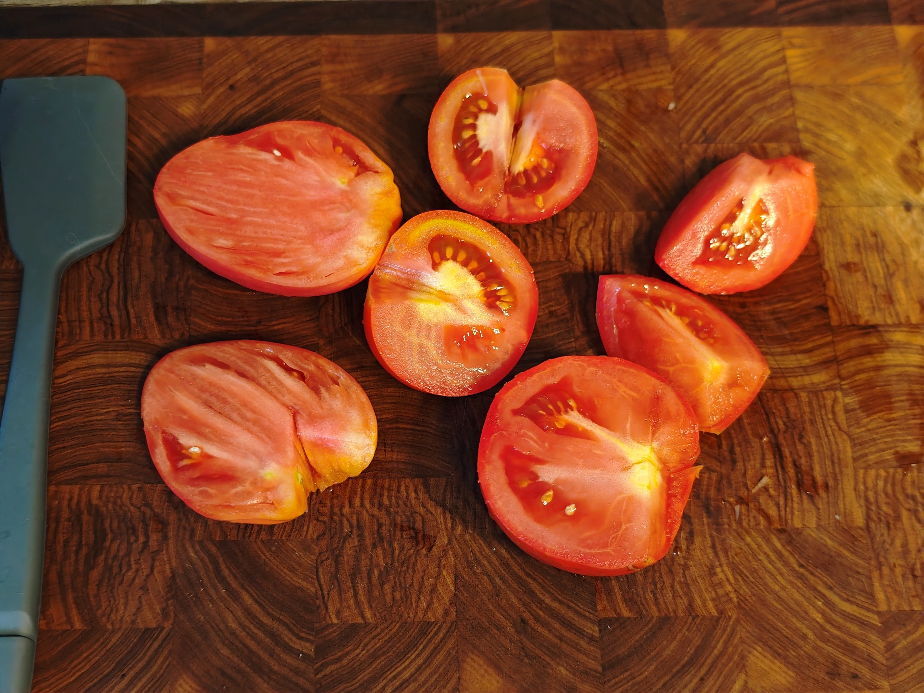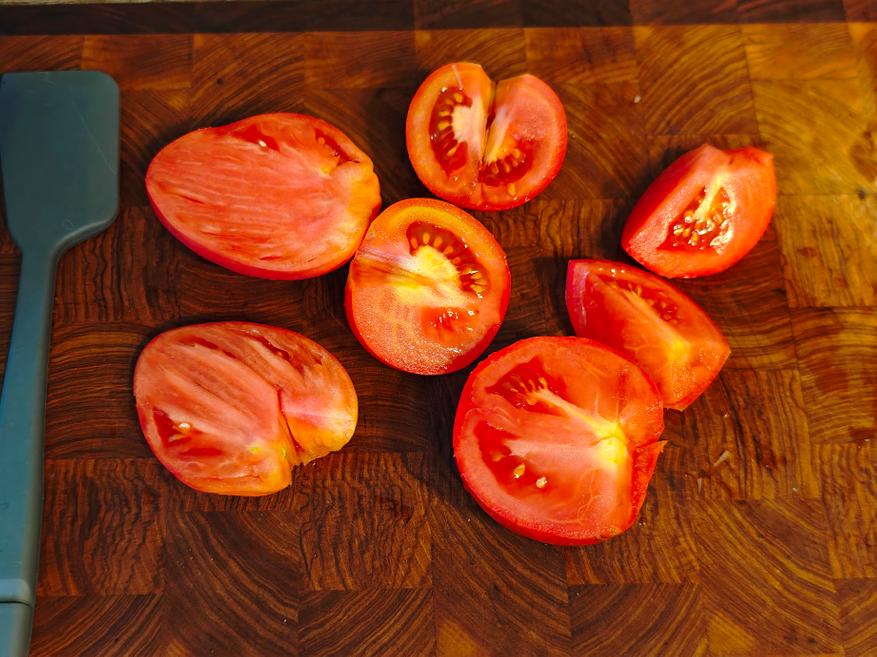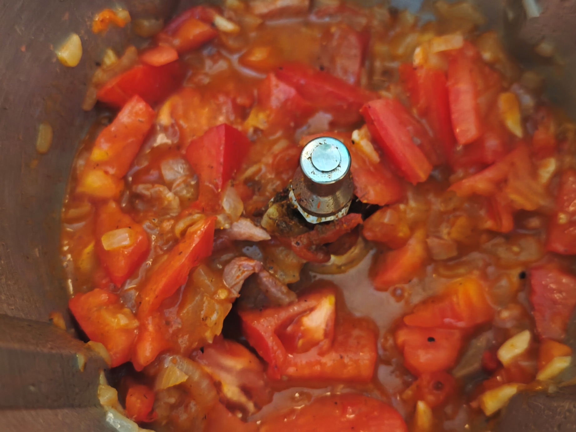 Было интересно попробовать рецепт яичницы-шакшуки, который ранее не пробовал, так как пошаговое приготовление отнимает много времени. А тут вполне себе цель — приготовить все с помощью одного кухонного прибора, без постоянного помешивания. Сначала готовлю лук — программа измельчение с помощью универсального ножа в самом роботе. Затем пассируем лук (программа-жарка). Следующий шаг — добавляем помидоры/томатную пасту и специи. Минут 10-15 обжариваем с вращением лопатки, чтобы выпарить лишнюю воду. Не забывайте подсолить по вкусу. Потом добавляем 2-3 яйца. В этом моменте можно перейти в ручной режим и включить обжаривание без вращения лопатки (скорость 0, температура 100, мощность 10), но лучше все-таки оставить режим с перемешиванием (крайнее фото). Получилось действительно вкусно. А тот факт, что обжарка с перемешиванием не требует внимания пользователя — экономить значительное количество времени: я могу спокойно собираться утром, не отвлекаясь на приготовление завтрака. А после того, как ёмкость освободится, достаточно запустить режим глубокой очистки — щеточка уберет остатки томатной пасты с поверхности.
