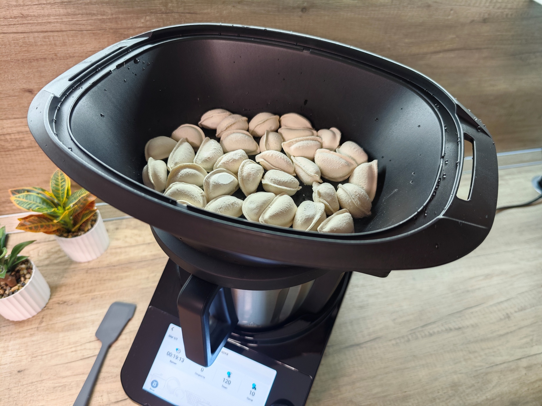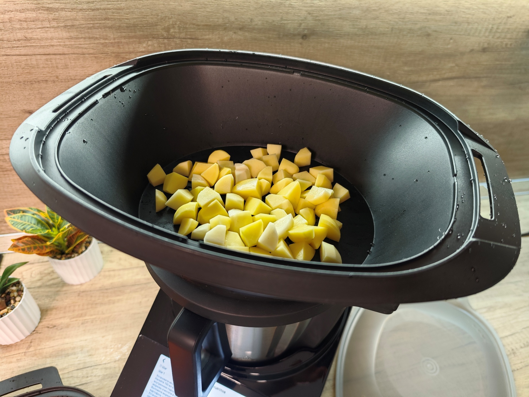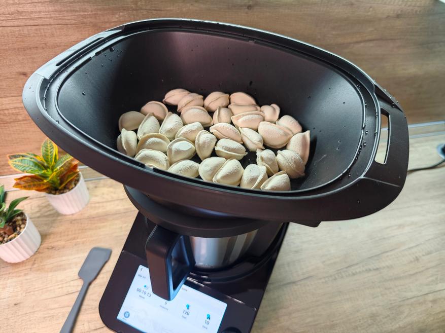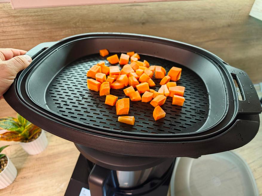 Одним из ключевых преимуществ MIKO SMARTBOT C5 является возможность одновременного приготовления нескольких продуктов, благодаря многоярусной системе. Например, пока на нижнем ярусе варятся яйца в корзинке, в пароварке есть возможность приготовить другое блюдо. Такая функция подойдет ценителям правильного питания, желающим сэкономить время у плиты. На фотографии робот с установленной пароваркой.