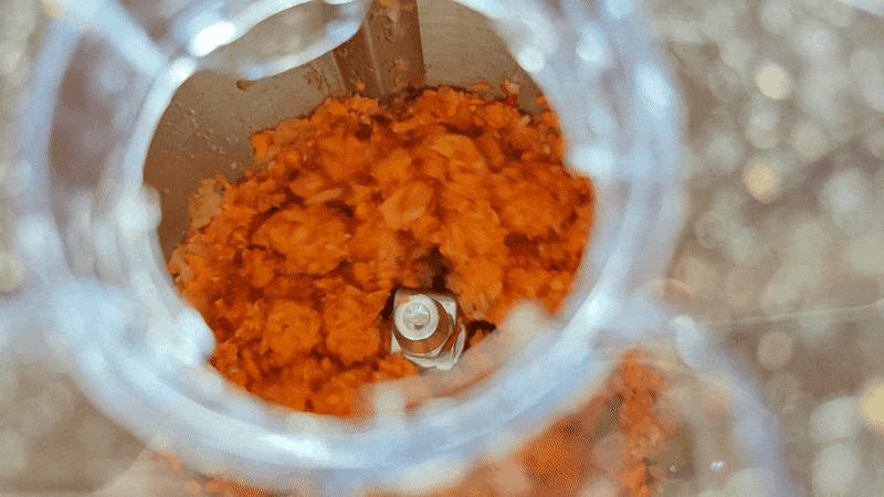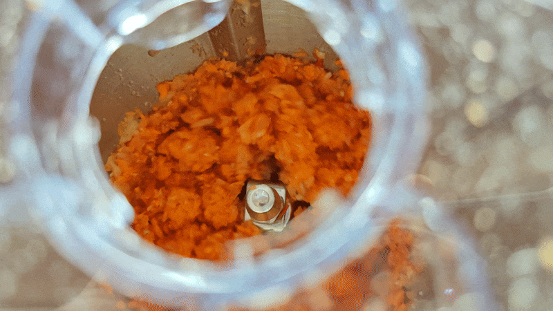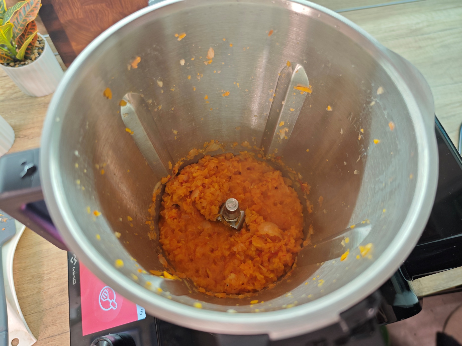Робот позволяет сделать суп (обычный или крем-суп) от начала и до конца, используя автоматические программы. То есть, начиная от измельчения ингредиентов, пассерования овощей, основной варки. Может даже измельчить мясо для приготовления супов на мясном бульоне. Задача стояла приготовить борщ, для зажарки взял несколько небольших морковок и лук. Измельчаю в режиме нарезки (установлена основная насадка-нож).