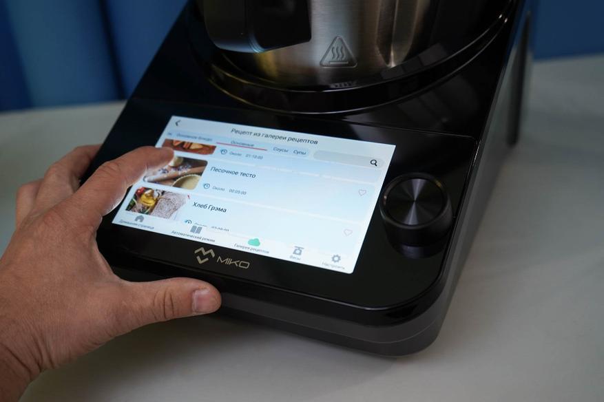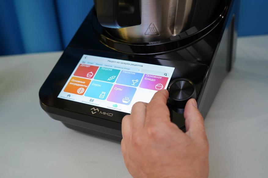 Управление с помощью сенсорного дисплея делают этот аппарат удобным выбором для тех, кто ценит простой и понятный интерфейс. Помимо сенсорного экрана в управлении участвует поворотное колесо-энкодер, расположенное справа от дисплея. Поворотное колесо помогает управлять, например, если у вас влажные руки (что часто бывает при готовке). Конечно, можно воспользоваться и управлением со смартфонов и планшетов — зачастую это удобнее, особенно при поиске и выборе рецептов.