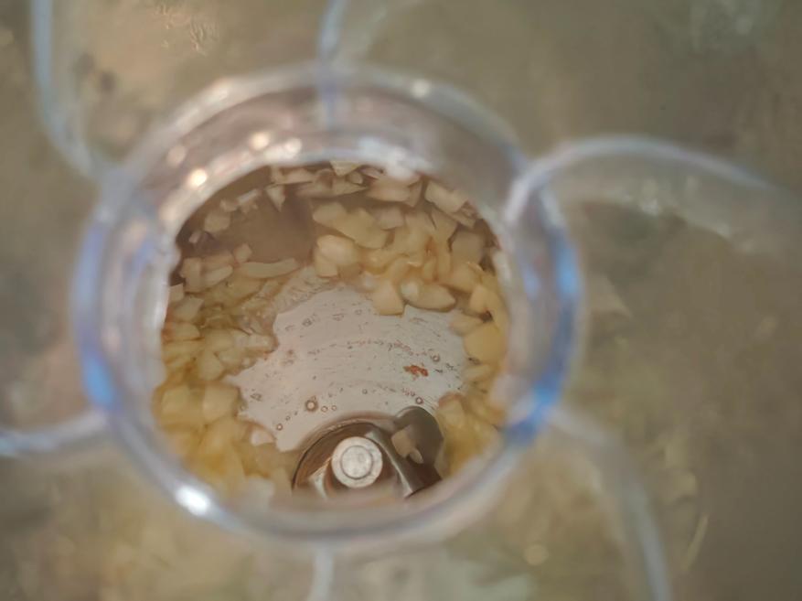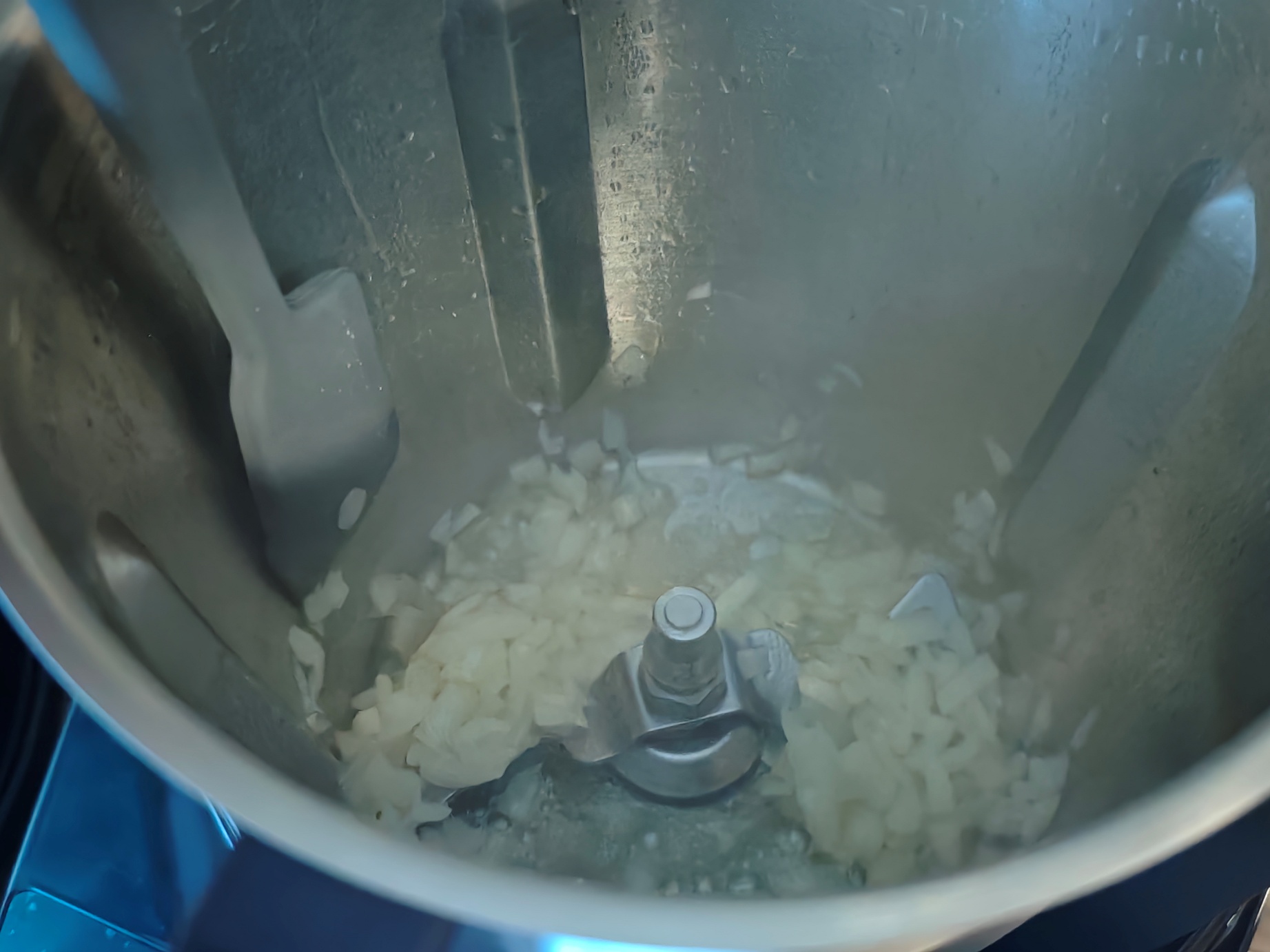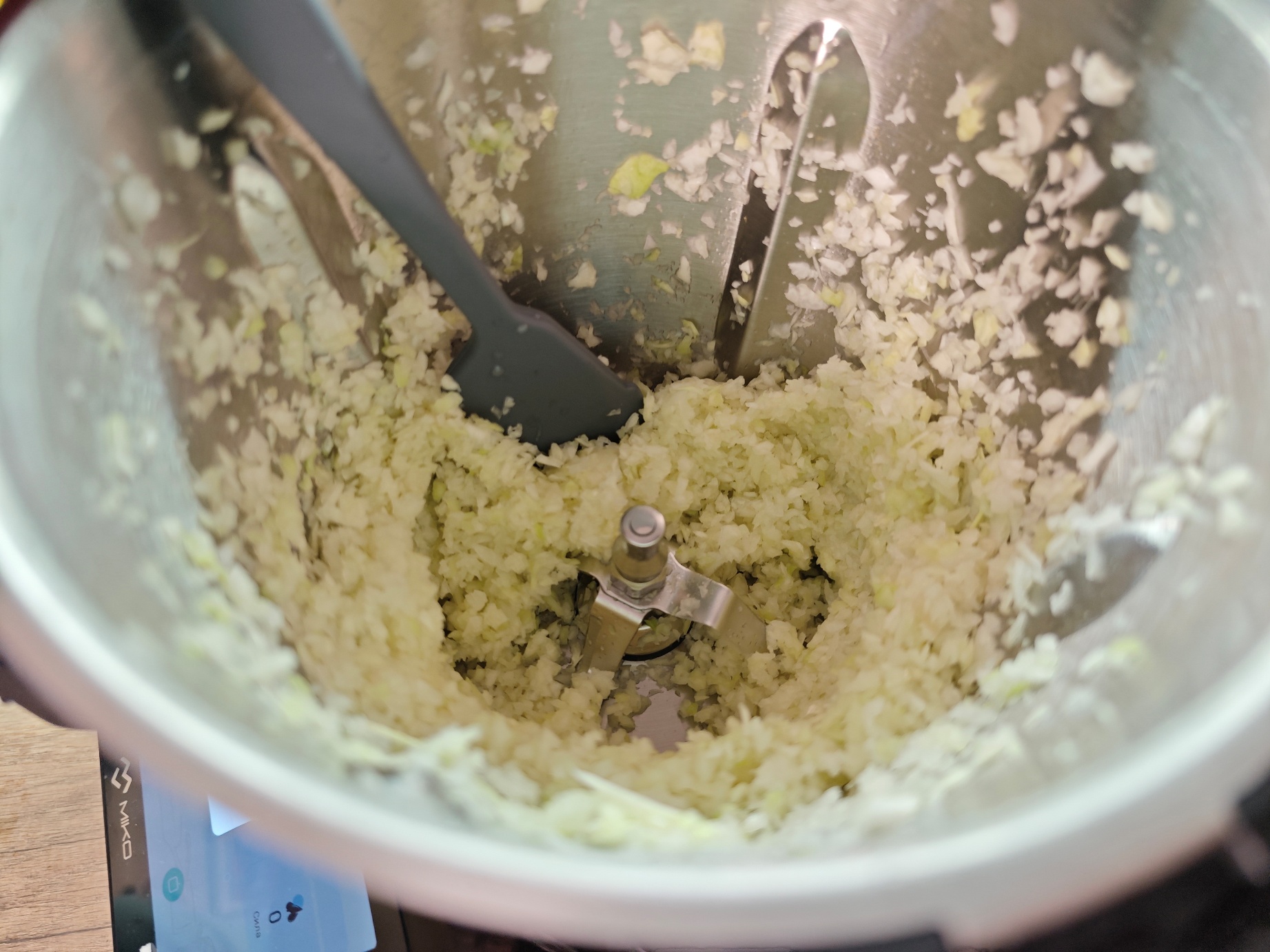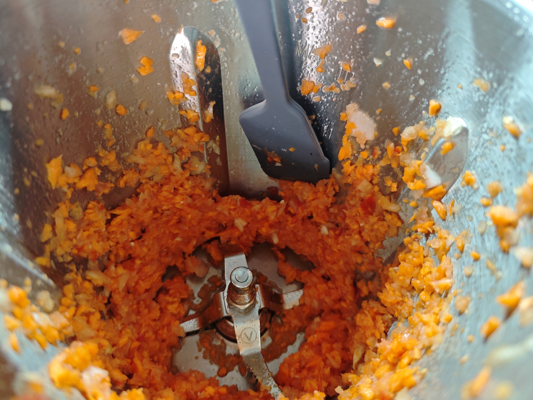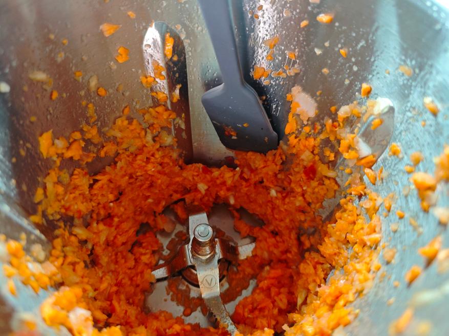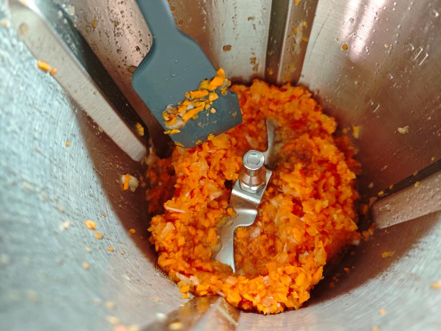 Собираю овощи лопаточкой со стенок, заодно переставляю нож на лопатку для жарки. Запускаю программу для обжарки (пассерования) овощей. Нужно добавить немного растительного масла. Следить за процессом не требуется — робот самостоятельно перемешивает ингредиенты, чтобы не пригорали к чаше. Верхнее отверстие я оставил открытым, чтобы выходила лишняя влага при обжарке.