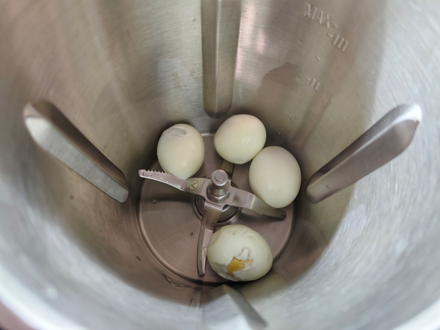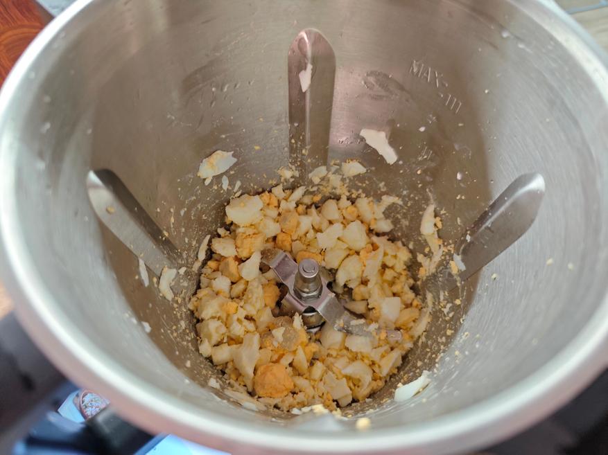 На этом этапе можно сэкономить время, и заранее положить яйца в нижнюю корзину (сито) — они сварятся вместе с овощами. По окончанию программы остужаем яйца и овощи, яйца добавляем в чашу робота и запускаем программу измельчения.