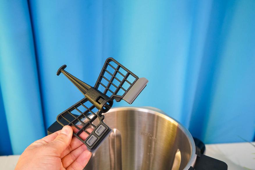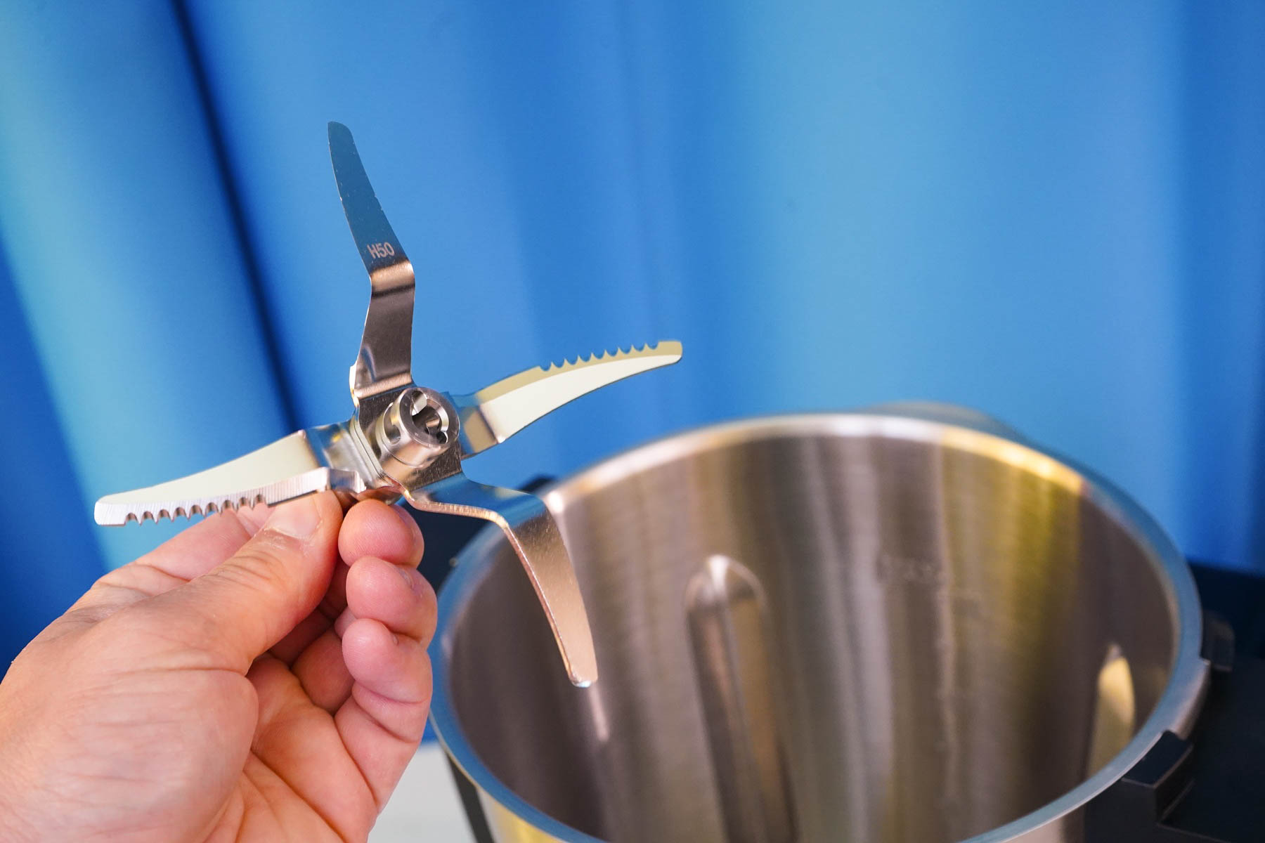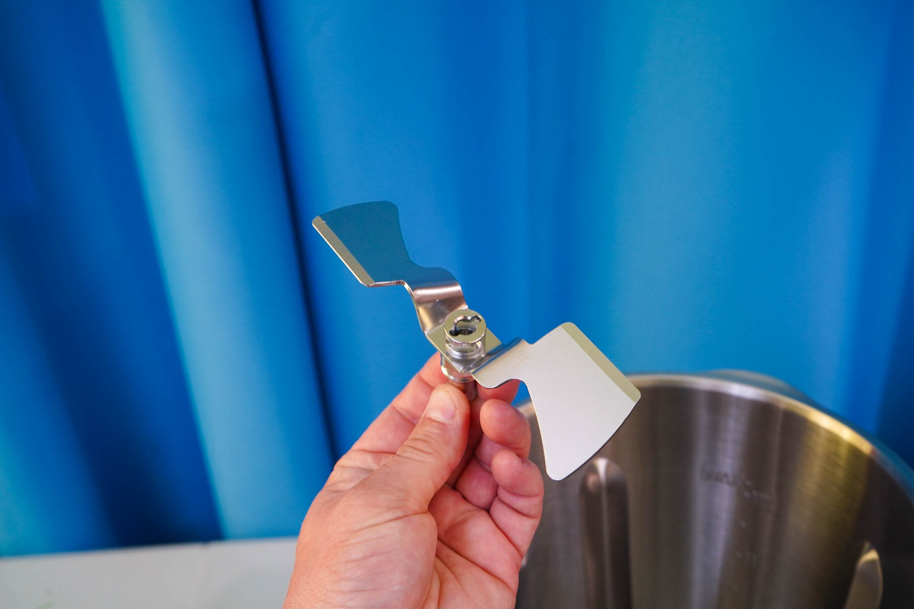 Три металлические насадки позволяют нарезать/перемешивать/измельчать продукты по автоматическим программам. Основная насадка — это многофункциональный нож из нержавеющей стали. Имеет четыре лезвия-лепестка с односторонней заточкой, а также частично с серрейторной заточкой (зазубрины). Позволяет выполнять все виды измельчения и нарезки, включая колку льда. Дополнительная насадка — лопатка с двумя лепестками, которая применяется для перемешивания ингредиентов во время обжарки. Еще одна насадка — односторонняя лопатка, предназначенная только для замешивания теста. Все насадка устанавливаются на ось привода с небольшим нажатием и поворотом против часовой стрелки. Для того чтобы снять насадку, потребуется слегка нажать на неё и повернуть по часовой стрелке.