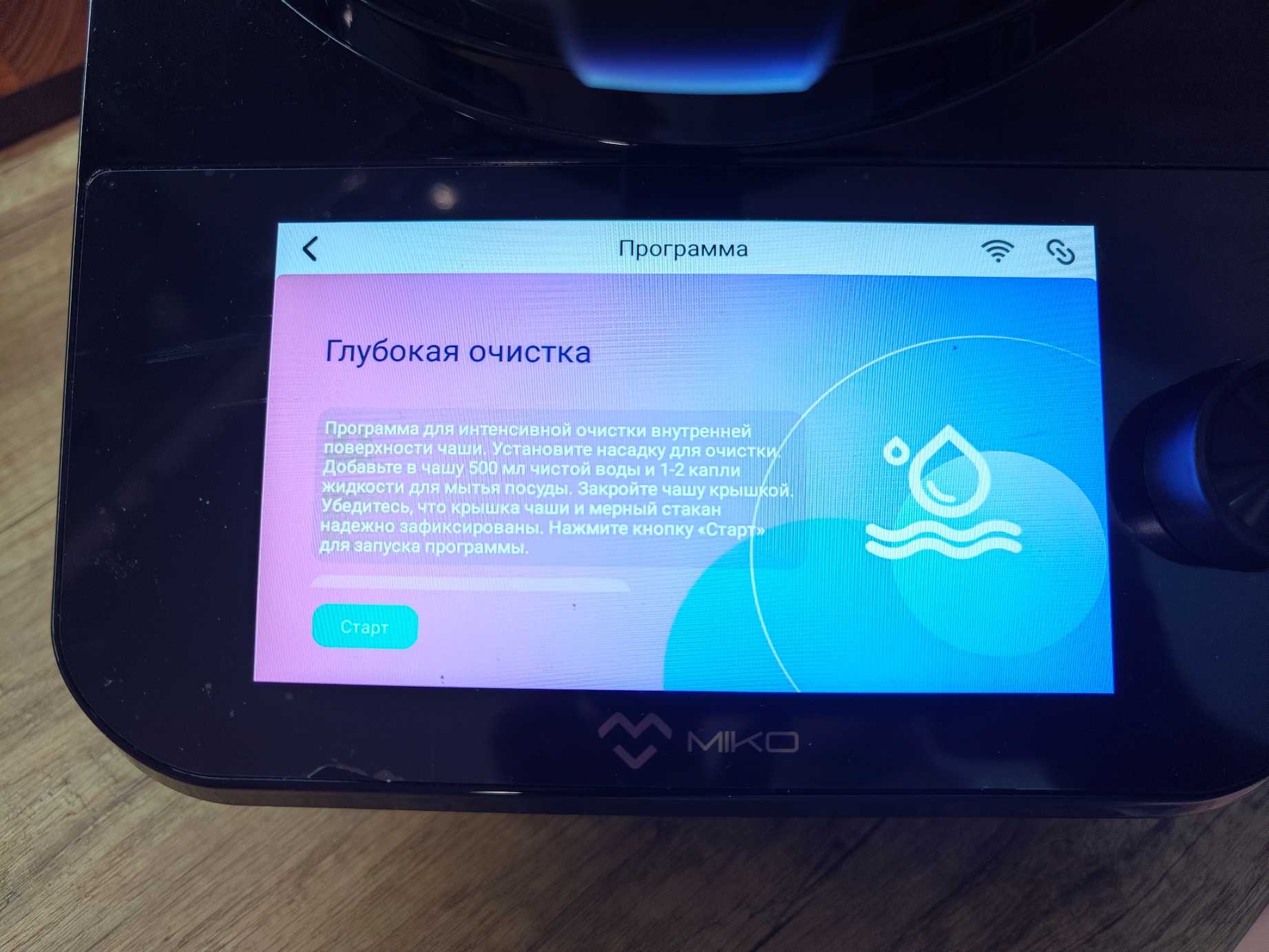 После густых блюд или, например, после замешивания теста, легкая самоочистка не справляется с остатками ингредиентов. Вот тут и пригодится насадка-щеточка для глубокой очистки. Снимаем полностью универсальный нож и устанавливаем эту насадку. Её особенность — это усиленная очистка дна ёмкости, которая также может потребоваться после жарки различных блюд. Программа длится 5 минут, вполне можно запустить повторно. Моющее средство добавлять не обязательно — в этом режиме вода подогревается до 90 градусов, что обеспечивает быстрое удаление остатков.