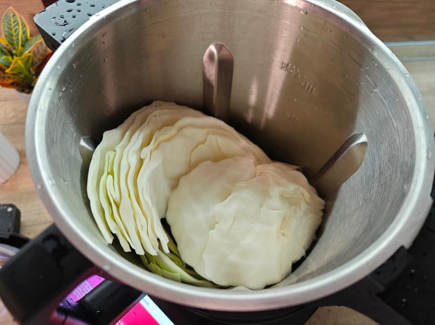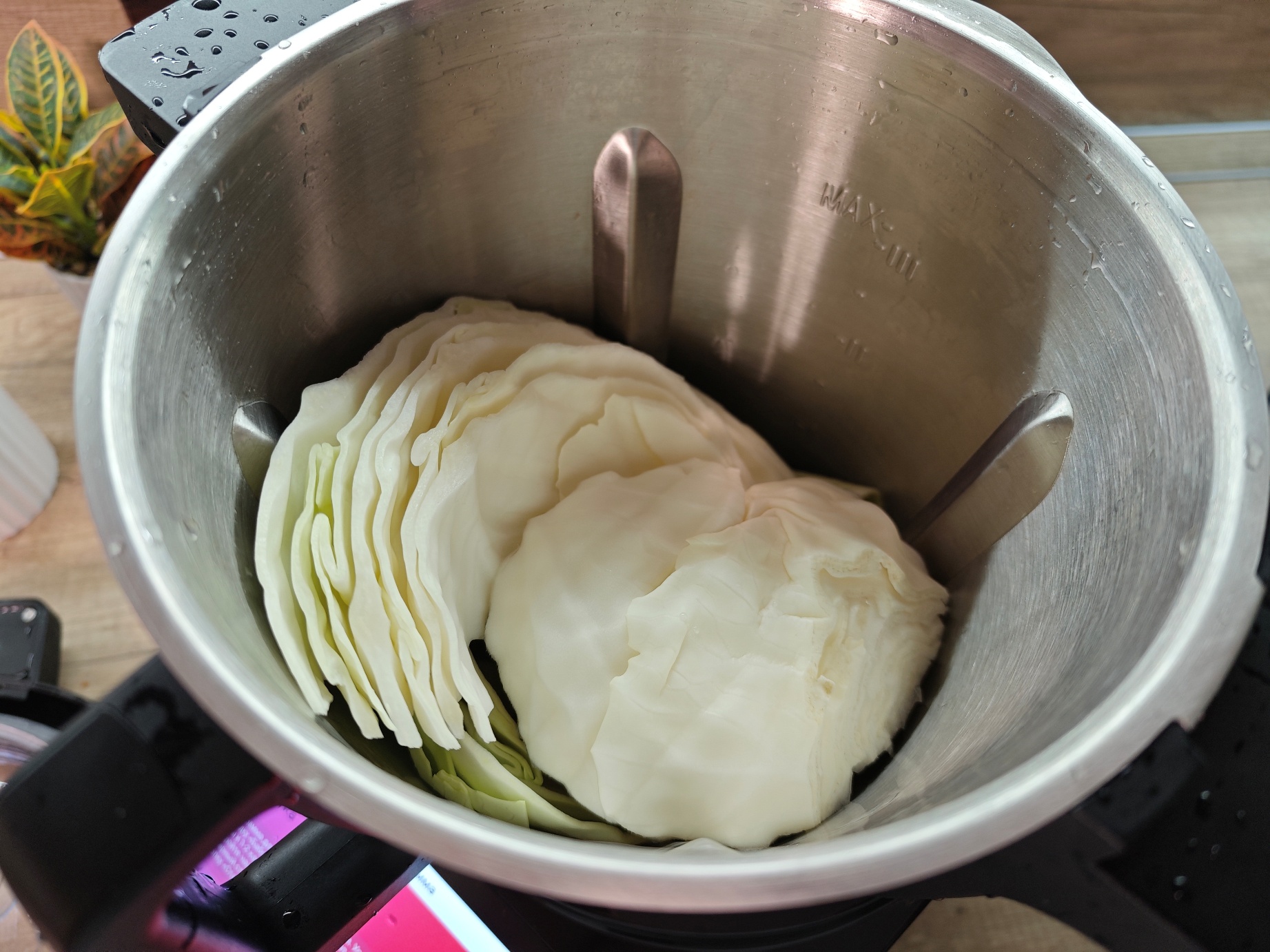 По завершению программы обжарки пассированные овощи перекладываю в ёмкость — мне нужно освободить чашу для нарезки, на этот раз, порции капусты. В данном случае нужно было запустить программу однократной нарезки, но мне показалось этого мало, и со второго раза аппарат перемолол всю капусту слишком мелко. Что ж, учту на будущее. Добавляю пережаренные ранее овощи, добавляю воды согласно рецепту, приправы/соль и запускаю программу «Суп».