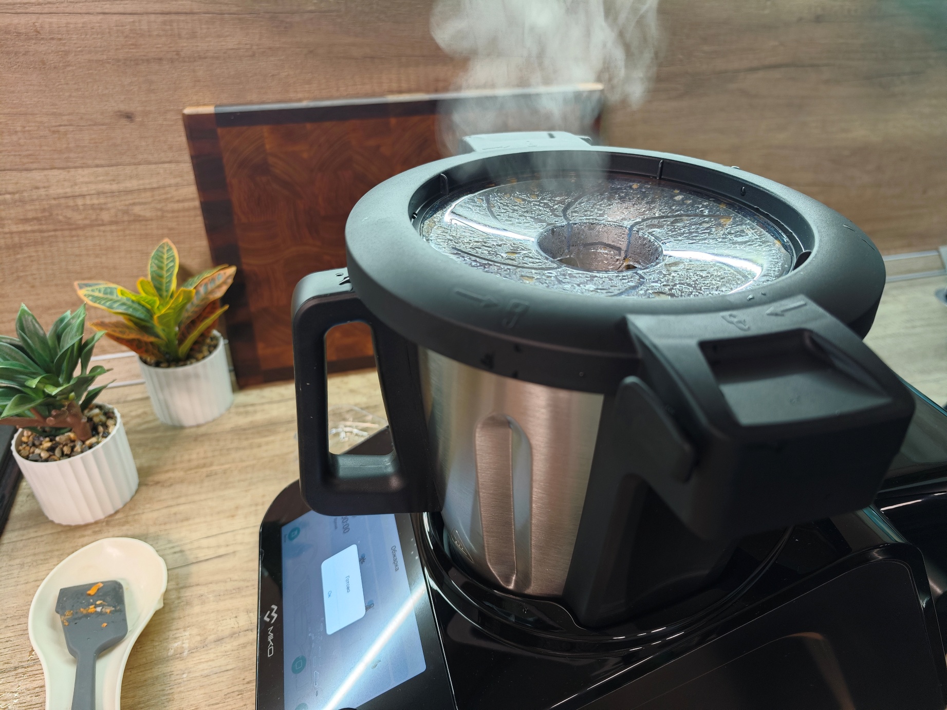 Что же касается шума при работе, то тут сильно зависит от выбранного режима работы. Например, жарка/варка с перемешиванием «шумят» в пределах 50-60 дБ, интенсивное перемешивание — около 65 дБ. При работе в режиме блендера/измельчителя или в режиме самоочистки уровень шума может достигать 70 дБ. Впрочем, обычный блендер шумит на подобном уровне, так что это вполне нормальные результаты.