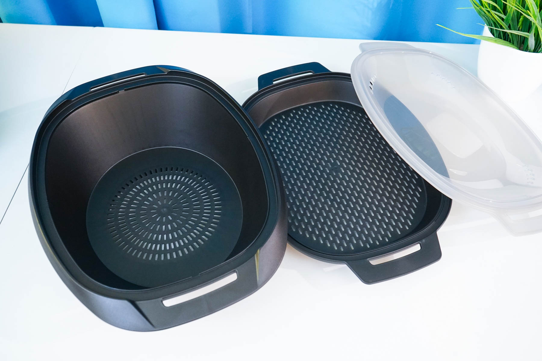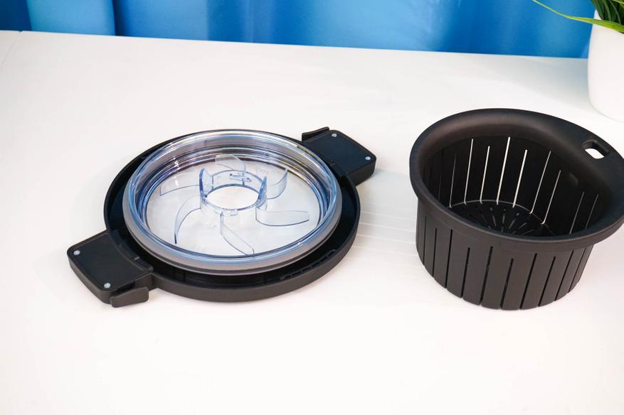 Корзину-сито можно использовать в качестве нижнего яруса в режиме пароварки, а можно использовать для фильтрации, например, при приготовлении супа или сока в качестве сита. А крышку основной чаши можно закрыть с помощью мерного стаканчика из комплекта, что будет удобно при приготовлении обычных блюд или при интенсивном взбивании/перемешивании.