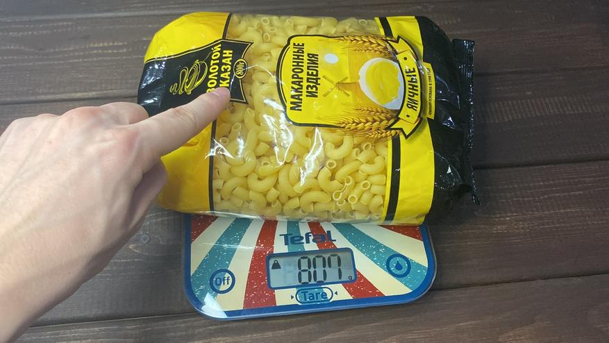 Теперь же измерим что-то крупное, например пачку макарон с указанной граммовкой (800 гр) и видим, что весы показывают 807, где семь граммов приходится на упаковку, что очевидно.