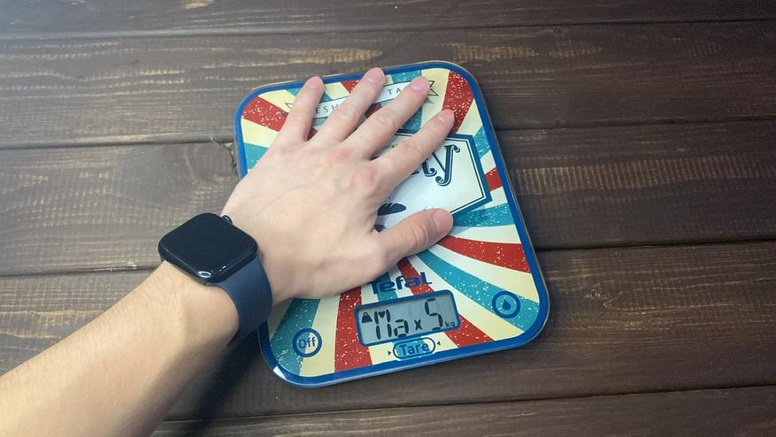 Всё, оказывается, очень просто, необходимо расположить ладонь на рабочей зоне взвешивания (см. на след. фотографию):
