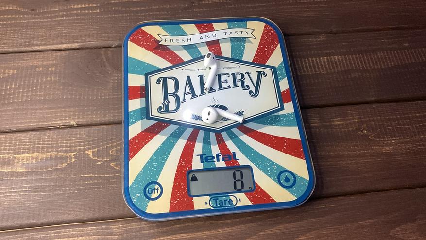 Взвесим наушники AirPods 2, вес каждого по официальным данным составляет 3.5 грамма и по идеи должно получиться 7 граммов, да? Но в моём случае вышло 8 и это не удивительно, потому что они уже используются больше года и внутри явно есть пыль и т. д.