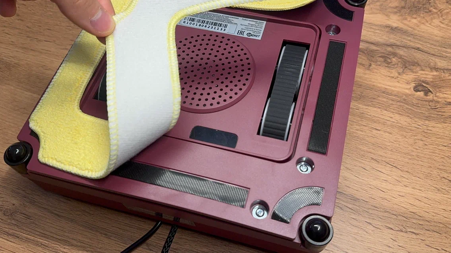 Сменные салфетки фиксируются липучками на всех четырех сторонах, а также по углам. В угловых частях робота расположены датчики, предотвращающие падение. Салфетки можно установить только в двух определенных положениях.