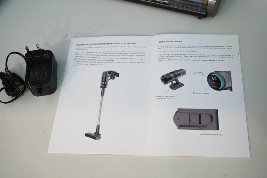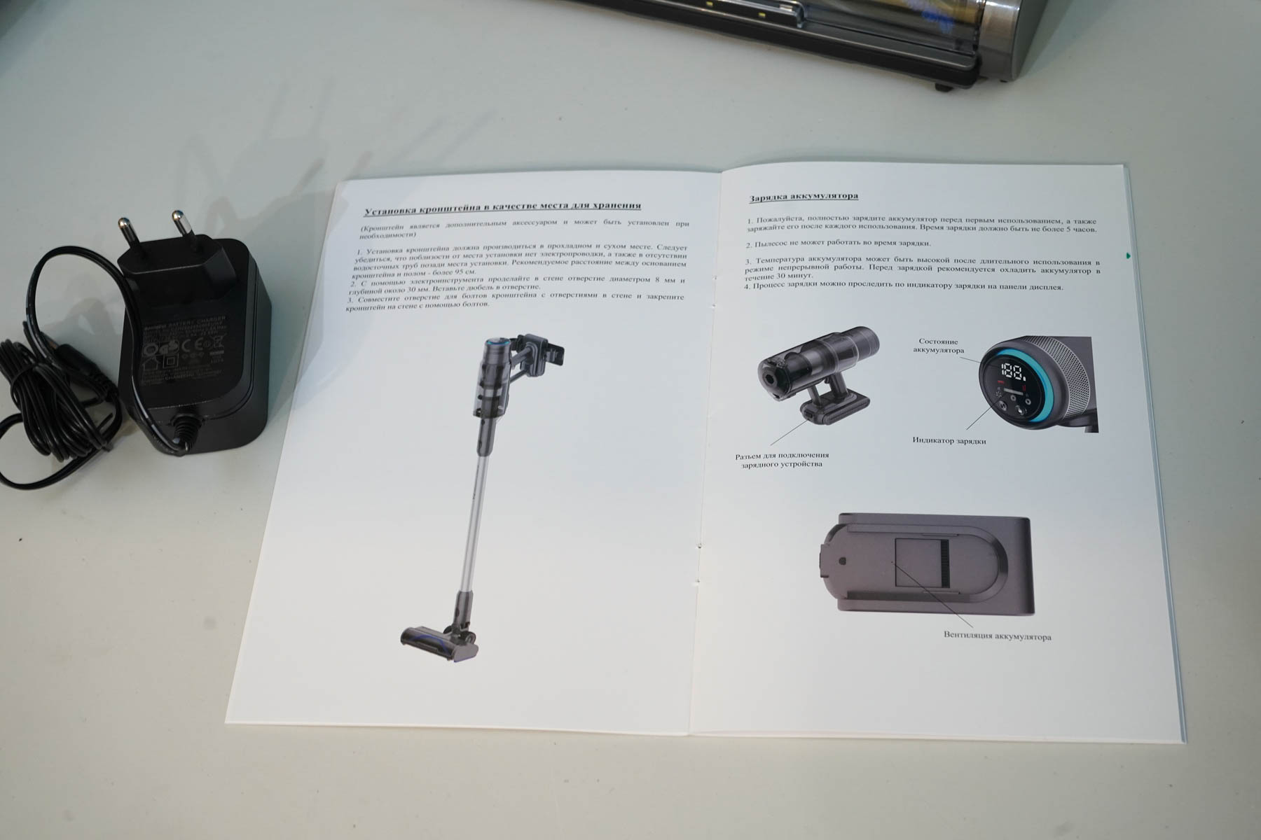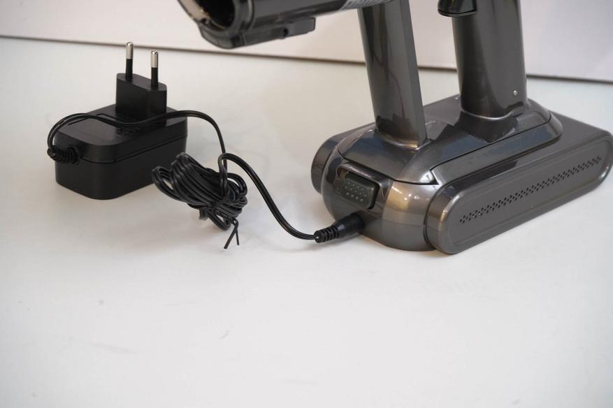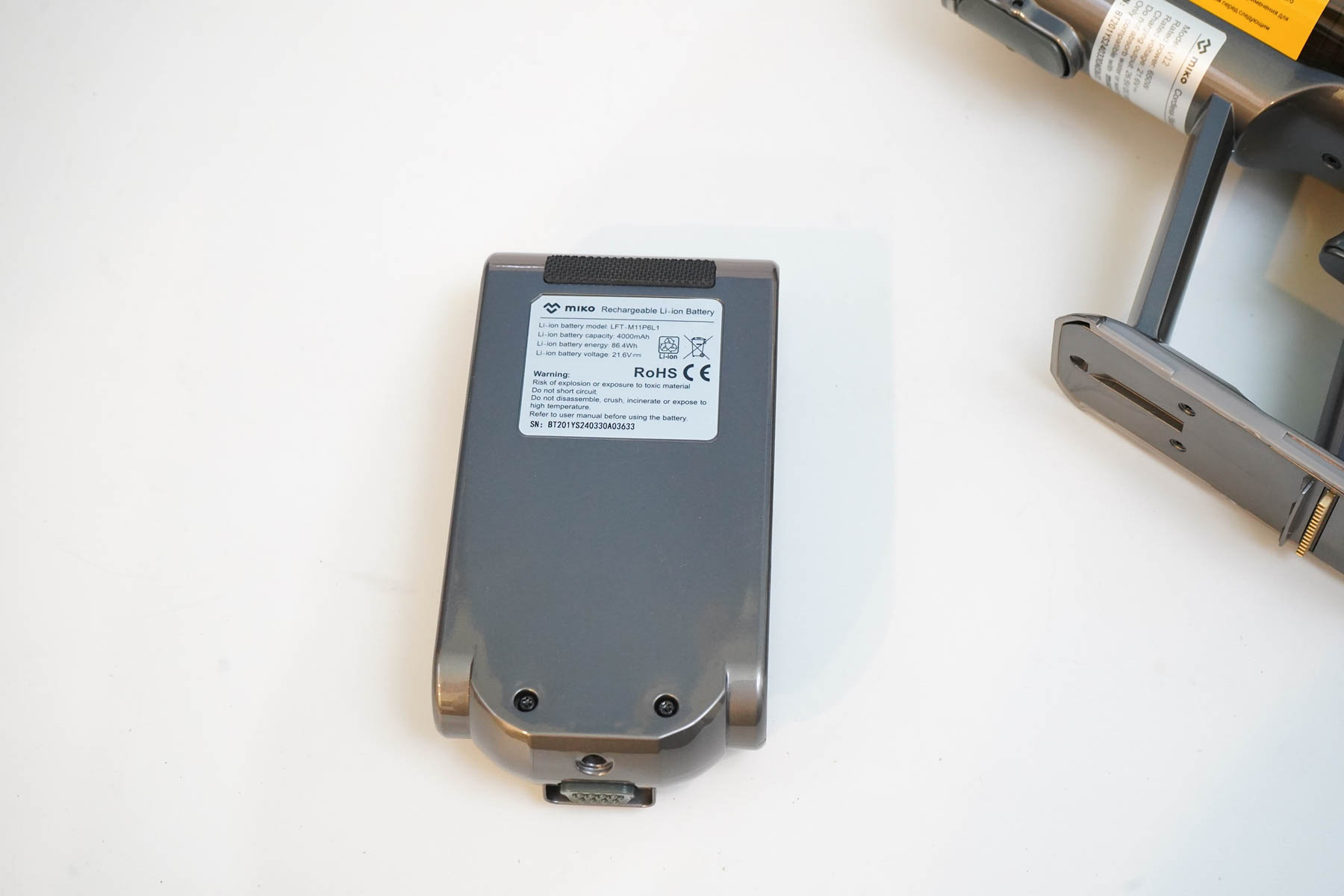 Работает пылесос Miko V12 от аккумуляторной батареи. Это 6S однорядная сборка (6 элементов 21700 по 3.7 Вольта). Заявленная ёмкость батареи составляет 86.4 Втч или 4000 мАч. Заряжается от сетевого адаптера, который подключается непосредственно к батарее. Отмечу, что батарея выполнена в виде съемного слайдера. В насадках, включая узкую насадку и адаптер-конвертер, предусмотрена пара электрических штыревых контакта. Такое решение обеспечивает питание насадок, работу двигателя в основной насадке, а также работу подсветки зоны уборки.