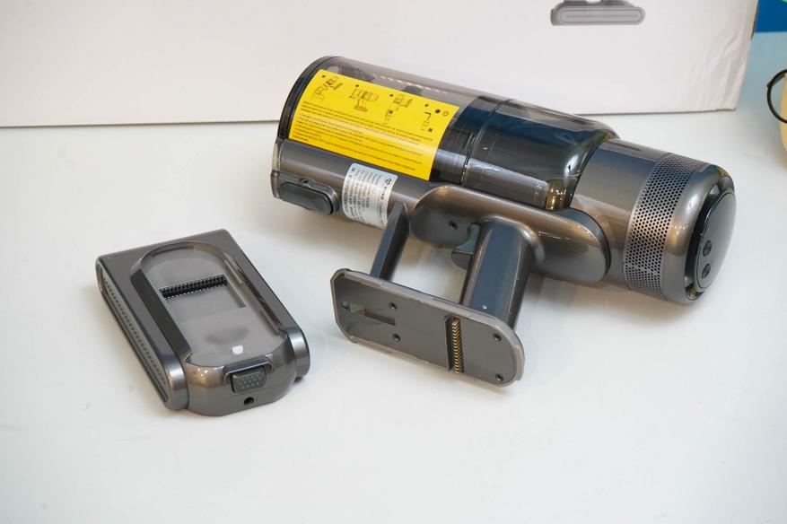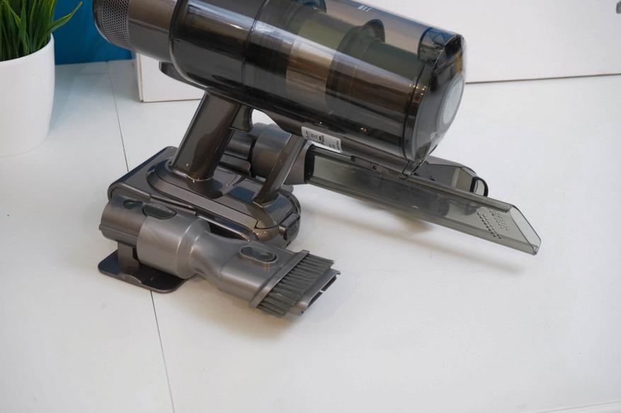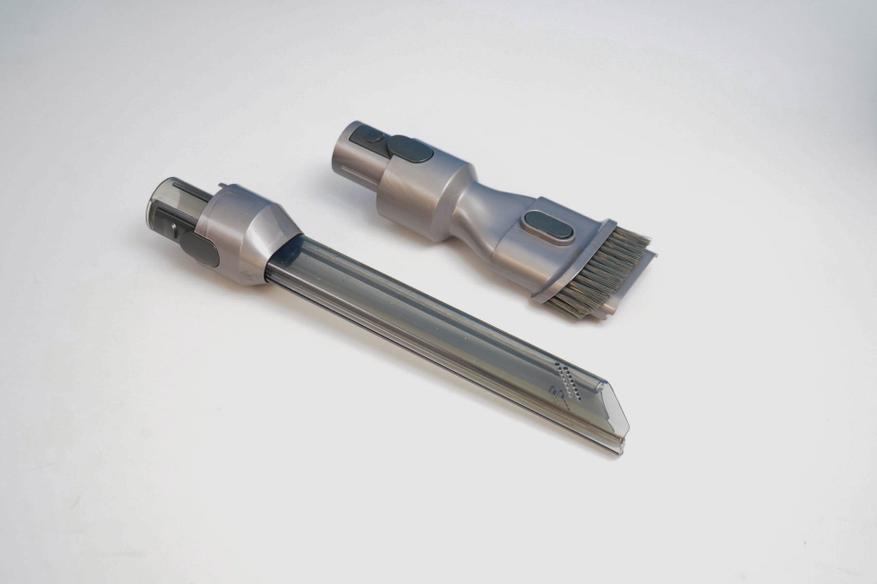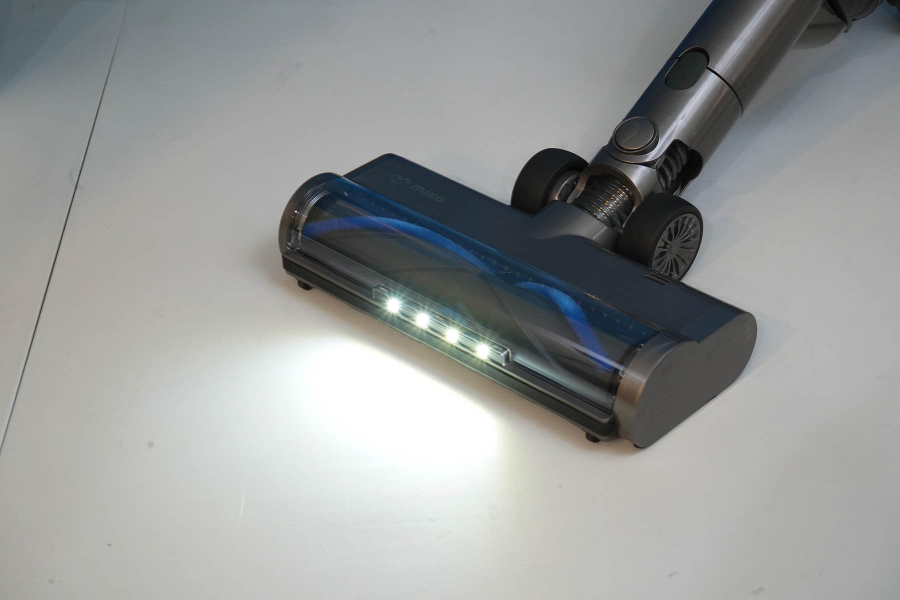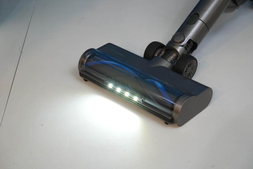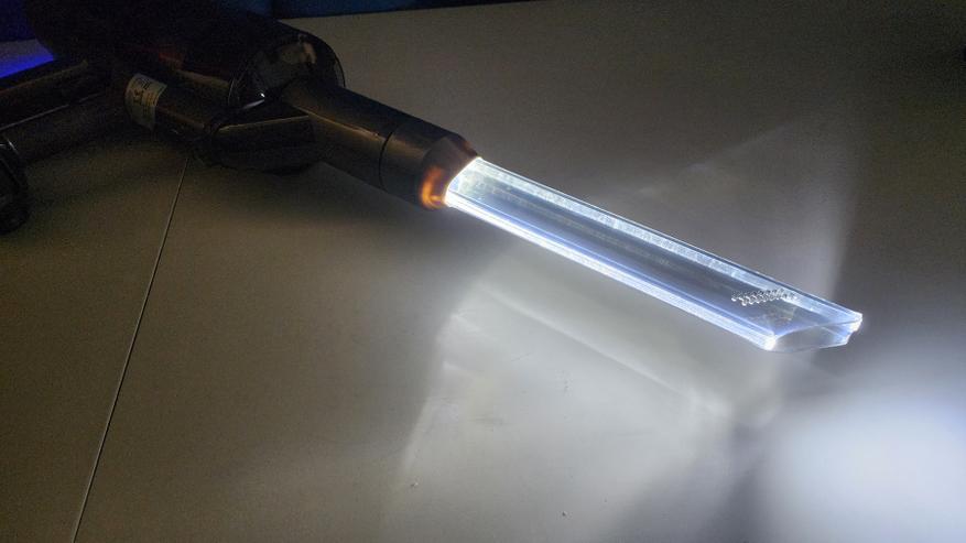 Основная насадка оснащена светодиодной линейкой — практически у самого основания корпуса расположены четыре ярких светодиода. Они работают во время уборки, а лучи света, направленные практически горизонтально поверхности, показывают пропущенный (или еще не убранный) мусор и пыль, выделяя их. Стоит отметить, что в комплекте с Miko V12 имеется еще одна насадка с функцией подсветки. Это узкая насадка для труднодоступных мест. Насадка выполнена из прозрачного пластика, а светодиодная подсветка расположена в основании — у коннектора, таким образом, что весь корпус насадки работает как световод.