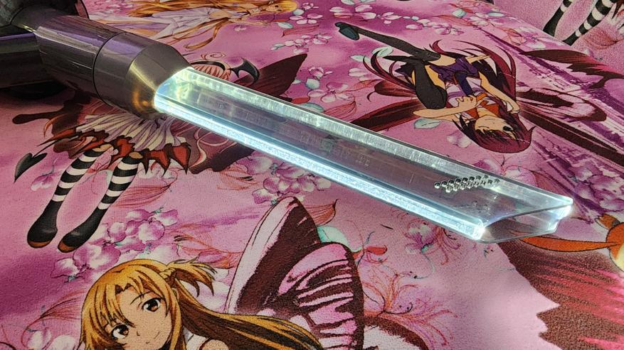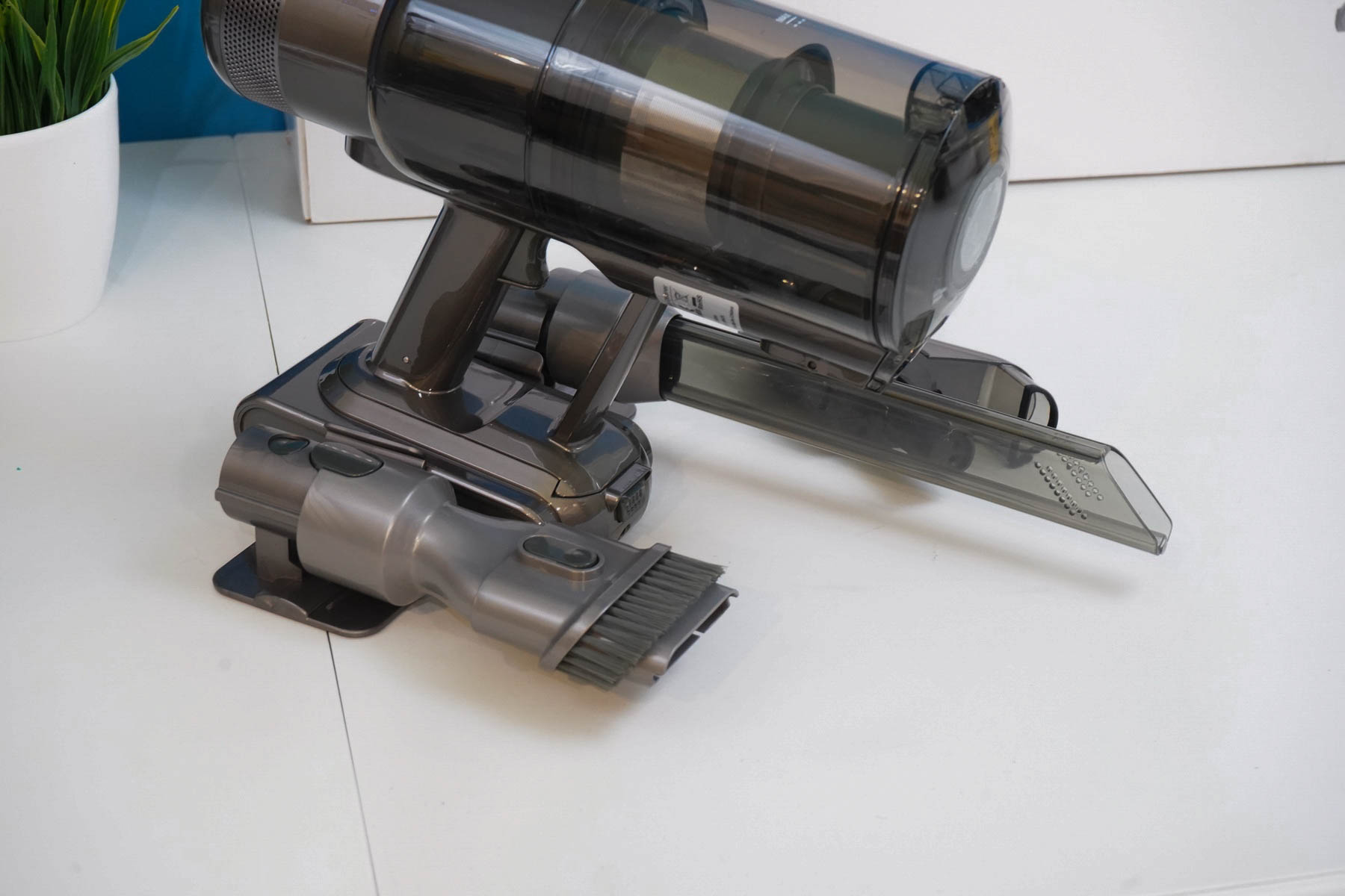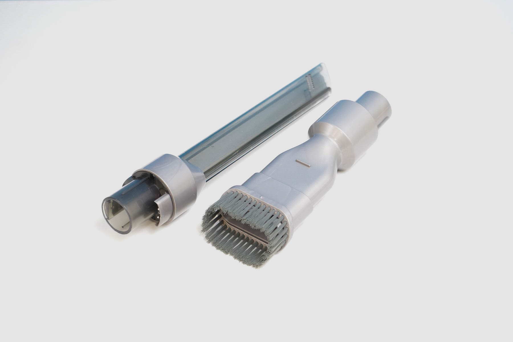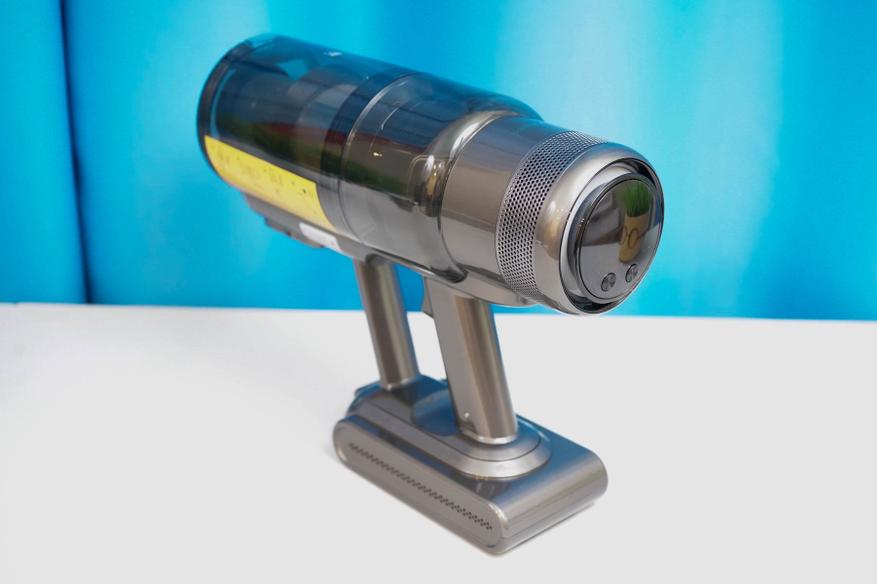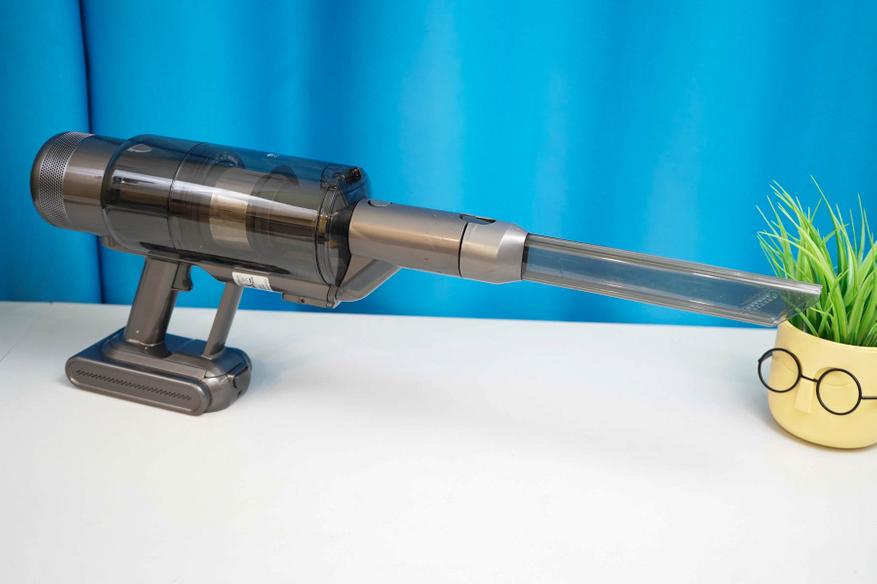 Основная насадка оснащена светодиодной линейкой — практически у самого основания корпуса расположены четыре ярких светодиода. Они работают во время уборки, а лучи света, направленные практически горизонтально поверхности, показывают пропущенный (или еще не убранный) мусор и пыль, выделяя их. Стоит отметить, что в комплекте с Miko V12 имеется еще одна насадка с функцией подсветки. Это узкая насадка для труднодоступных мест. Насадка выполнена из прозрачного пластика, а светодиодная подсветка расположена в основании — у коннектора, таким образом, что весь корпус насадки работает как световод.