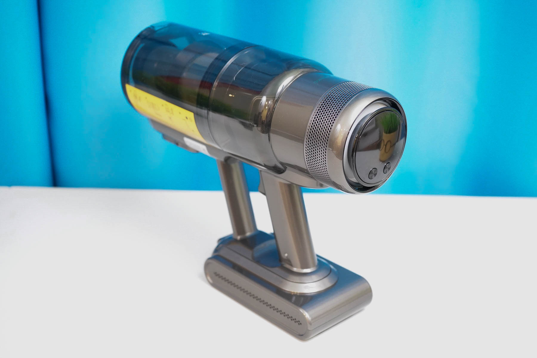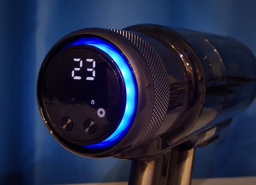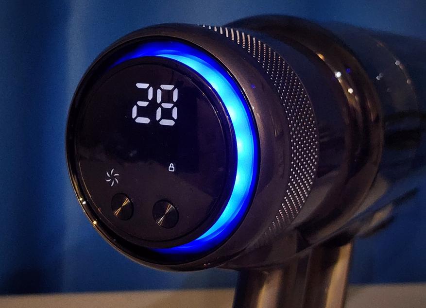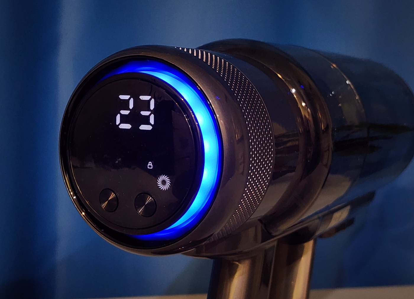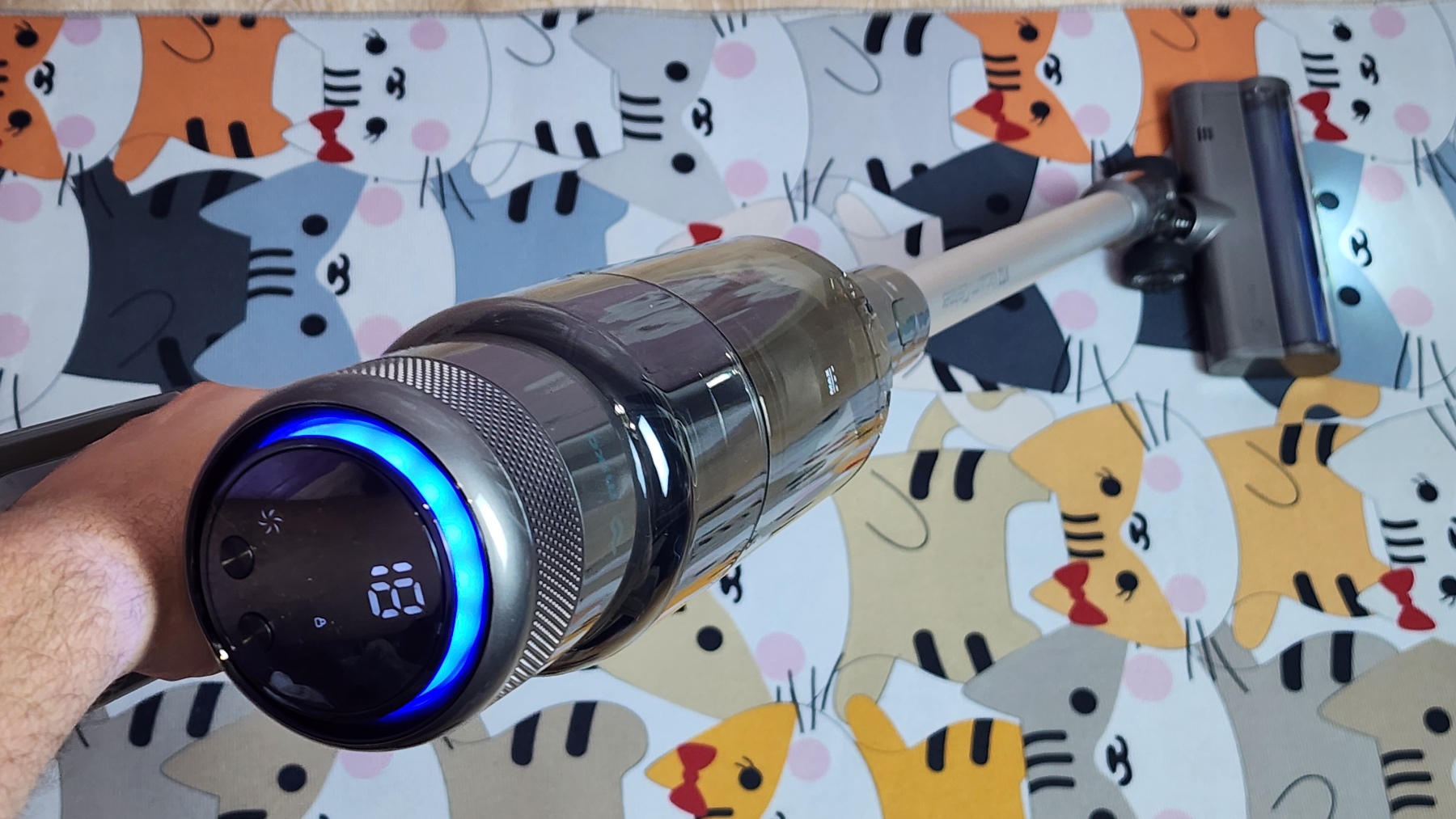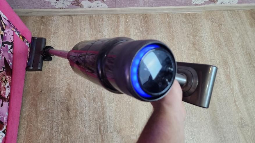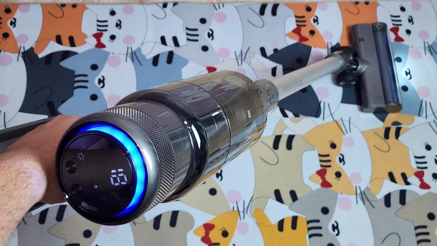 Дисплей и кнопки располагаются на торце корпуса, обращенном к пользователю. Это аккуратная глянцевая поверхность с двумя кнопками, кольцевым светодиодным индикатором и сегментным дисплеем. Значками отображаются три уровня мощности всасывания, цифрами — уровень заряда. Предусмотрены индикаторы для ошибок, например, при срабатывании защиты двигателя или роликовой щетки. Левая кнопка обеспечивает переключение режимов работы, а правая — фиксацию пылесоса во включённом состоянии (без необходимости постоянно удерживать кнопку пуска) при длительной уборке.