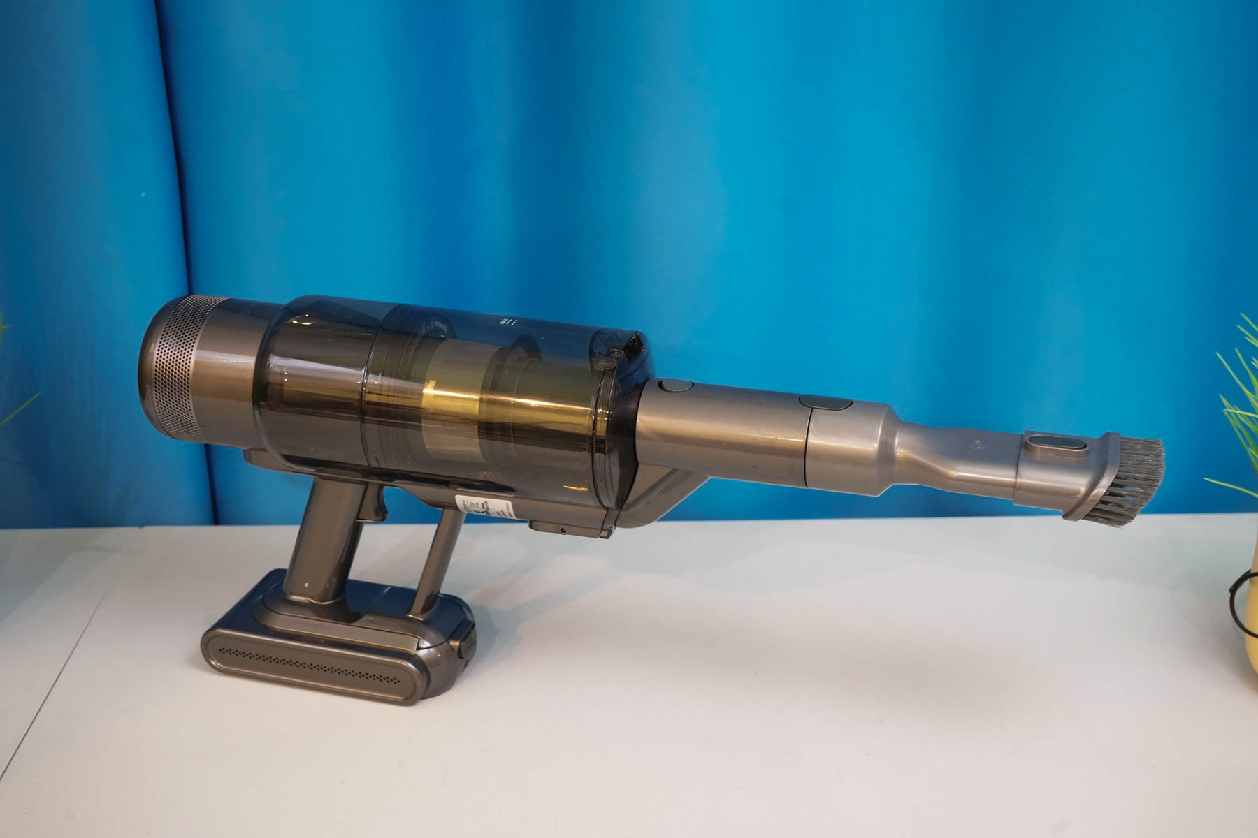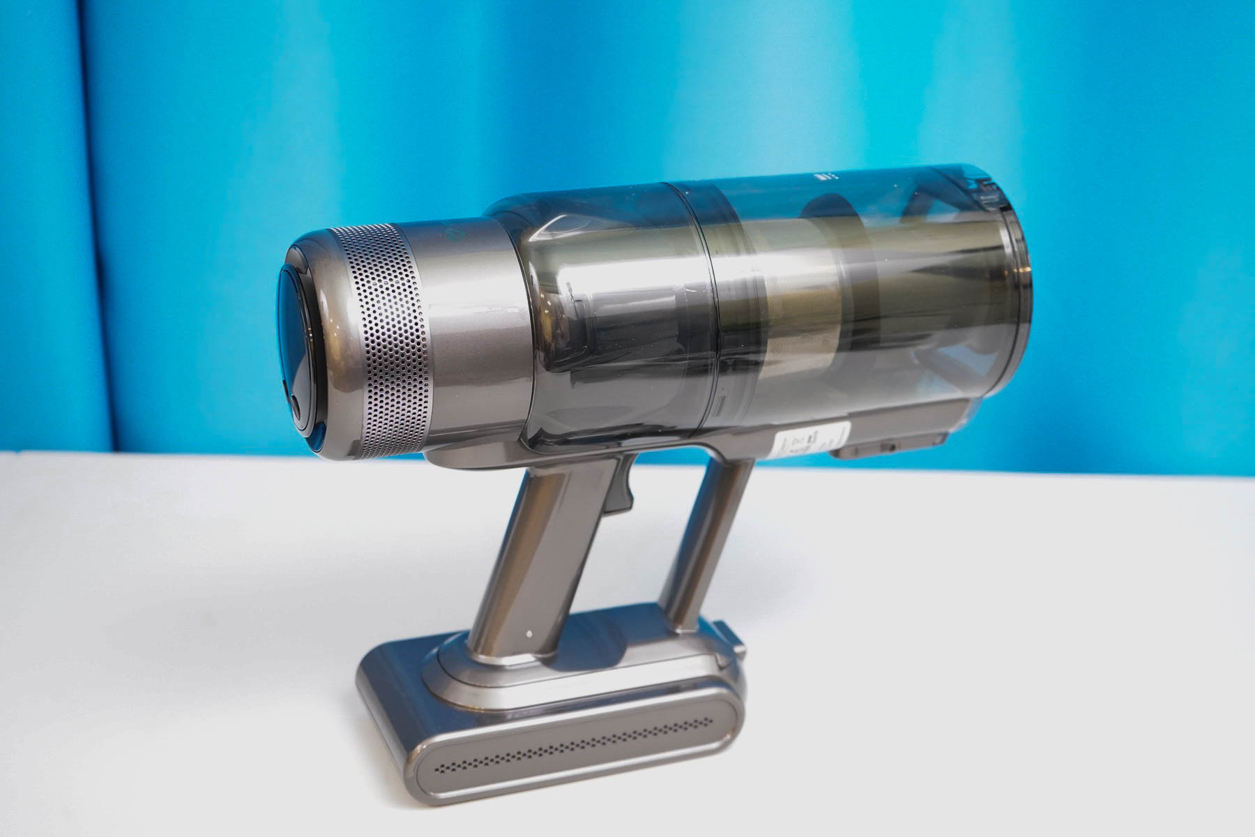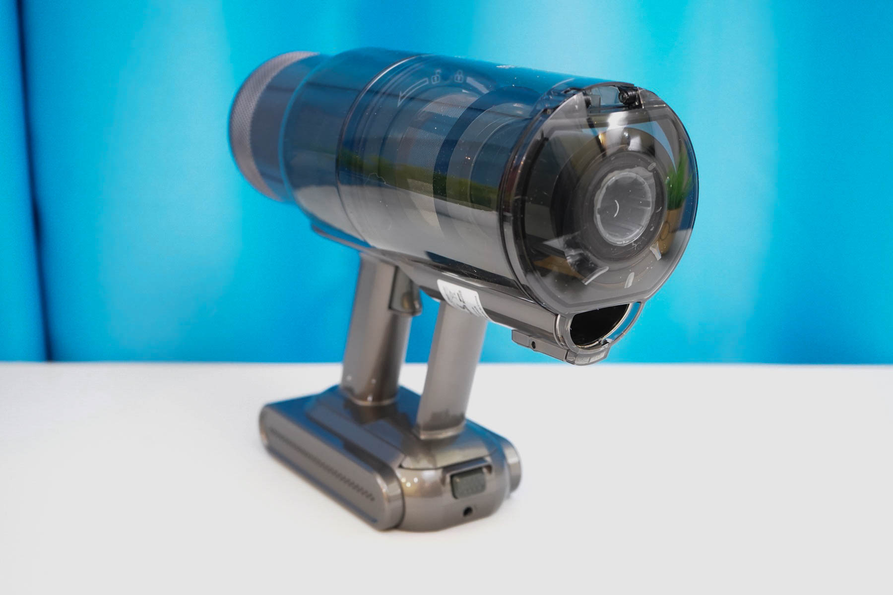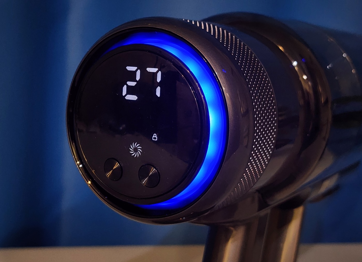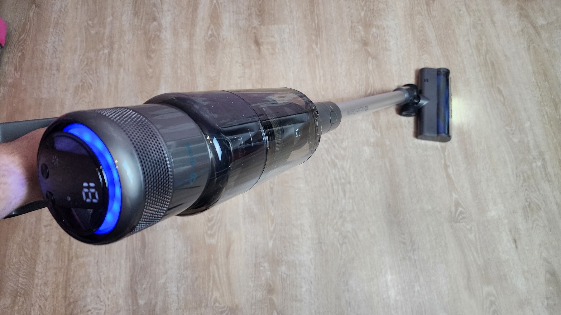Дисплей и кнопки располагаются на торце корпуса, обращенном к пользователю. Это аккуратная глянцевая поверхность с двумя кнопками, кольцевым светодиодным индикатором и сегментным дисплеем. Значками отображаются три уровня мощности всасывания, цифрами — уровень заряда. Предусмотрены индикаторы для ошибок, например, при срабатывании защиты двигателя или роликовой щетки. Левая кнопка обеспечивает переключение режимов работы, а правая — фиксацию пылесоса во включённом состоянии (без необходимости постоянно удерживать кнопку пуска) при длительной уборке.