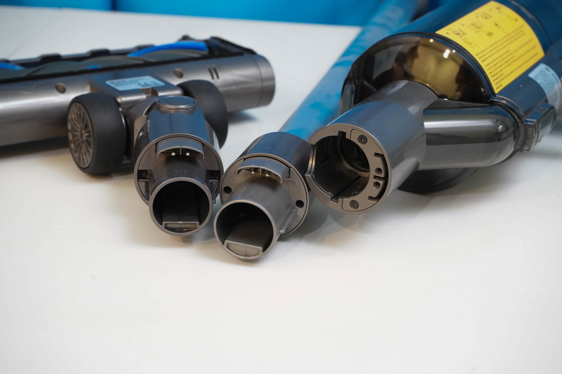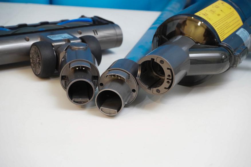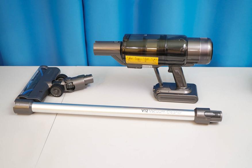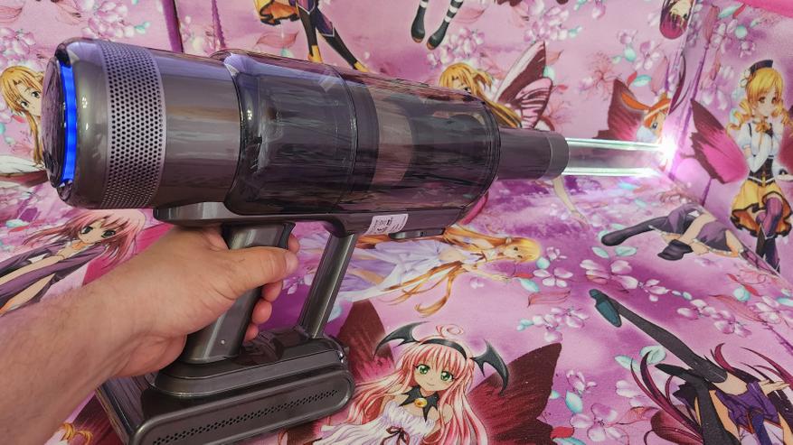 Внешний вид пылесоса Miko V12 производит легкое футуристическое впечатление. Обводы корпуса напоминают то ли ракету, то ли космический корабль. Особенно усиливается впечатление при работе светодиодного дисплея с кольцевой подсветкой. Отмечу небольшой наклон ручки, позволяющий с комфортом проводить уборку, без излишнего напряжения кисти. Да и сам по себе корпус пылесоса лёгкий. Для простоты подключения и для снижения размеров корпуса пылесоса стыковка насадок производится через адаптер-конвертер. Сначала собираются насадки (при необходимости — с трубкой), а затем соединяются через этот конвертер, также обеспечивающий и электрическое питание насадок.