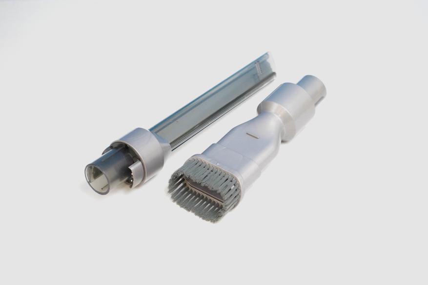 Пара слов про дополнительные насадки из комплекта. Вместе с пылесосом вы найдете алюминиевую трубку, которая позволяет проводить уборку, не наклоняясь к полу, и которая позволяет работать с дополнительными насадками. А также сами насадки:
