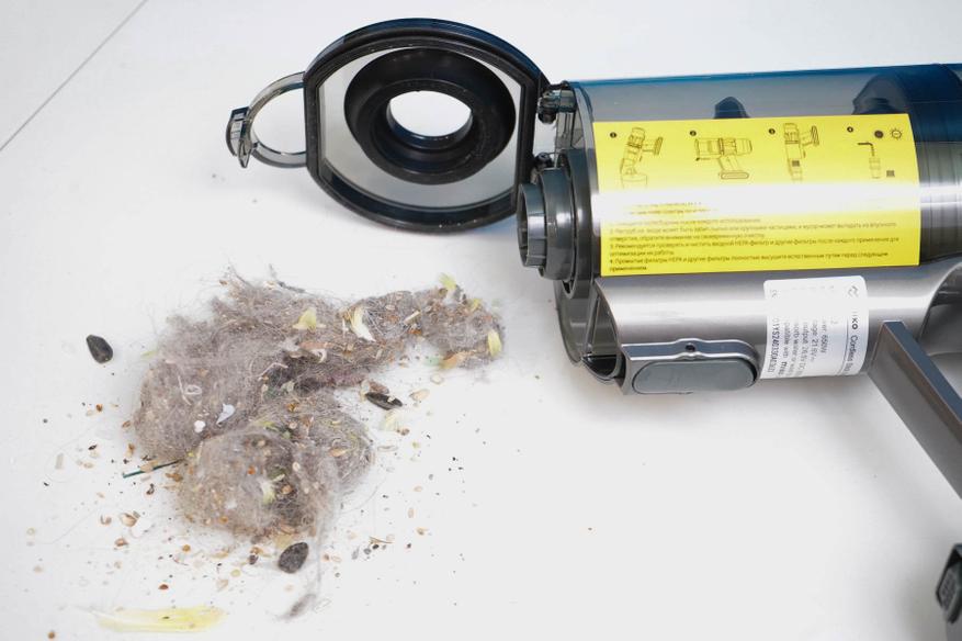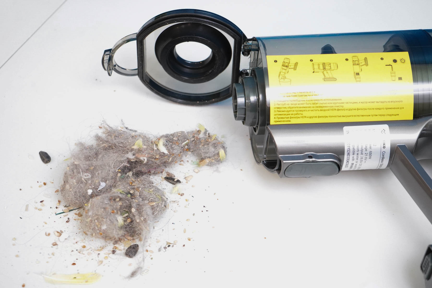 После уборки отстыковываем удлинитель-трубку и сбрасываем мусор в ведро или пакет. Для этого касаться мусора не требуется — просто нажимаем кнопку открытия крышки колбы и вытряхиваем все. А вот раз в период осматривайте ролики на предмет застрявшего мусора и прочищайте фильтры (их можно промывать).