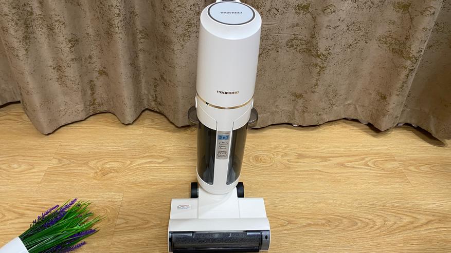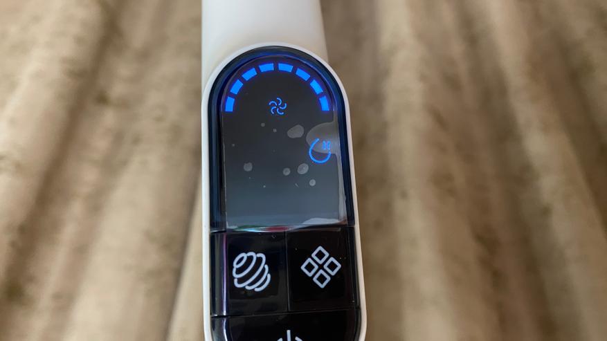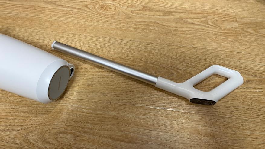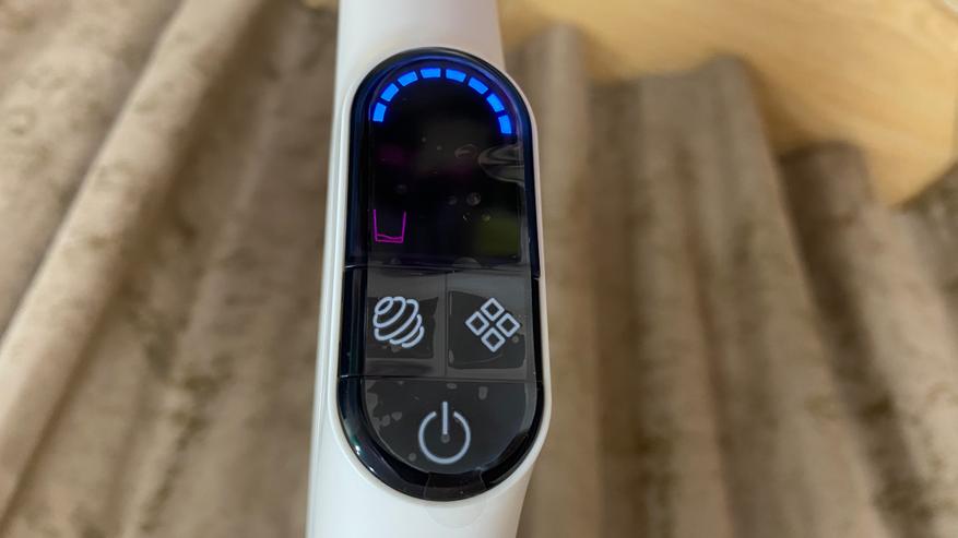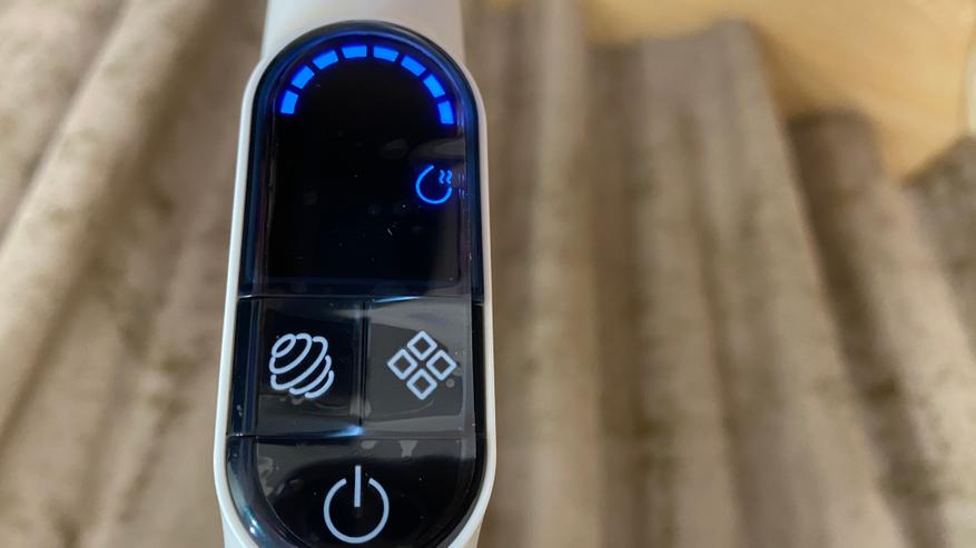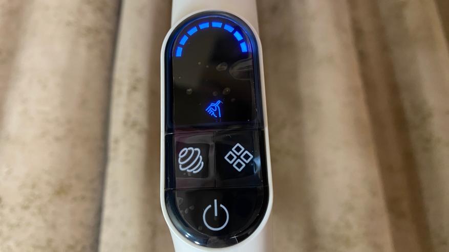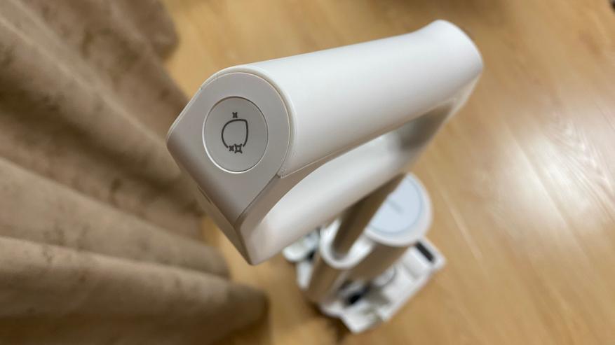 Всё управление выведено на удлинительную ручку. На задней части имеется механическая кнопка для включения режима самоочистки (включается только после установки пылесоса на станцию). На лицевой части расположен дисплей, на котором отображается процесс уборки и выбранный режим. Под дисплеем находятся три кнопки: кнопка отключения/включения, кнопка для включения и отключения голосового уведомления — она же используется для выбора режима, кнопка для изменения силы всасывания. На дисплее отображаются: индикатор режима «турбо», индикатор влажной уборки, индикатор режима сухой уборки, индикатор отсутствия воды, индикатор включения самоочистки, индикатор заполненного бага для грязной воды и мусора. Все индикаторы имеют синею подсветку, которую отлично видно как ночью, так и днем, даже при прямом солнечной свете.