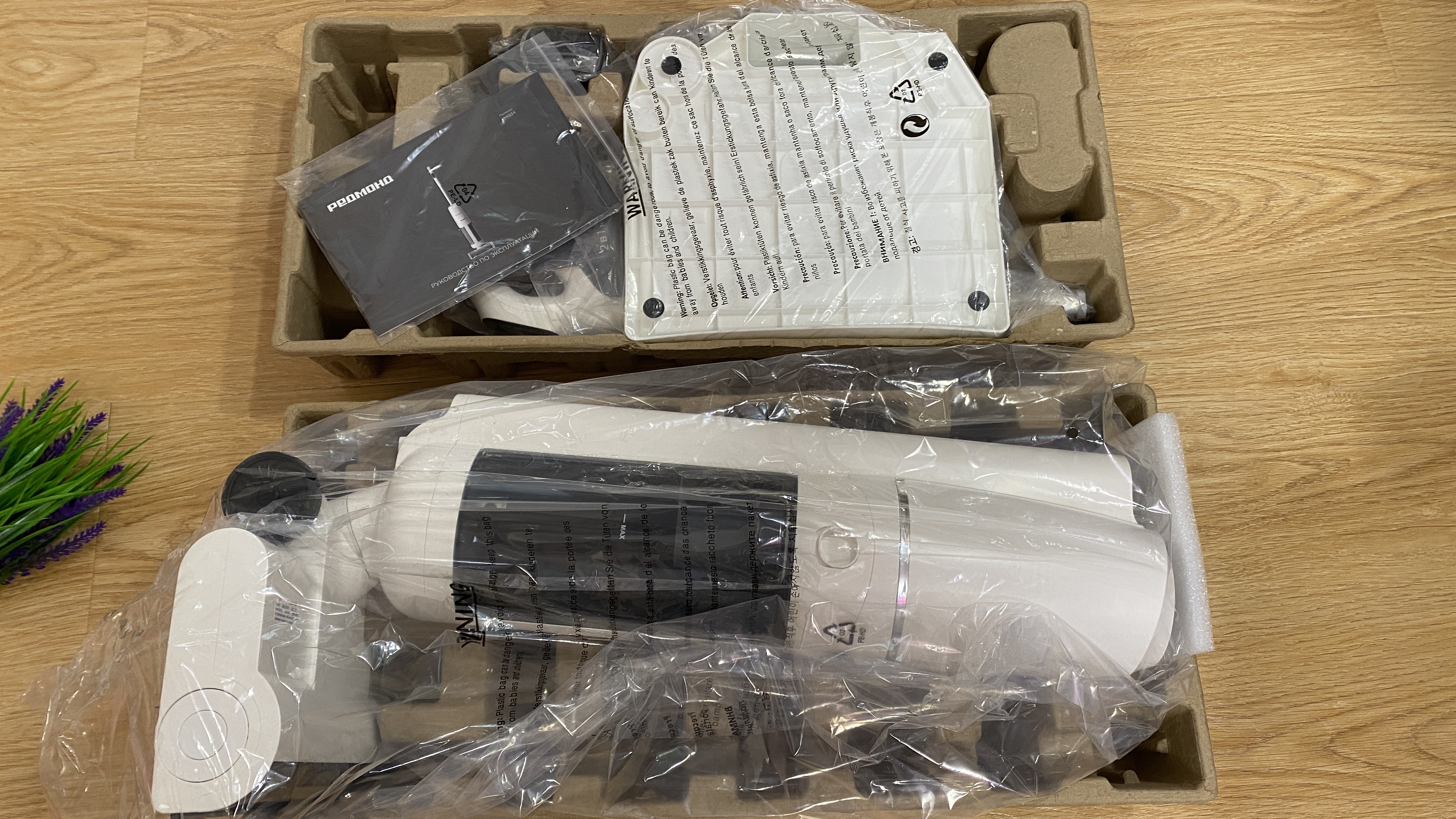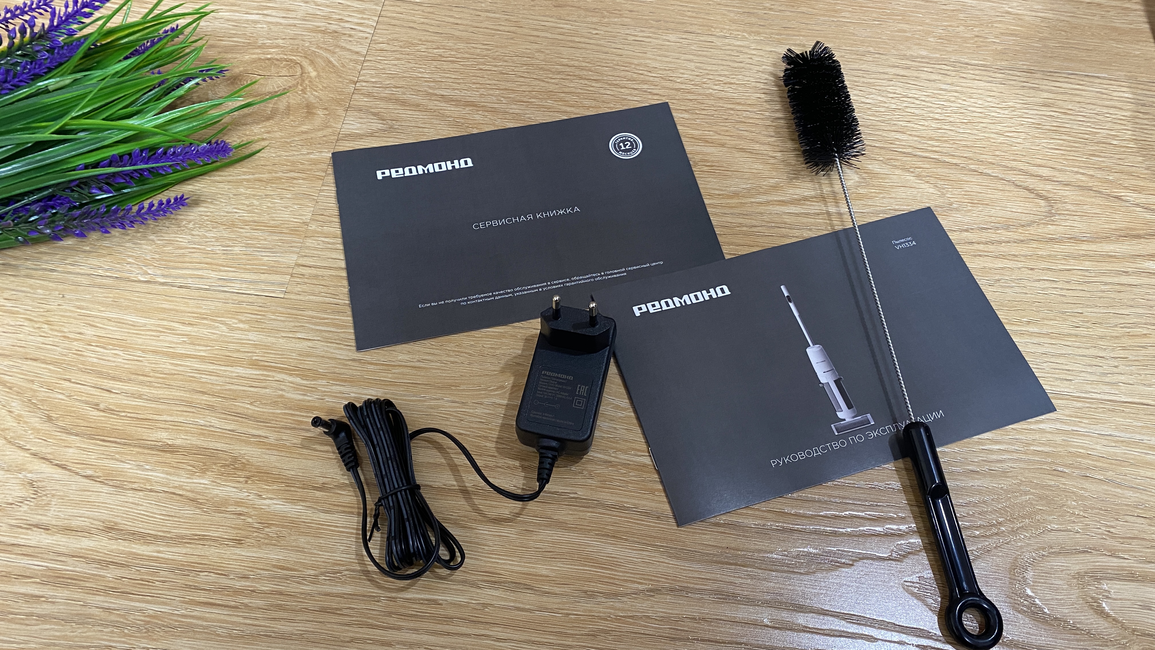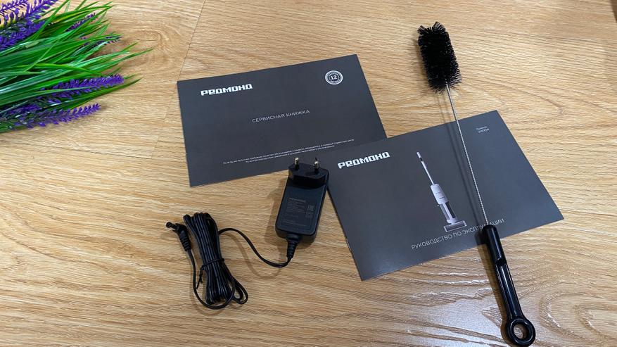 Комплектация довольно скромная и в неё входит: моющий аккумуляторный пылесос РЕДМОНД MultiClean VH1334, гарантийный талон, руководство по использованию, поддон-база для самоочистки и зарядки, удлинительная ручка, ершик, блок питания, сервисная книжка.