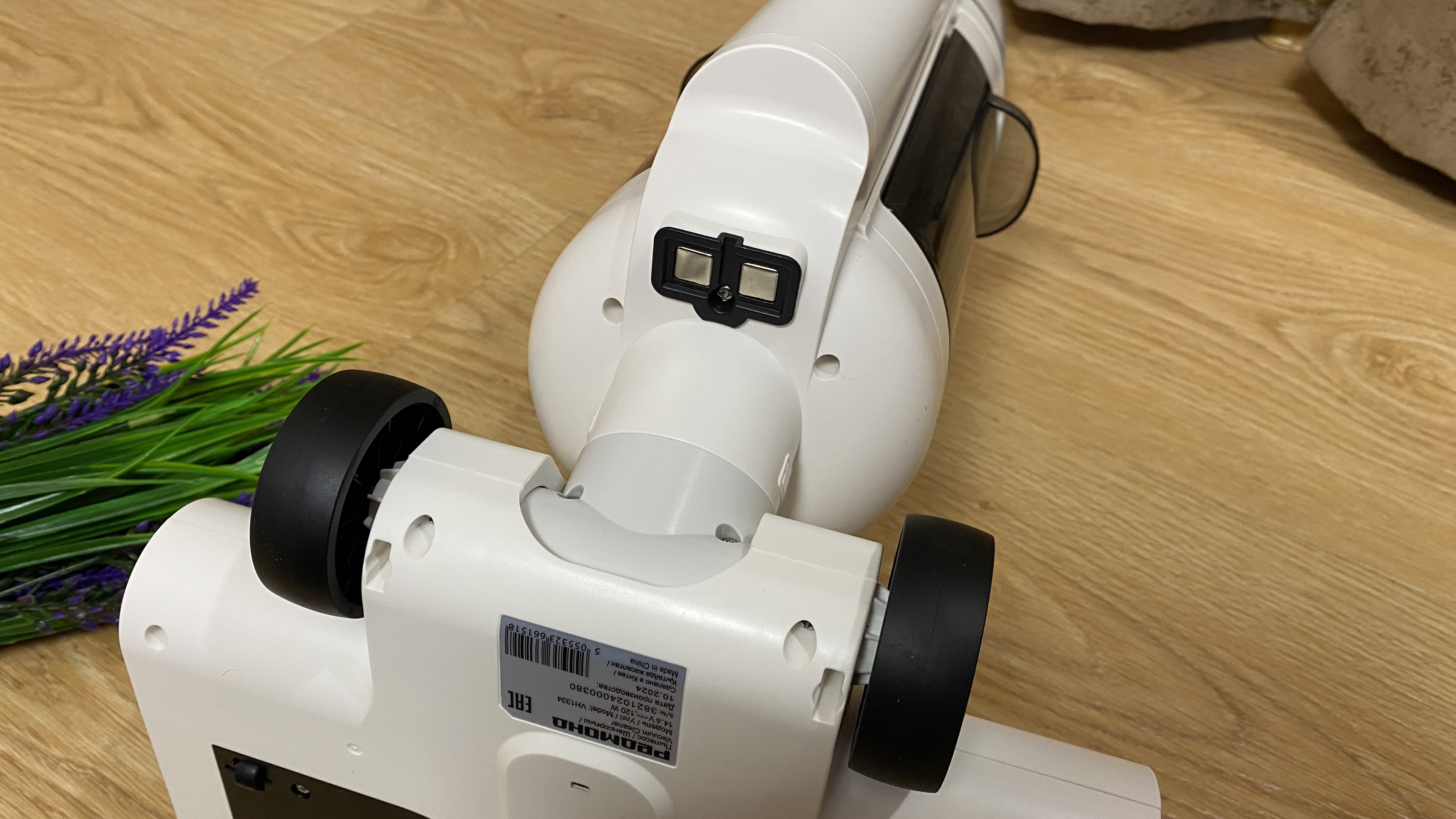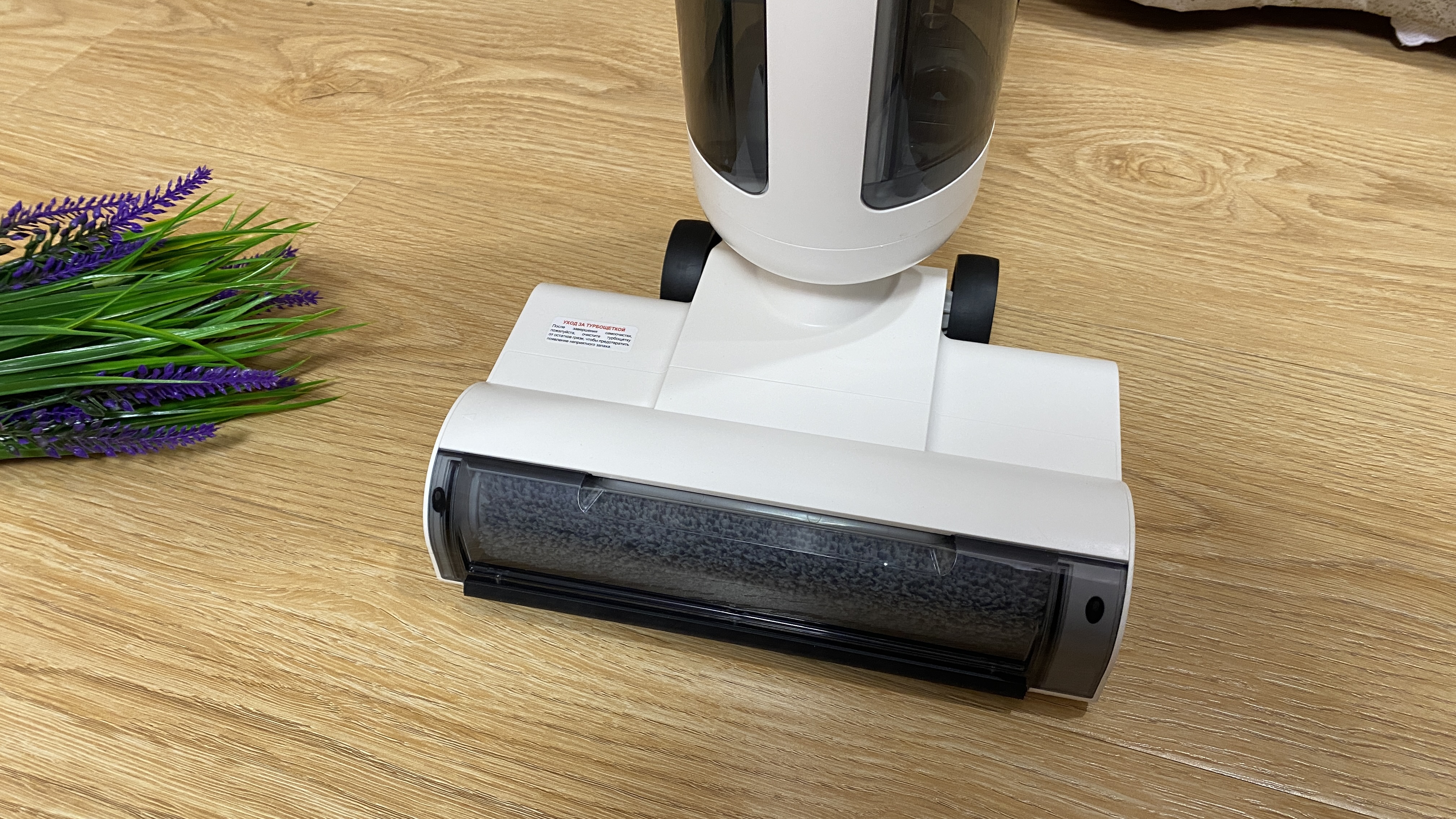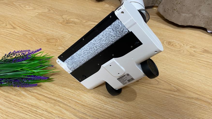 В нижней части находится турбощетка. Валик съемный и выполнен из микрофибры, которая максимально эффективно убирает загрязнения и хорошо осуществляет процесс влажной уборки. Если снять валик, то под ним можем увидеть отверстия (форсунки), через которые и подается чистая вода из контейнера для влажной уборки и во время процесса самоочистки. Для того чтобы пылесос беспроблемно перемещался по любой поверхности на нижней части имеются 2 больших колесика и 2 маленьких ролика. Контактная группа также расположена на нижней части. Для того чтобы извлечь валик, необходимо нажать на центральную части корпуса и замок откроется (весьма удобный и практичный замок, без лишних проблем). За удобство во время уборки отвечает шарнирное крепление, благодаря которому пылесос может продолжать уборку при наклоне от 30 до 90 градусов. На передней части имеется только пластиковая прозрачная крышка, через которою хорошо виднеется валик. Светодиодной подсветки для освещения зоны уборки к сожалению нет.