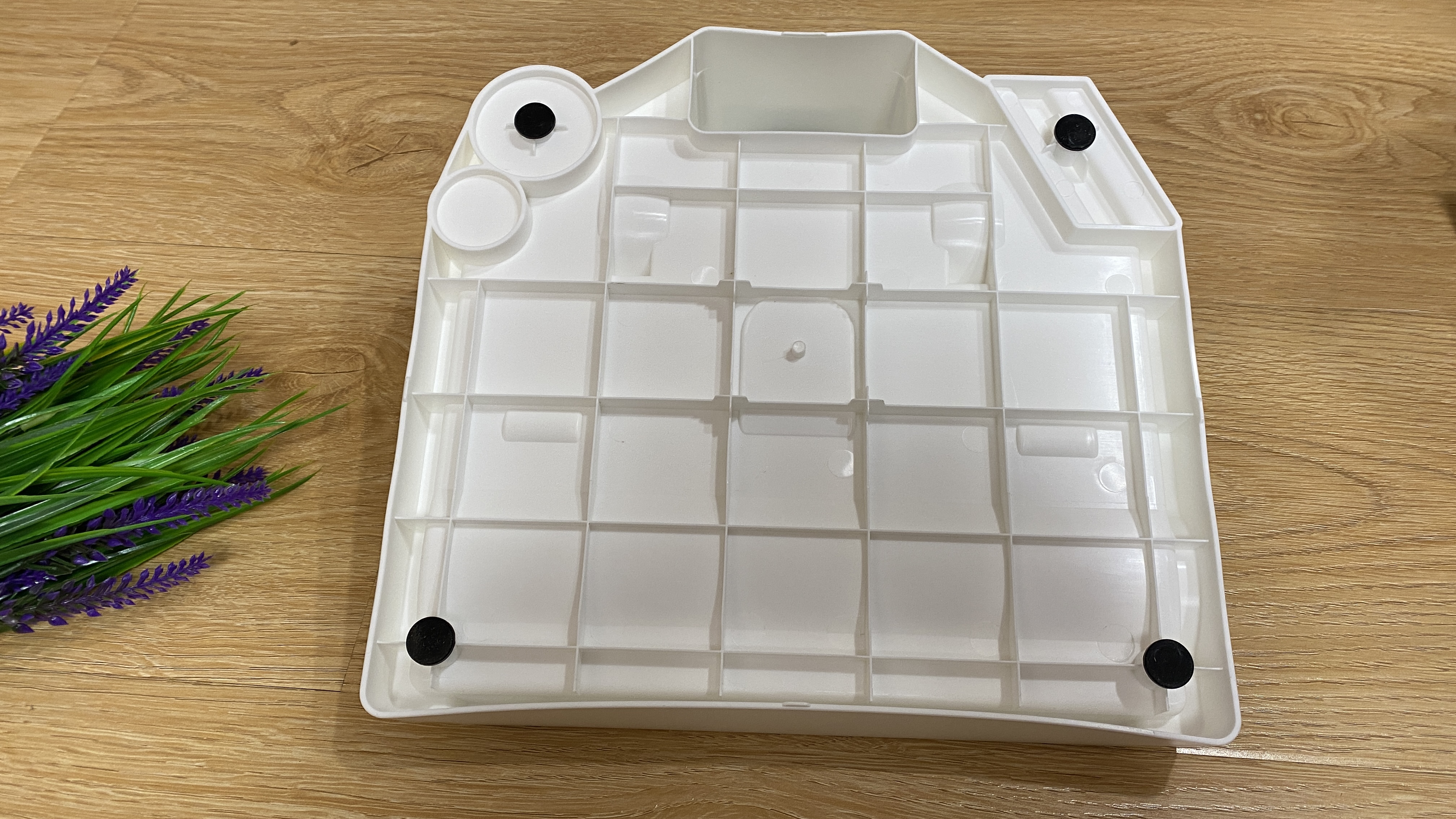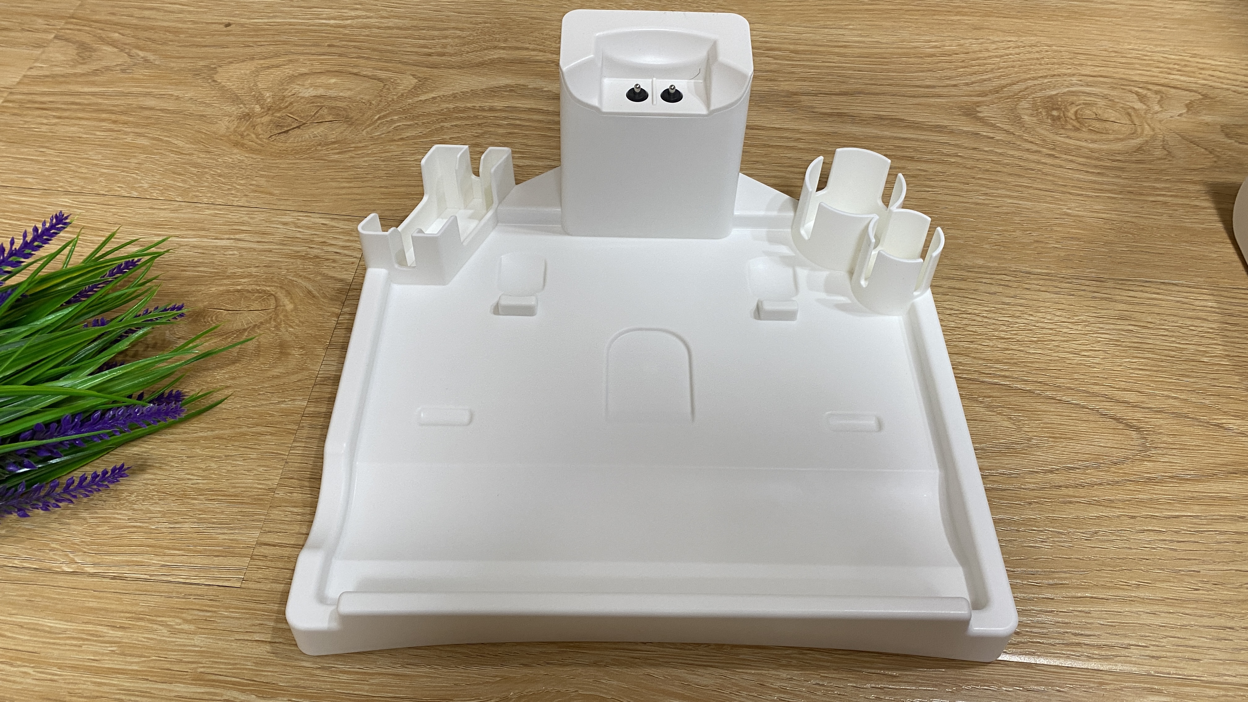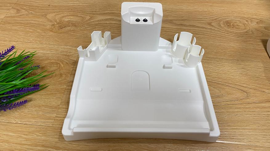 База для зарядки и самоочистки полностью выполнена из пластика белого цвета. На верхней части можем увидеть контакты для зарядки, а также несколько держателей для аксессуаров. Для предотвращения скольжения по напольному покрытию, на нижней части имеется четыре резиновых ножки. Блок питания подключается к станции самоочистки/зарядки в задней части. Для осуществления очистки, производитель любезно положил длинный ёршик, которым можно удалить загрязнения из шахты мусоросборника. В руководстве по использованию, пользователь может найти много полезной информации не только по процессу уборки, но и для предотвращения нежелательных поломок.