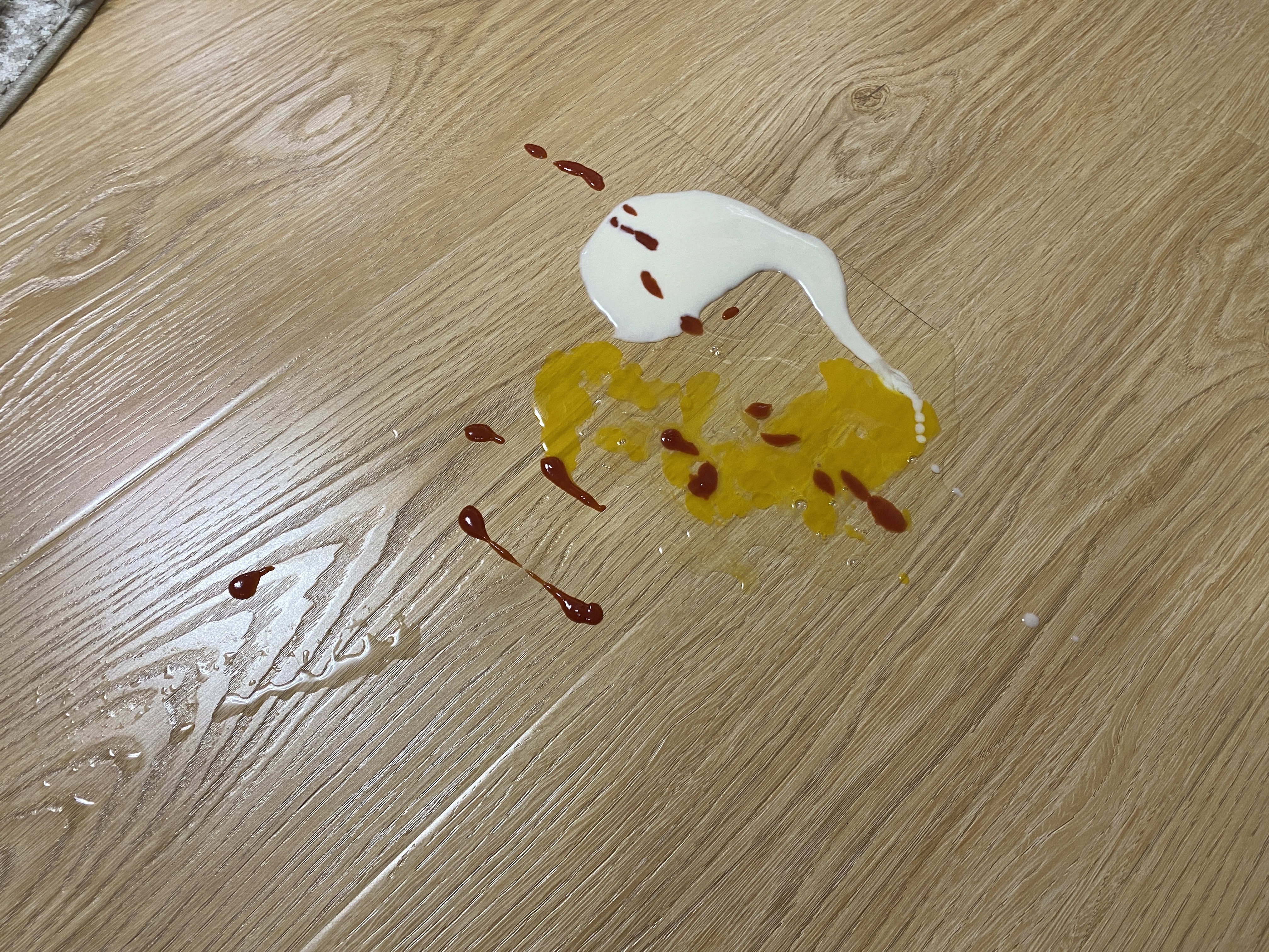 Для того, чтобы затестить все возможности моющего аккумуляторного пылесоса РЕДМОНД MultiClean VH1334 попробуем усложнить задачу. На ламинат мы специально разбили сырое куриное яйцо, к нему добавили кефир и кетчуп. После уборки на ламинате не остается никаких загрязнений.