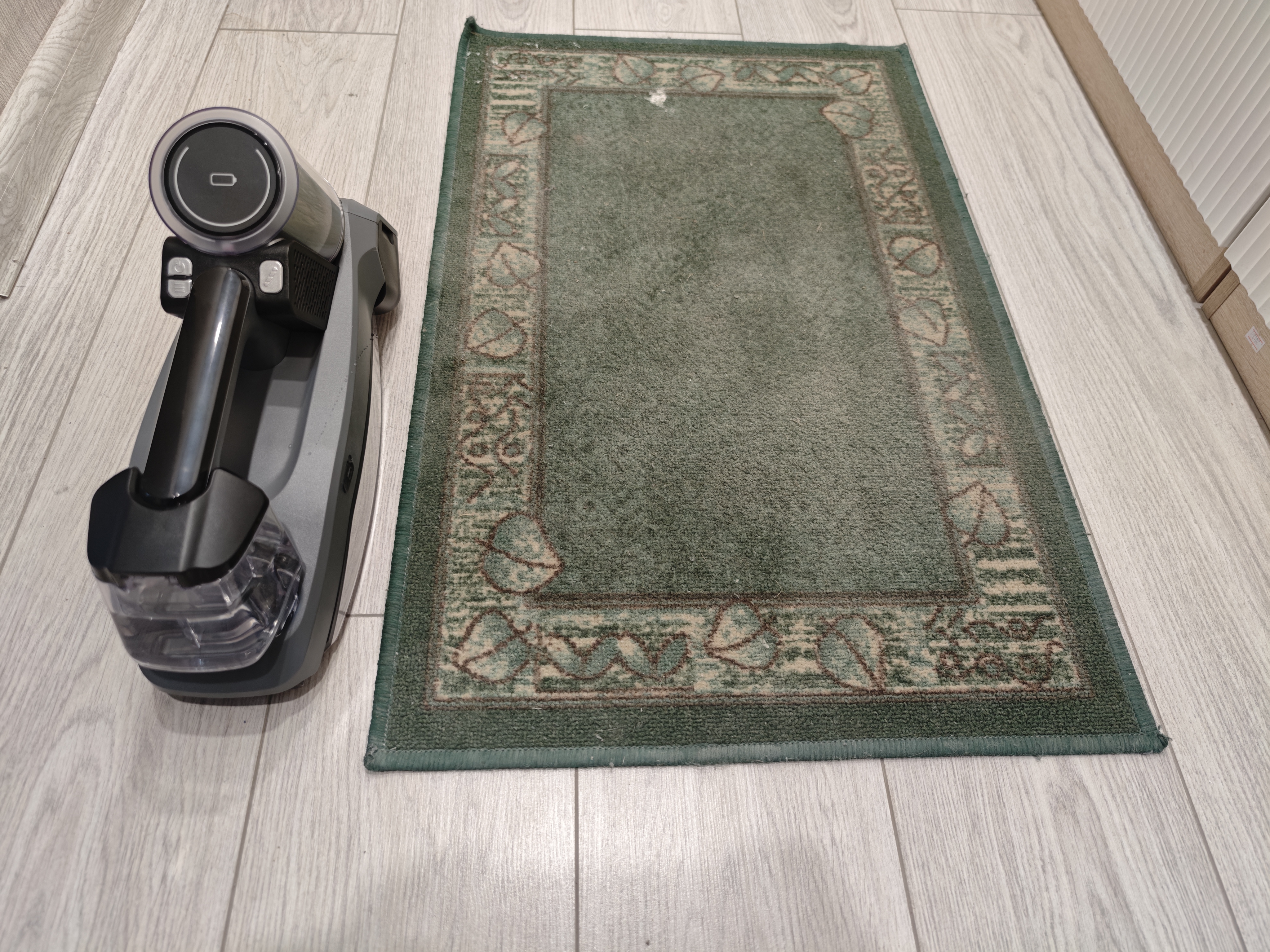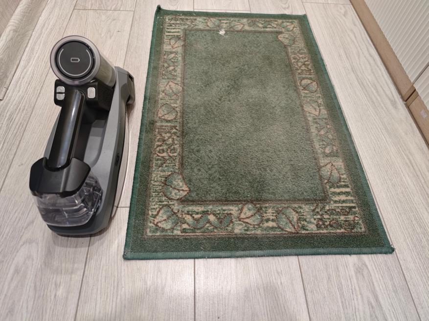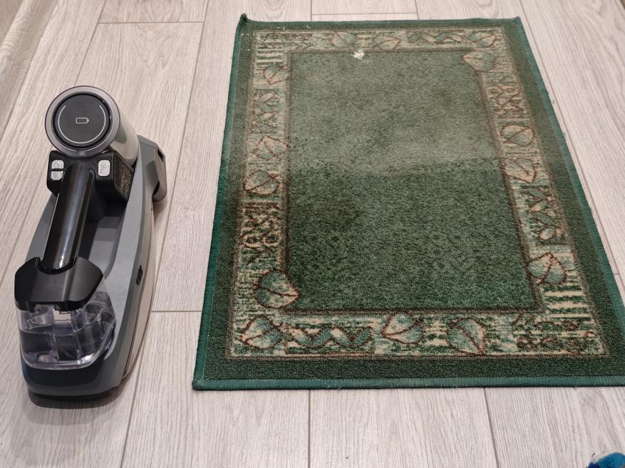 Первое, что я решил протестировать это убрать грязь с паркета на кухне. Там есть старые пятна, которые не убирались обычным пылесосом. Включил я пылесос, нажал на кнопку разбрызгивания воды и дальше начал последовательно проводить пылесосом по полу. По началу пятно не хотело уходить, но через какое-то время я справился с ним.