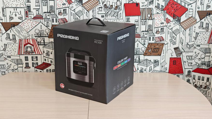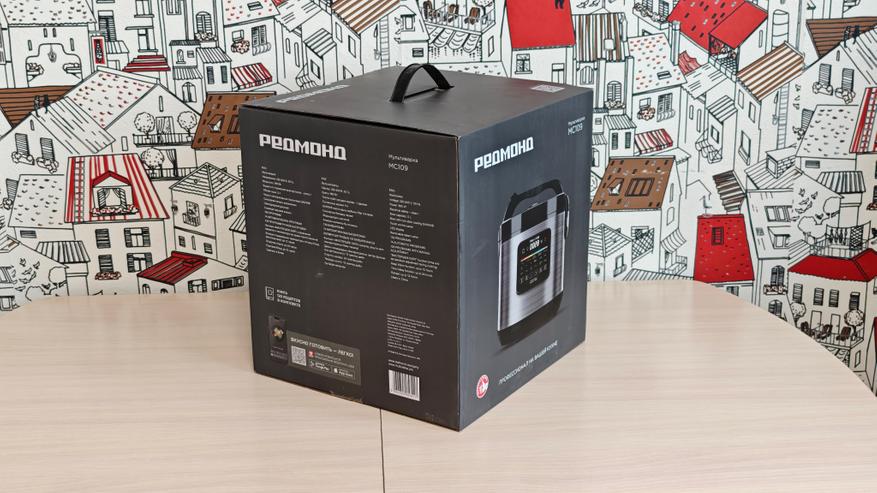 Мультиварка поставляется в прочной картонной коробке. Внутри всё надёжно зафиксировано пенопластовыми вставками, что гарантирует сохранность прибора при транспортировке. Упаковка выполнена в фирменном стиле РЕДМОНД. Она выглядит презентабельно, надёжно защищает содержимое.