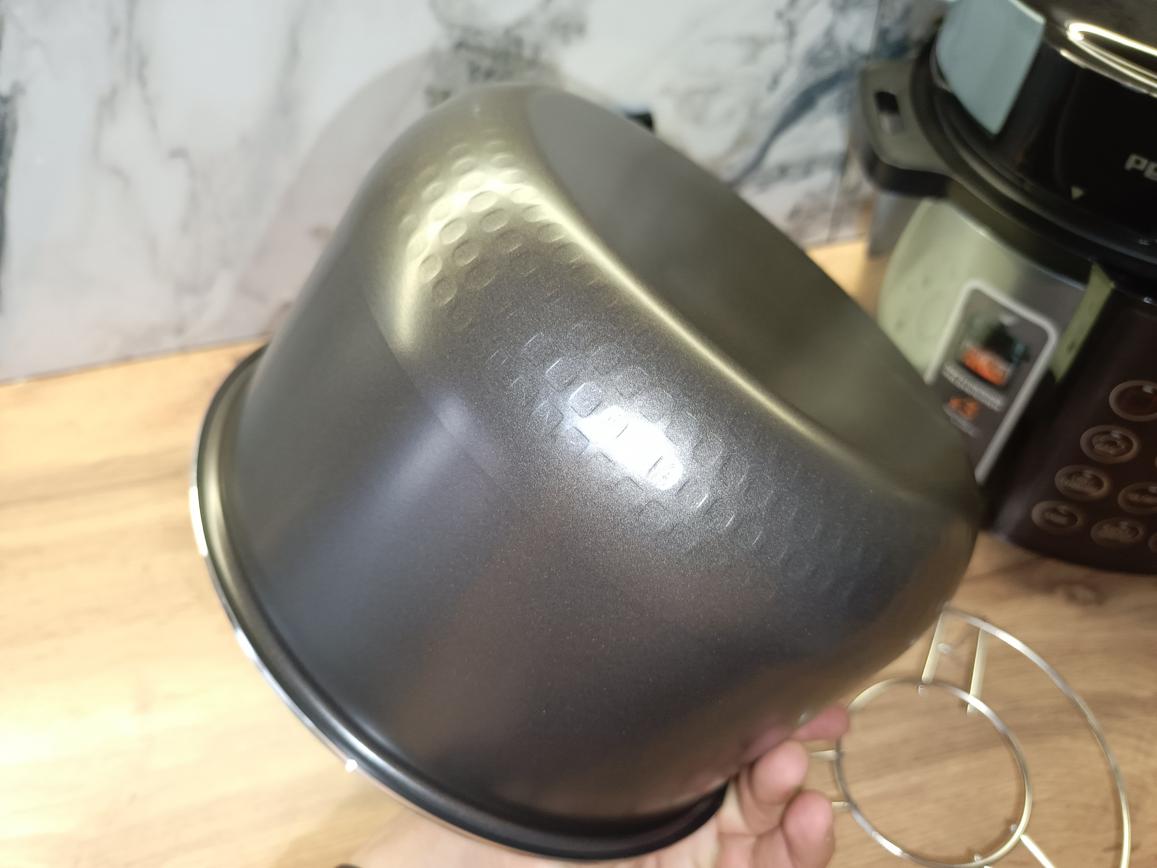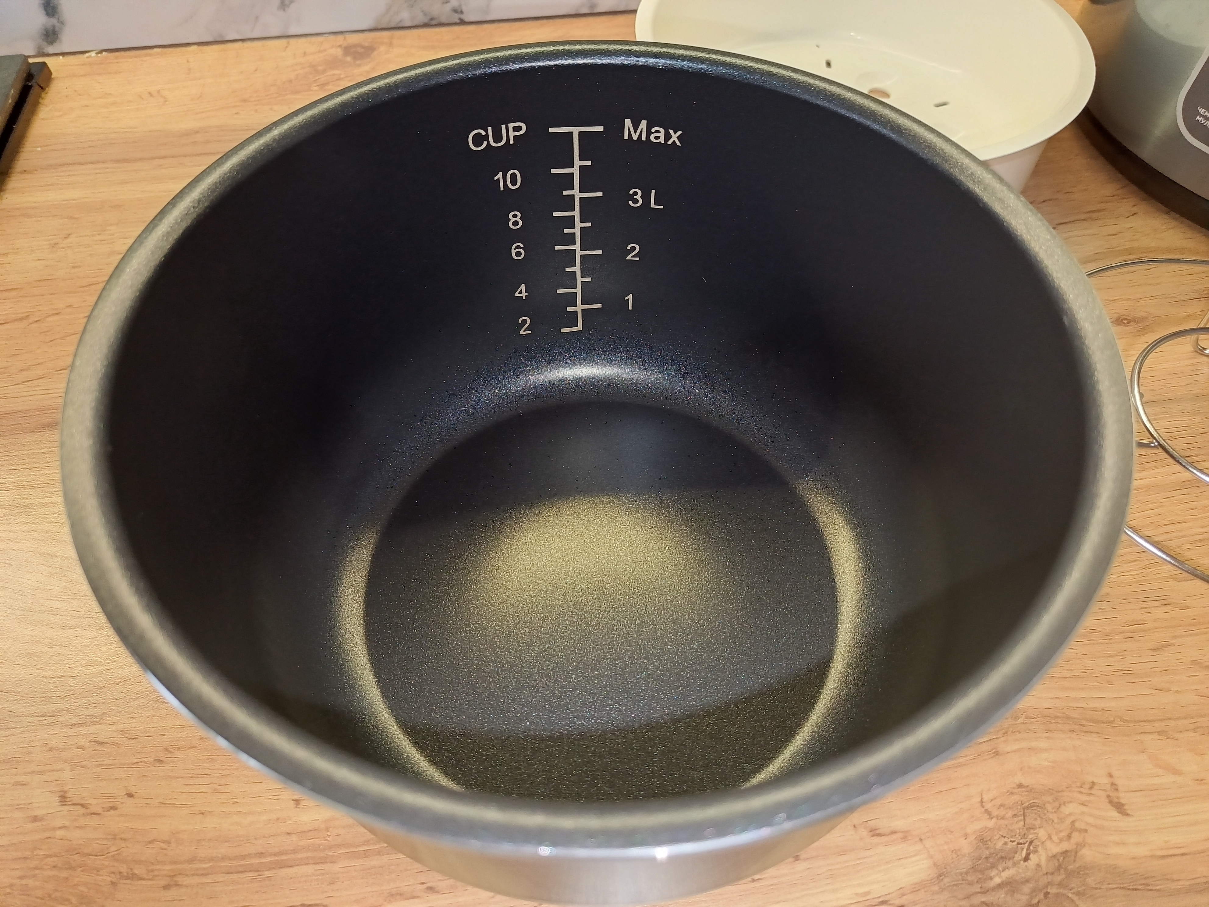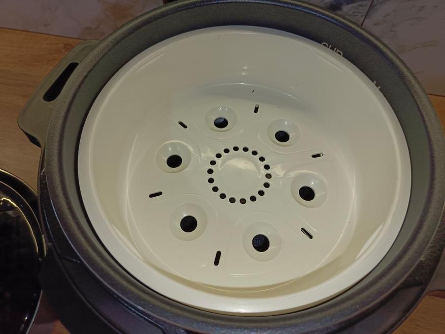 Чаша выполнена из алюминия и оснащена специальным антипригарным покрытием, которое предотвращает прилипание продуктов и облегчает последующую очистку. В целом конструкция стандартная и практически ничем не отличается от чаш, используемых в большинстве современных мультиварок. Объём и форма привычные, что делает эксплуатацию интуитивно понятной.