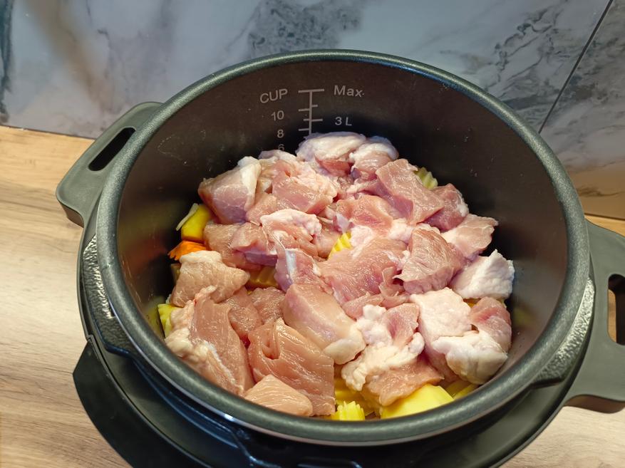 Теперь о некоторых нюансах приготовления в режиме скороварки. Первый важный момент — уменьшайте количество специй и, особенно, соли примерно в два раза по сравнению с обычным приготовлением. Например, обычно я использую 17-18 граммов соли, но здесь этого будет слишком много. Если добавить 18 граммов, блюдо получится пересоленным. Расчёт соли нужно делать исходя из общего веса продуктов: у меня общий вес составил около 2 килограммов, поэтому я добавил 20 граммов соли. Воду в расчёт обычно не берут, если её количество не превышает объём продуктов в несколько раз. Если же жидкости значительно больше (в 4-5 раз и более), тогда её тоже стоит учитывать.