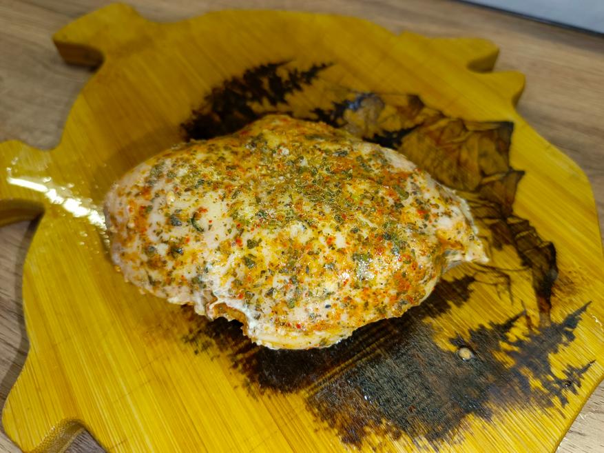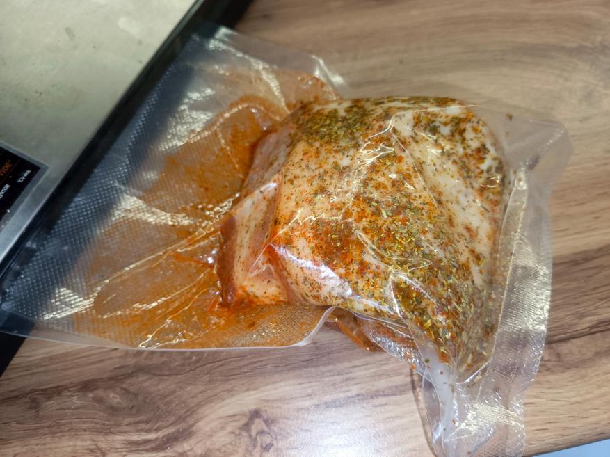 Все ингредиенты укладываем в вакуумный пакет, стараясь равномерно распределить специи по продукту, а затем вакуумируем. После этого пакет отправляется в холодильник примерно на сутки, чтобы мясо равномерно просолилось и пропиталось специями. В течение этого времени можно периодически массировать мясо. Для свинины я установил 70 °C и готовил до достижения этой температуры внутри куска, а для курицы — 65 °C, соответственно, до 65 °C внутри.