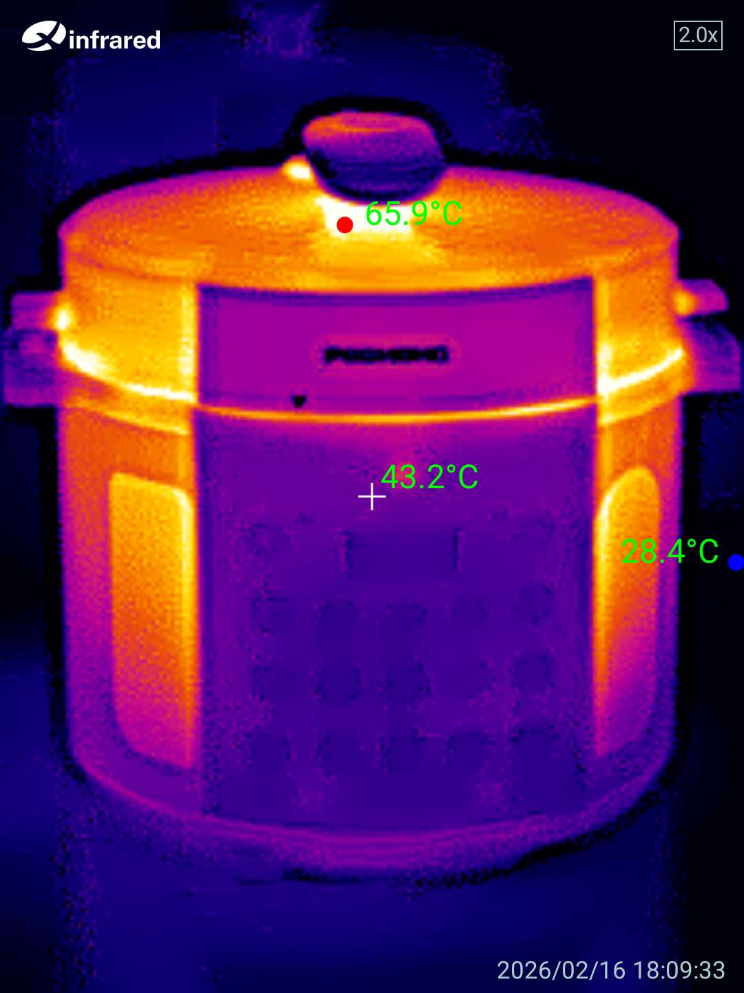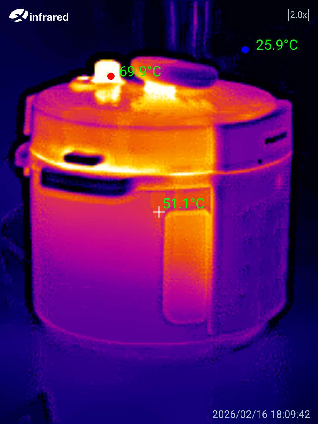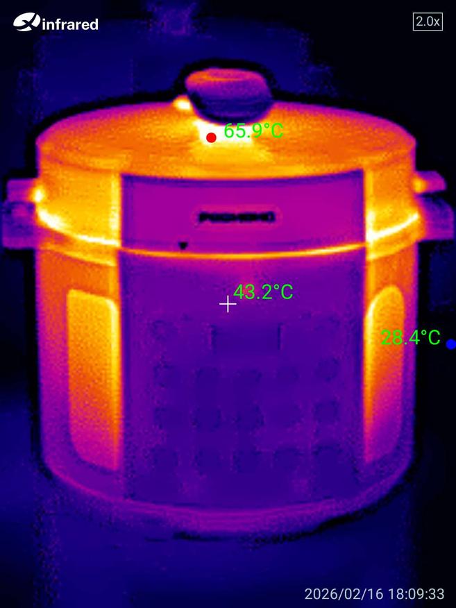 Корпус мультиварки отлично теплоизолирован, что обеспечивает безопасность при эксплуатации и снижает риск ожогов при случайном прикосновении. Снимки тепловизором показали, что средняя температура внешней поверхности находится в диапазоне 45-50 °C — вполне комфортно для прикосновения даже во время работы устройства.