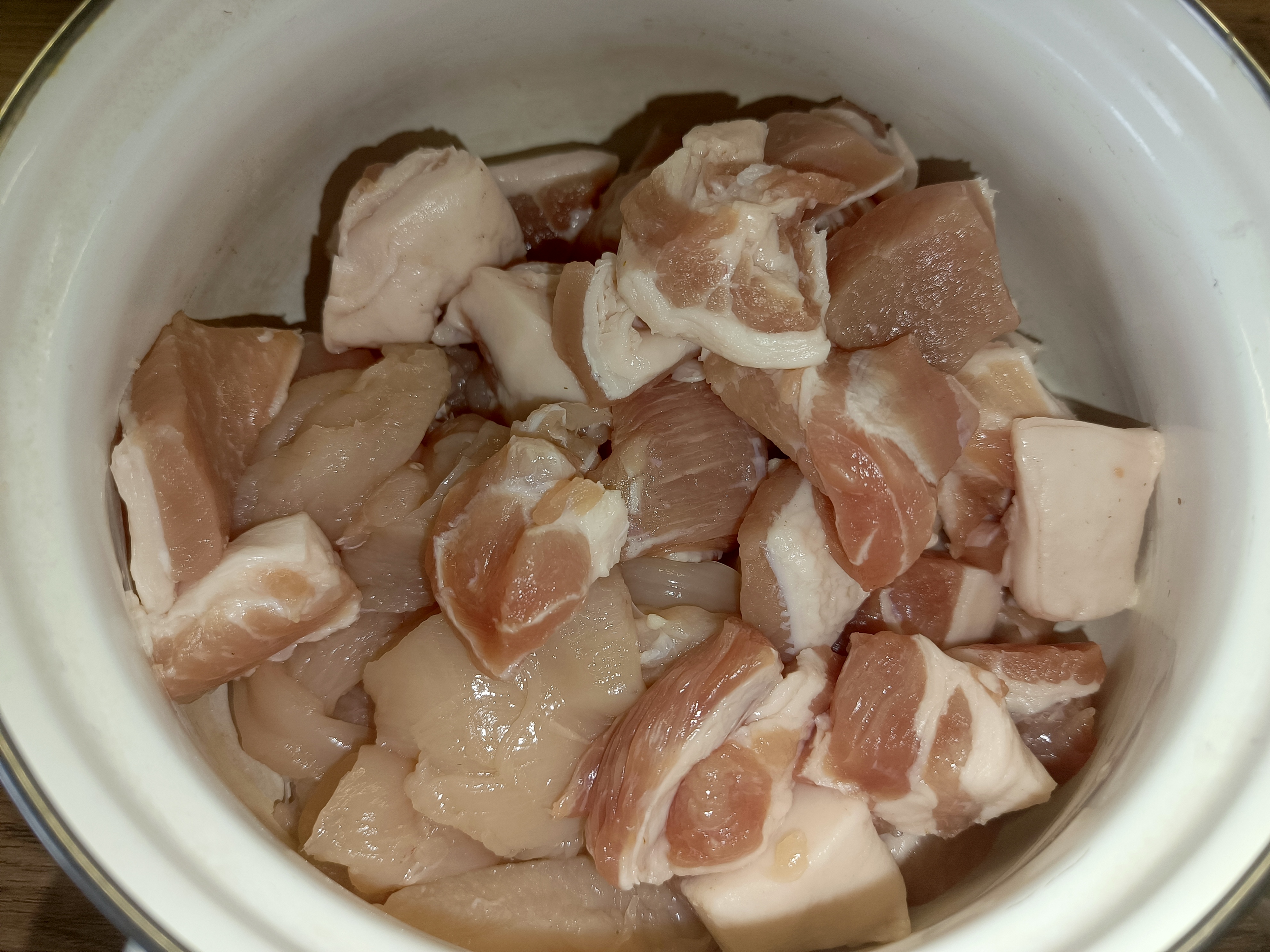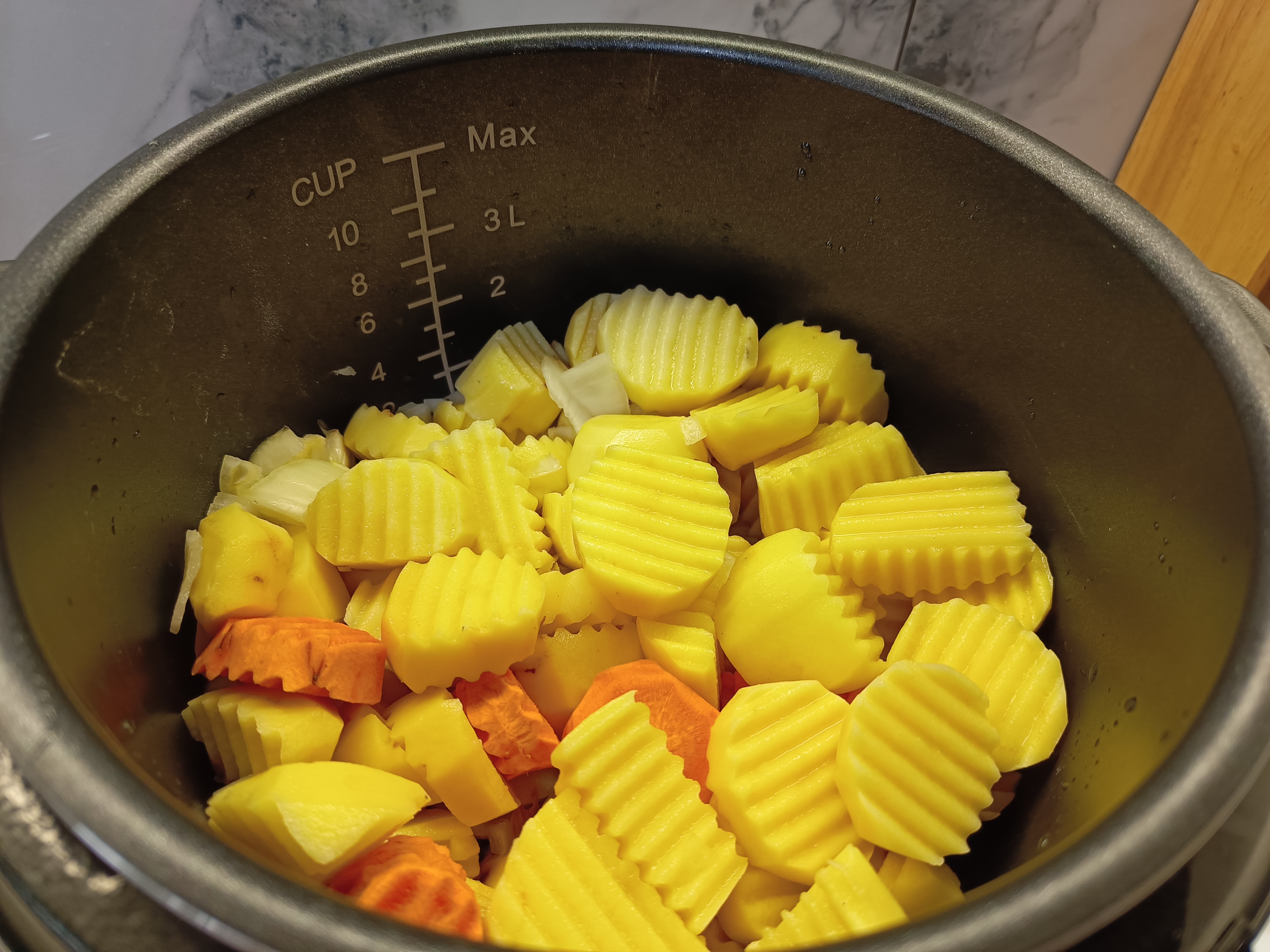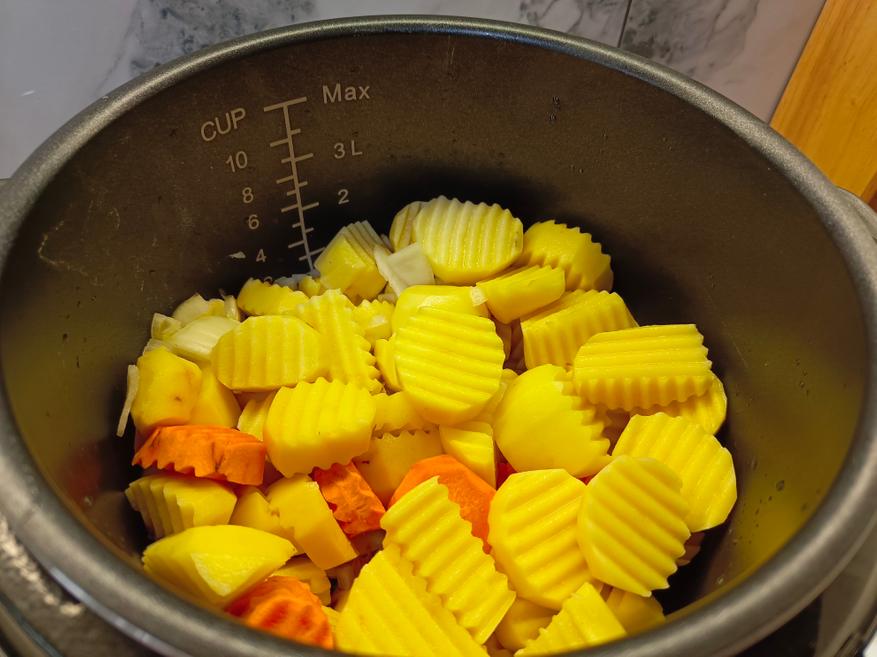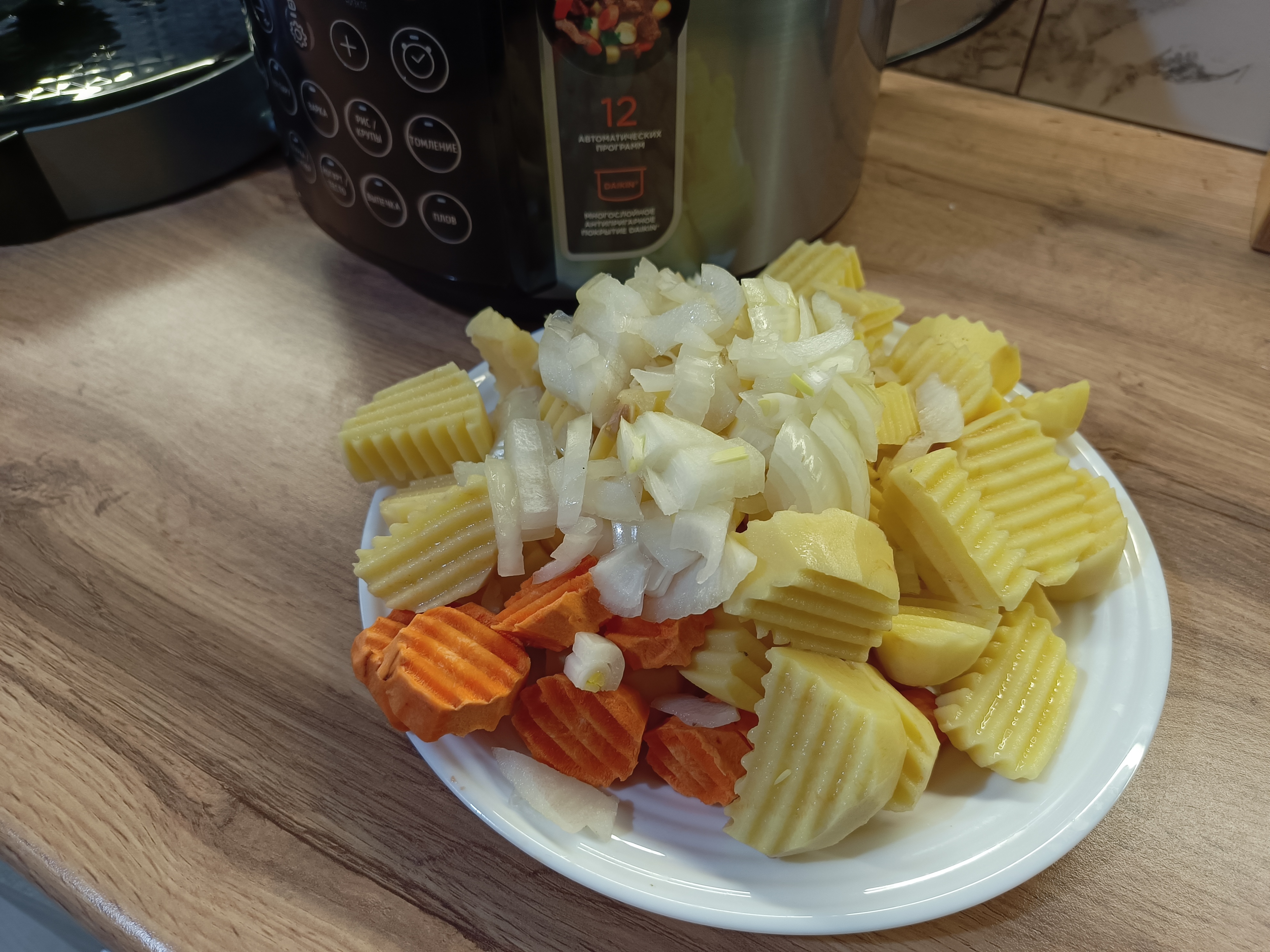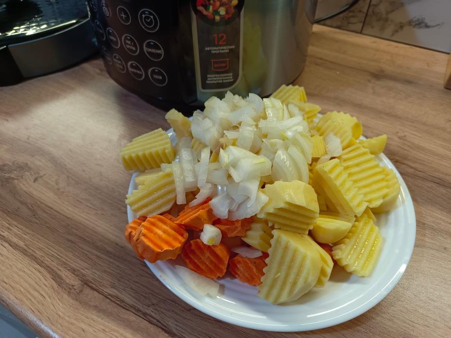 Для приготовления я использовал 1 кг уже очищенного картофеля, который нарезал рифлёным резаком. Морковь (100 граммов) нарезал кольцами, а лук (100 граммов) мелко нашинковал. Свинину взял в количестве 800 граммов и нарезал небольшими кусочками, чтобы мясо равномерно приготовилось и осталось сочным.