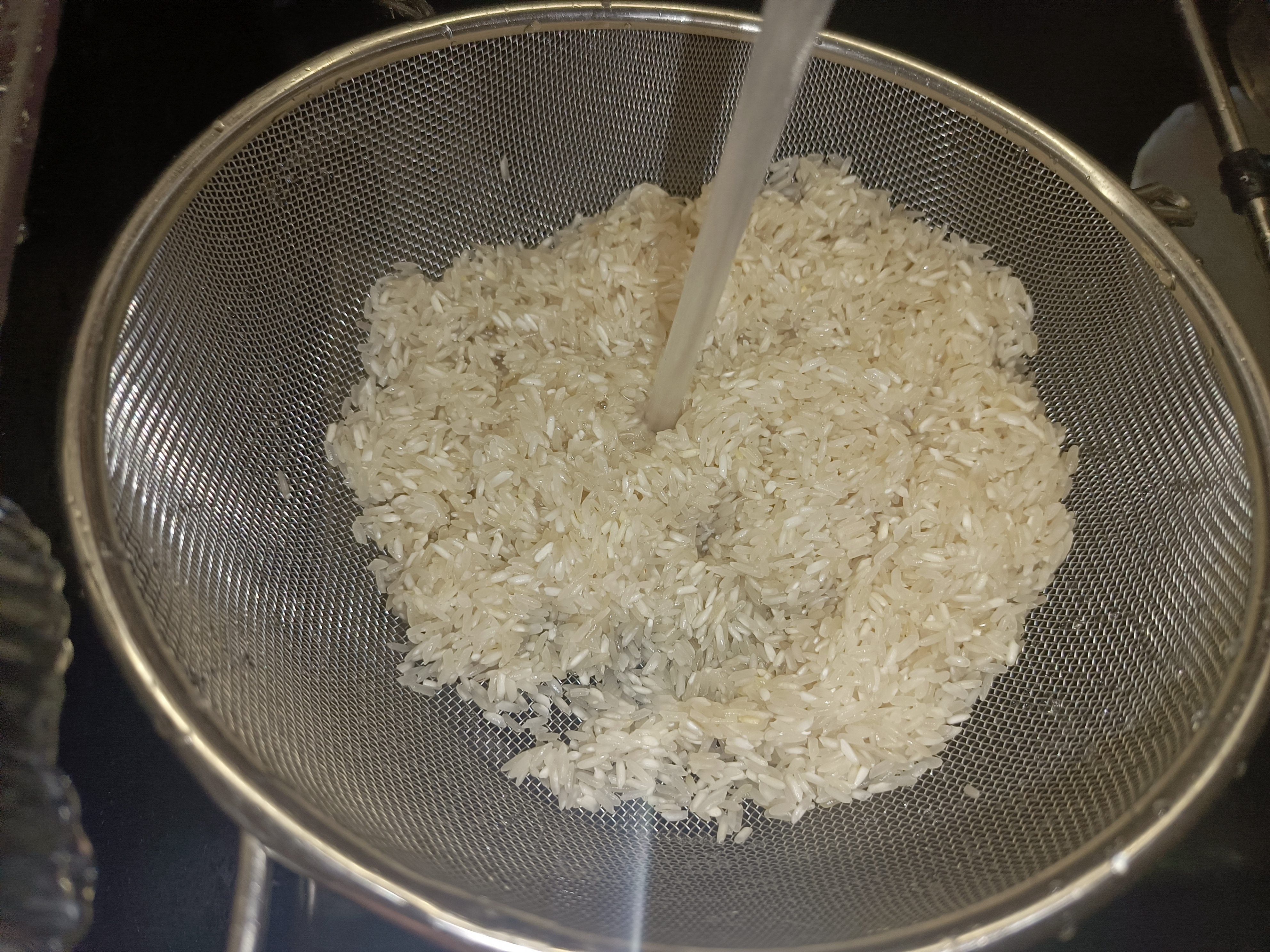 Рис предварительно промыл, добавил щепотку соли и столовую ложку подсолнечного масла, чтобы крупа не слипалась. Соотношение воды и риса я взял 1 стакан риса на 2,5 стакана воды — это оптимальное количество для рассыпчатого гарнира.