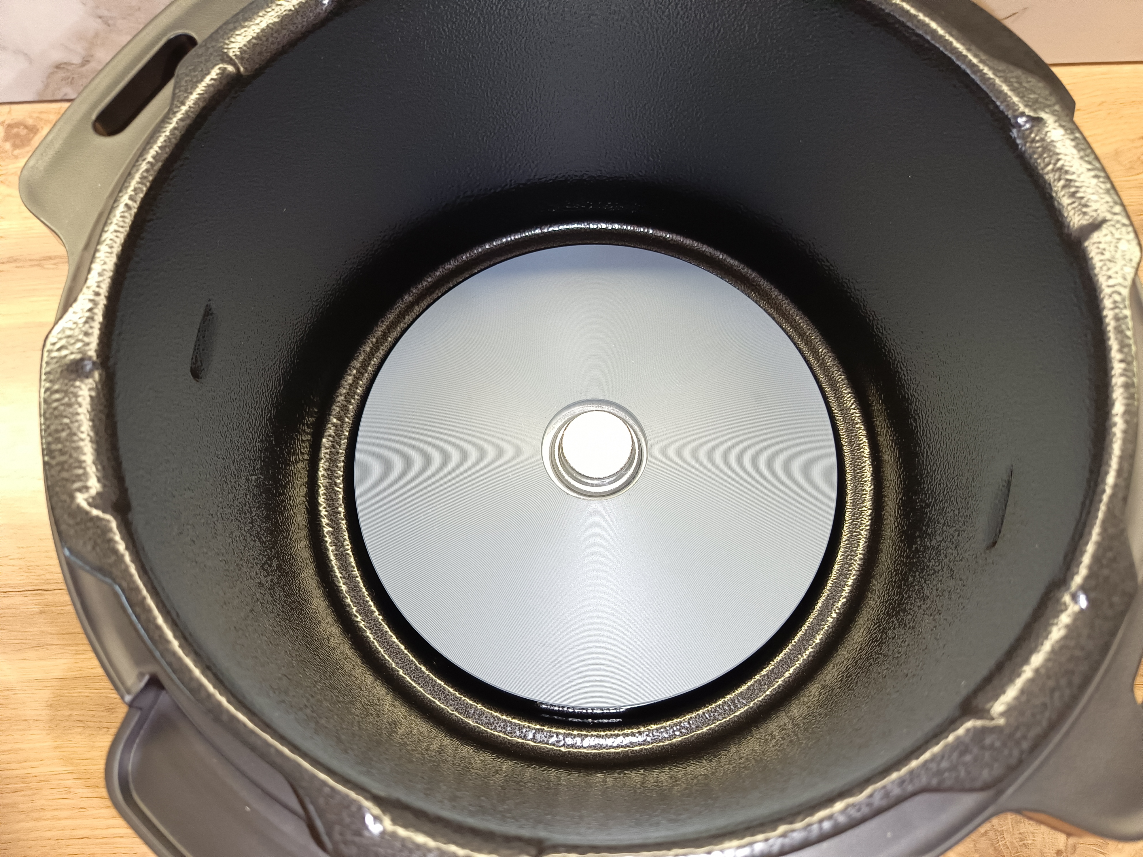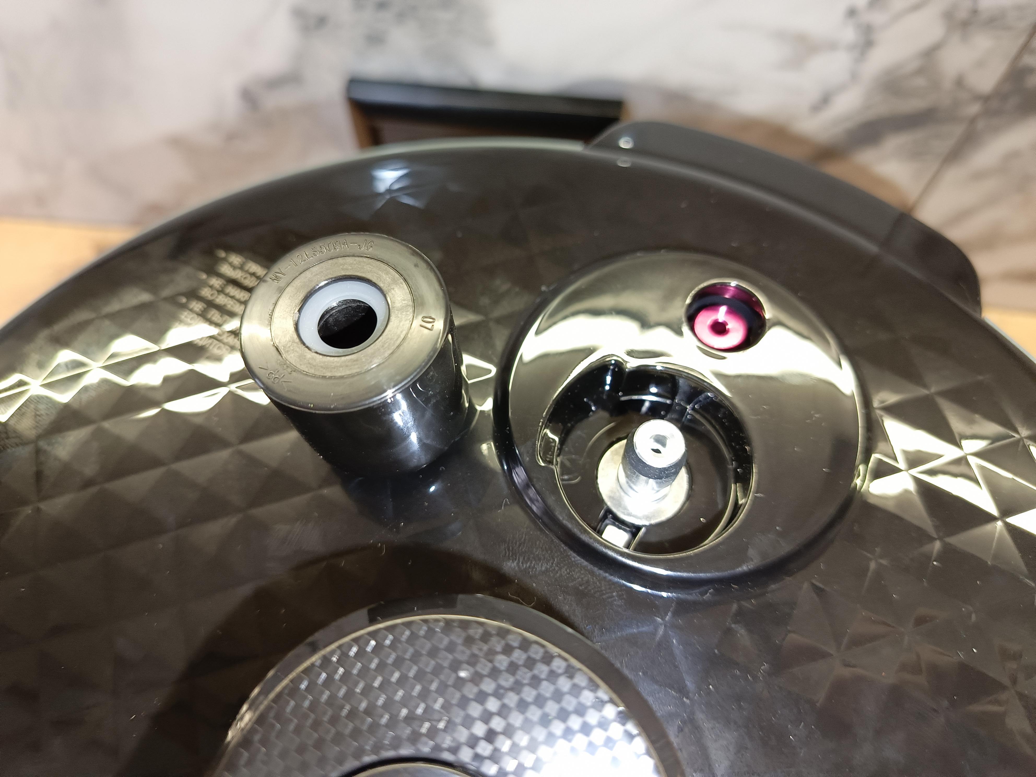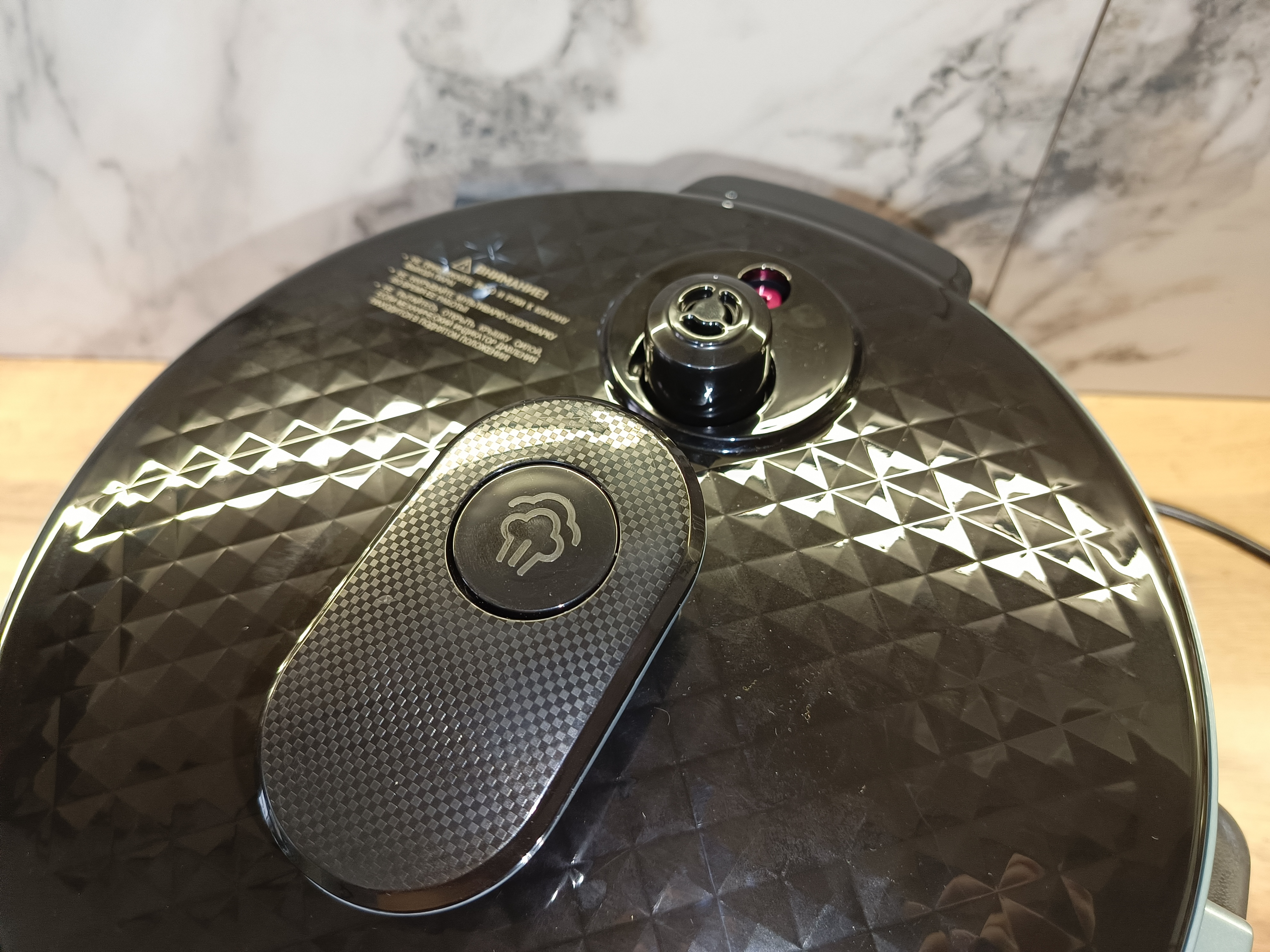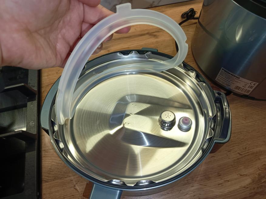 Сверху установлены два механических клапана, через которые осуществляется сброс давления. Первый клапан чёрного цвета работает в автоматическом режиме: он закрывается под действием собственного веса, а при избыточном давлении приподнимается вверх, обеспечивая его безопасный сброс. С обратной стороны клапана предусмотрена защитная сеточка, которая снижает вероятность засорения проходных отверстий специями или частицами пищи во время приготовления.