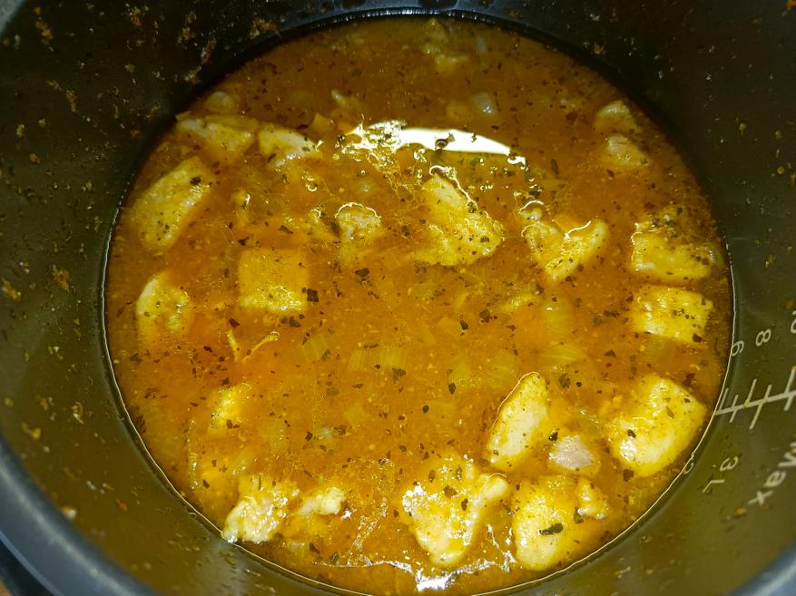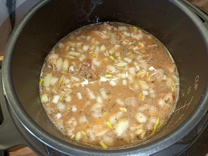 Готовил я это блюдо в режиме «Суп», а это означает работу в формате скороварки на максимальной мощности. Время приготовления по программе составляет 20 минут. Все ингредиенты сначала укладываем в чашу и тщательно перемешиваем со специями, и только после этого заливаем водой. Обязательно хорошо распределите специи сразу — в режиме скороварки вы уже не сможете открыть крышку и дополнительно перемешать содержимое. После этого доливаем воду почти до отметки MAX и запускаем программу.
