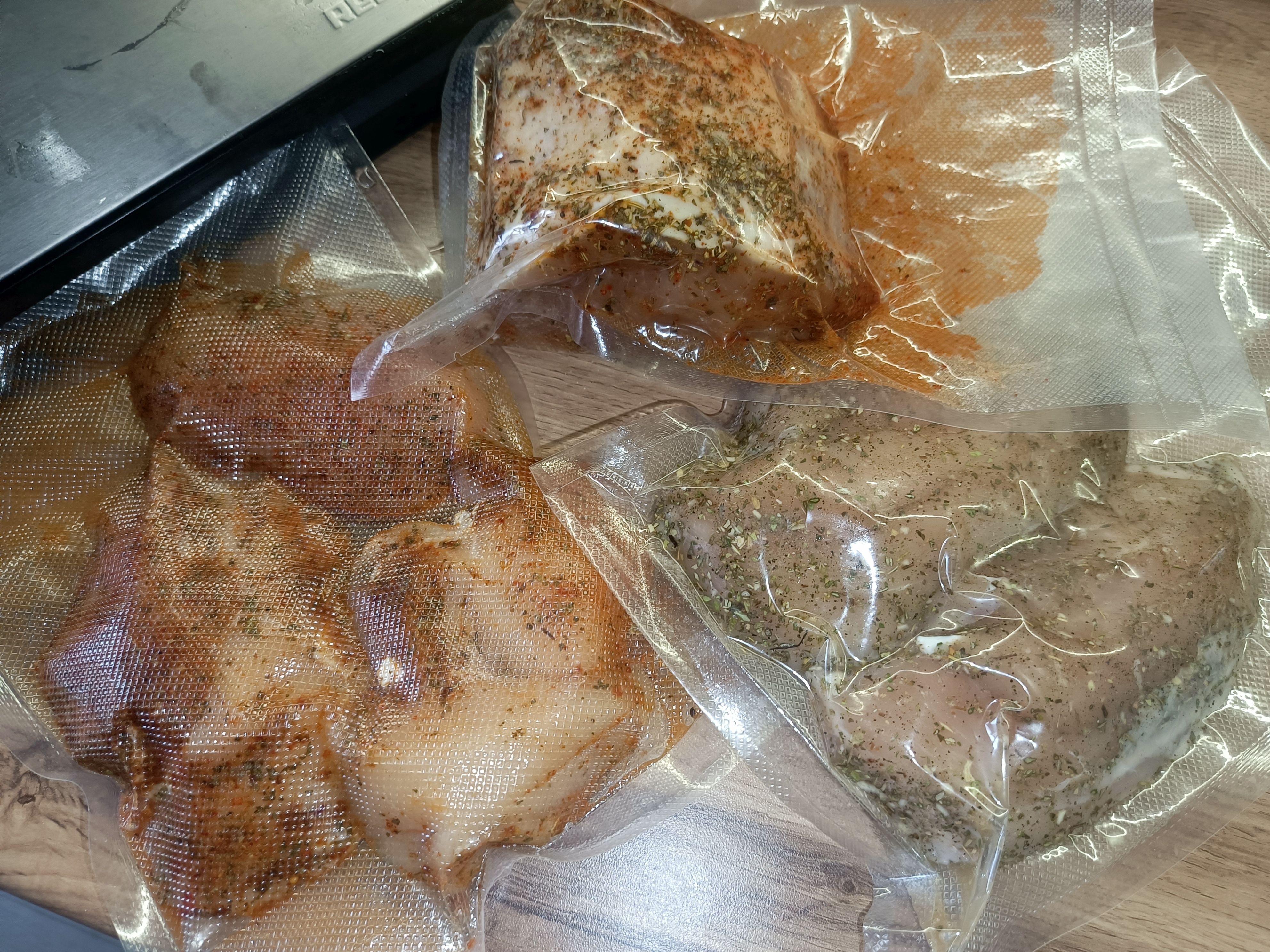 Для приготовления по методу су-вид я взял свиной карбонат и куриную грудку. Рецепт максимально простой: на 1 кг продукта я добавил 17 г нитритной соли, а специи выбирал на своё усмотрение. У меня было три разные упаковки с мясом. Для каждой я использовал разные специи. В двух словах, розмарин, базилик, чёрный и красный перец, сушёный чеснок, паприку и многое другое.