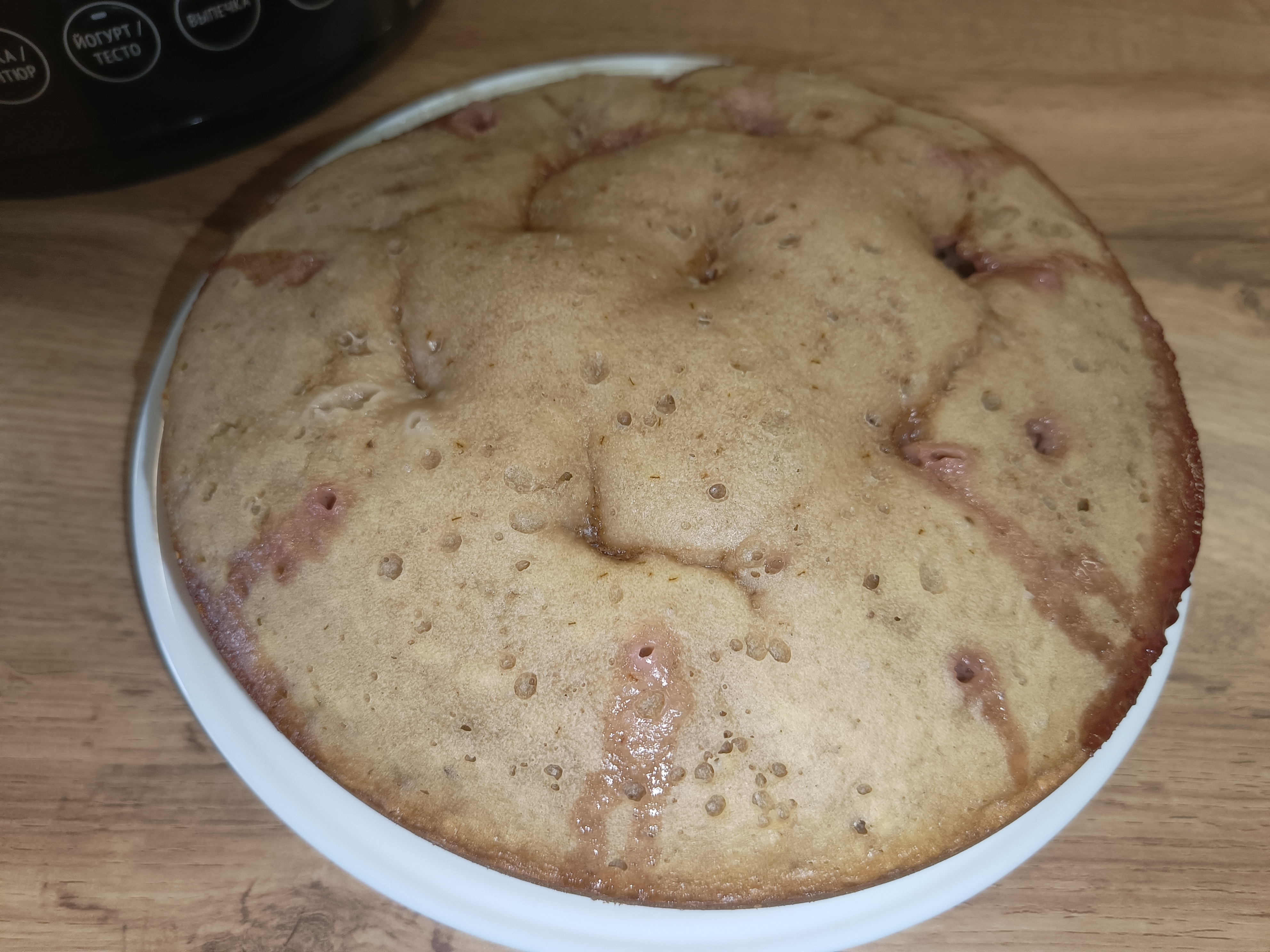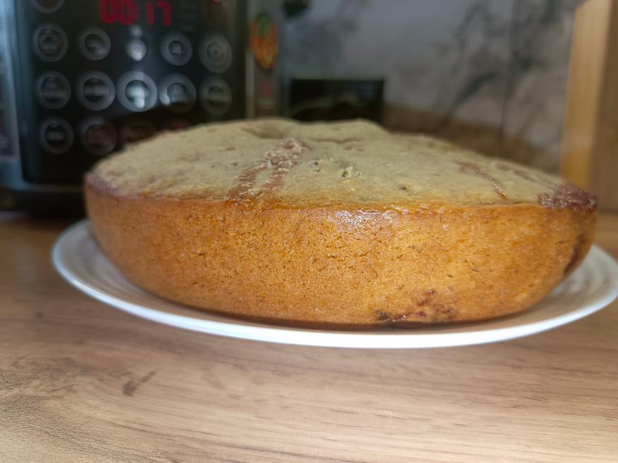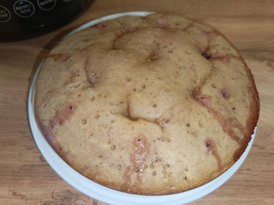 В итоге получился отличный клубничный кекс: он легко отделился от чаши и буквально сам «выпал» из неё без каких-либо усилий. Ничего не пригорело, поверхность осталась ровной, а пропёкся десерт равномерно со всех сторон.