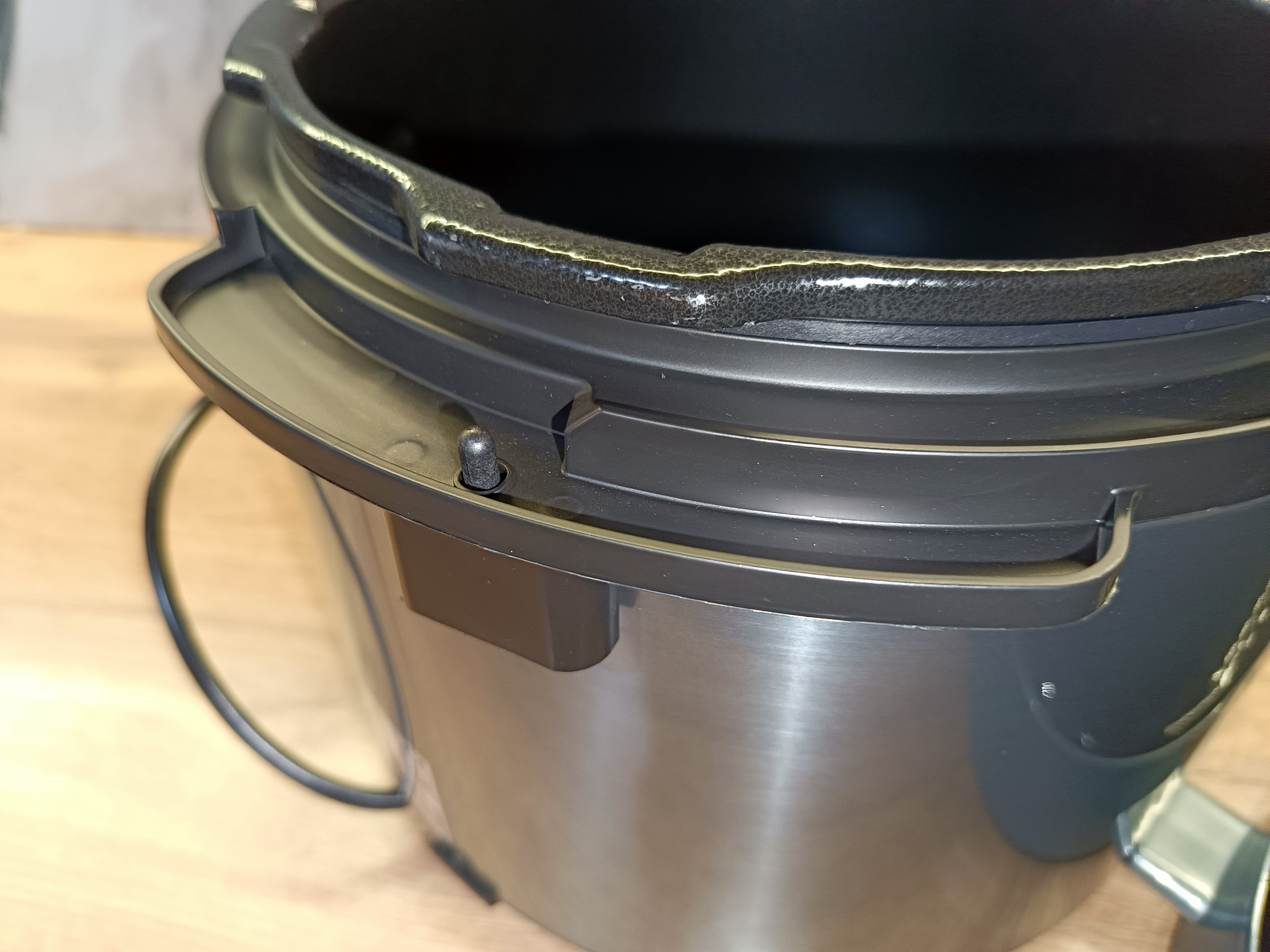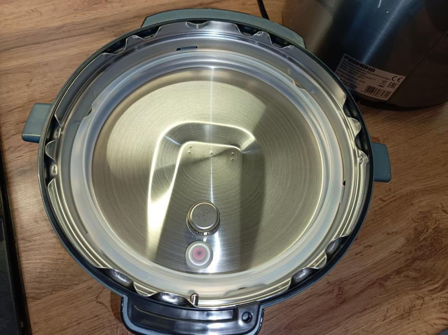 Второй клапан — красный, механический — выполняет аварийную функцию. Если давление станет чрезмерным, а основной клапан по какой-либо причине заклинит, этот элемент сработает как дополнительная защита и будет выдавлен наружу, предотвращая опасную ситуацию. Перед каждой готовкой обязательно проверяйте состояние клапанов, регулярно промывайте их и не оставляйте мультиварку без присмотра во время работы. Также рекомендуется время от времени аккуратно приподнимать клапан в процессе приготовления, чтобы убедиться в его корректном функционировании, для этого есть круглая кнопка на ручке.