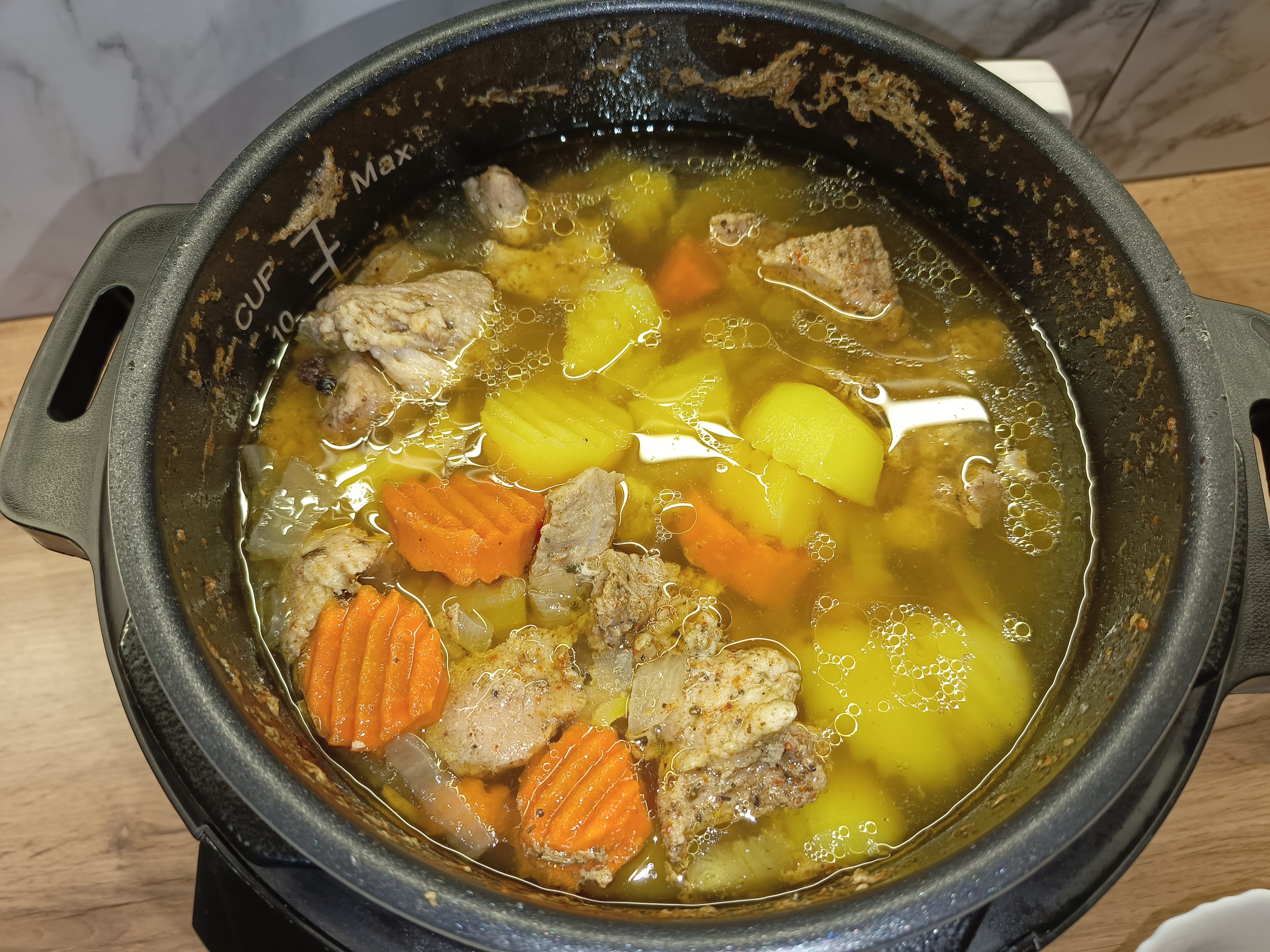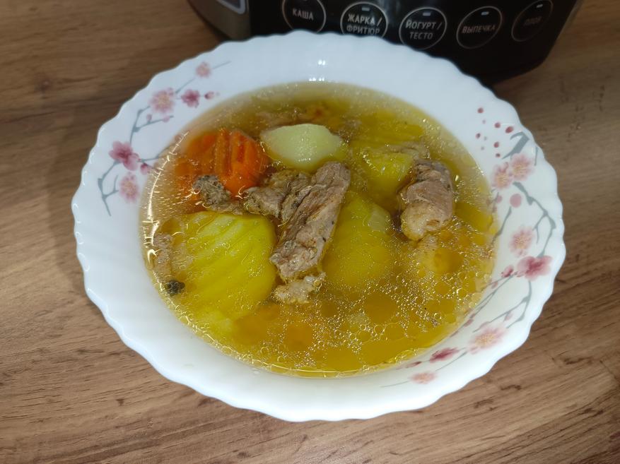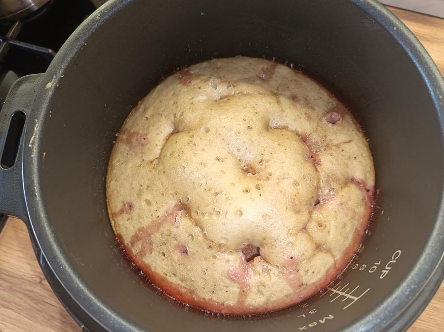 Так как готовка происходила под давлением, мясо уже полностью приготовилось за это время. Результат превзошёл ожидания: кусочки буквально таяли во рту, легко распадались на волокна, но при этом сохраняли нежность и сочность. Подлива приобрела насыщенный вкус благодаря специям и луку с морковью.
