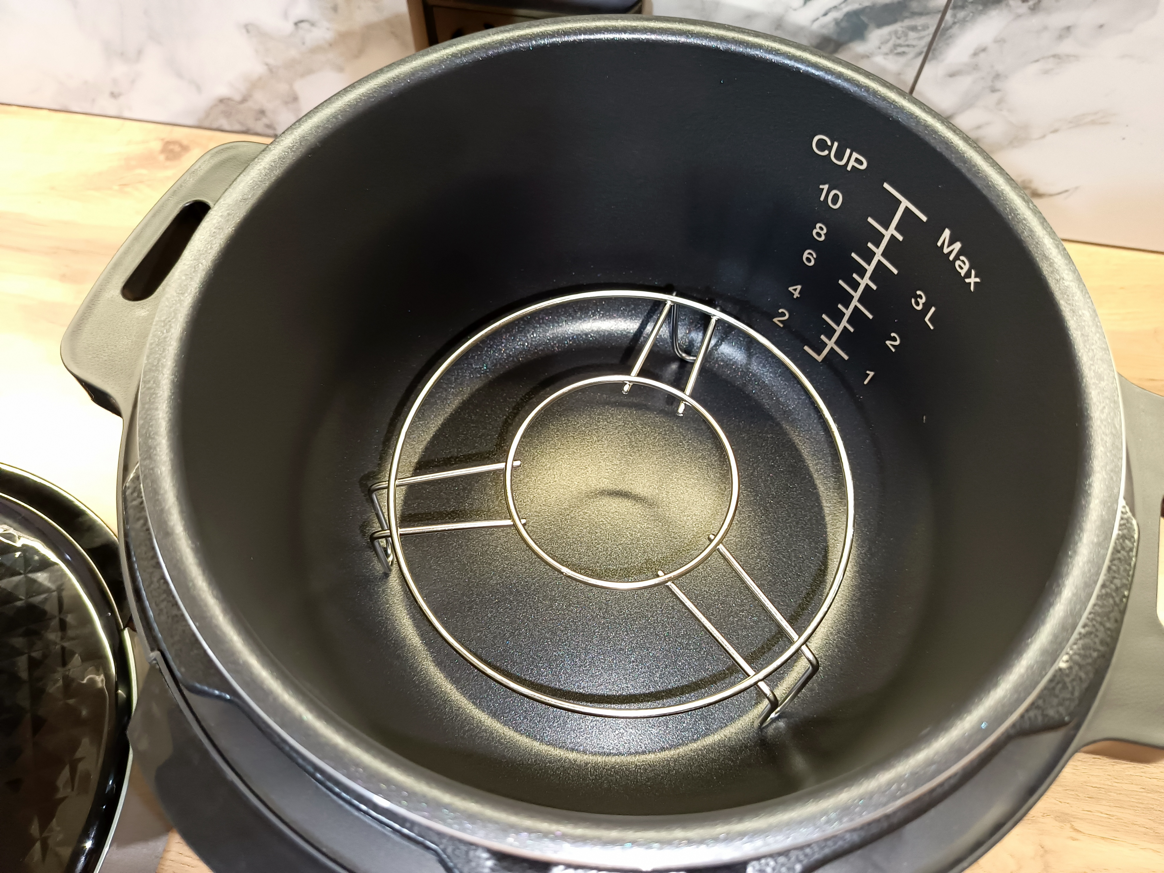 Главное правило при приготовлении — не превышать отметку MAX на внутренней шкале чаши. Соблюдение этого требования особенно важно при работе в режиме скороварки, так как избыточное заполнение может повлиять на корректную работу устройства и процесс набора давления.