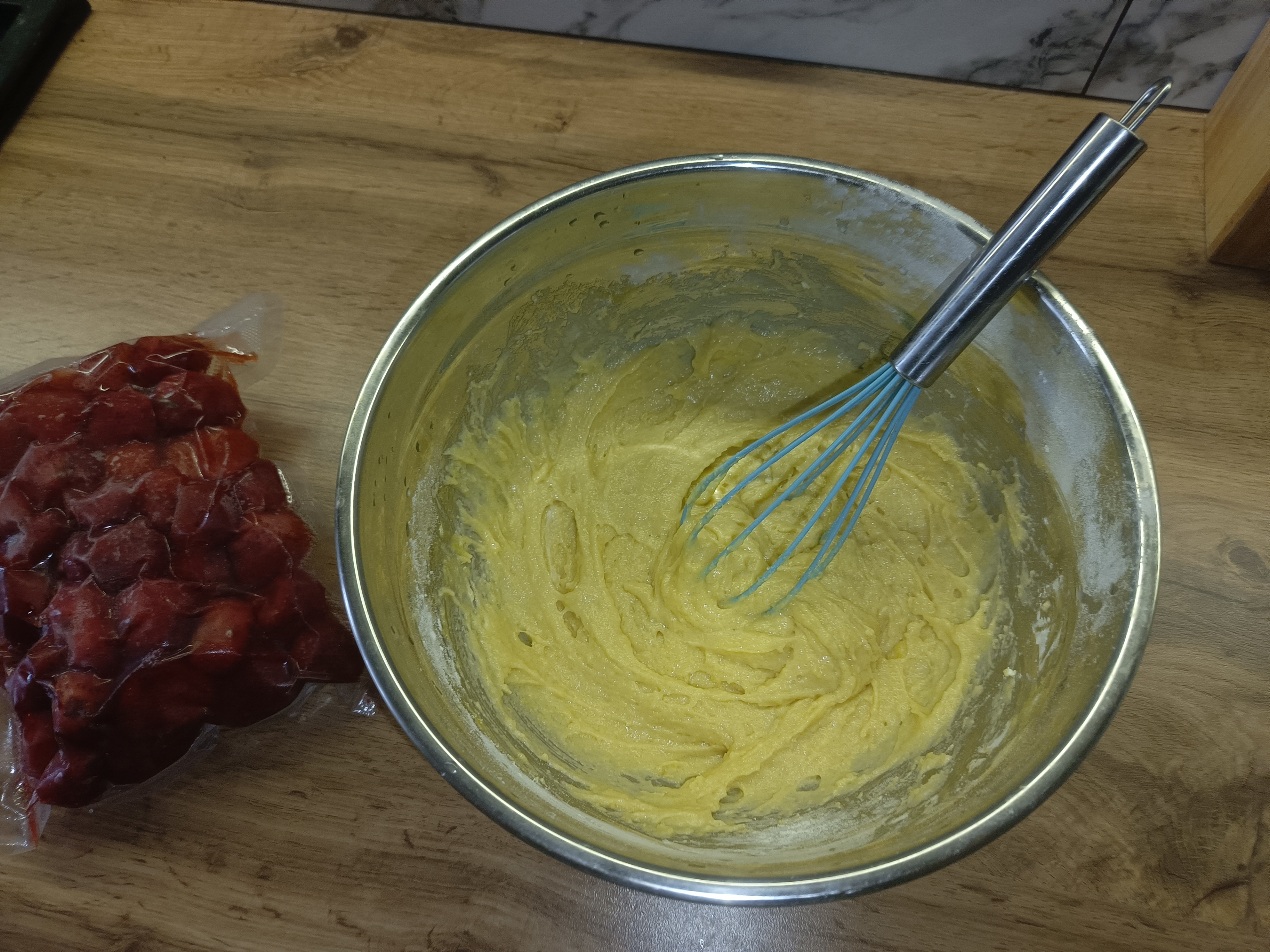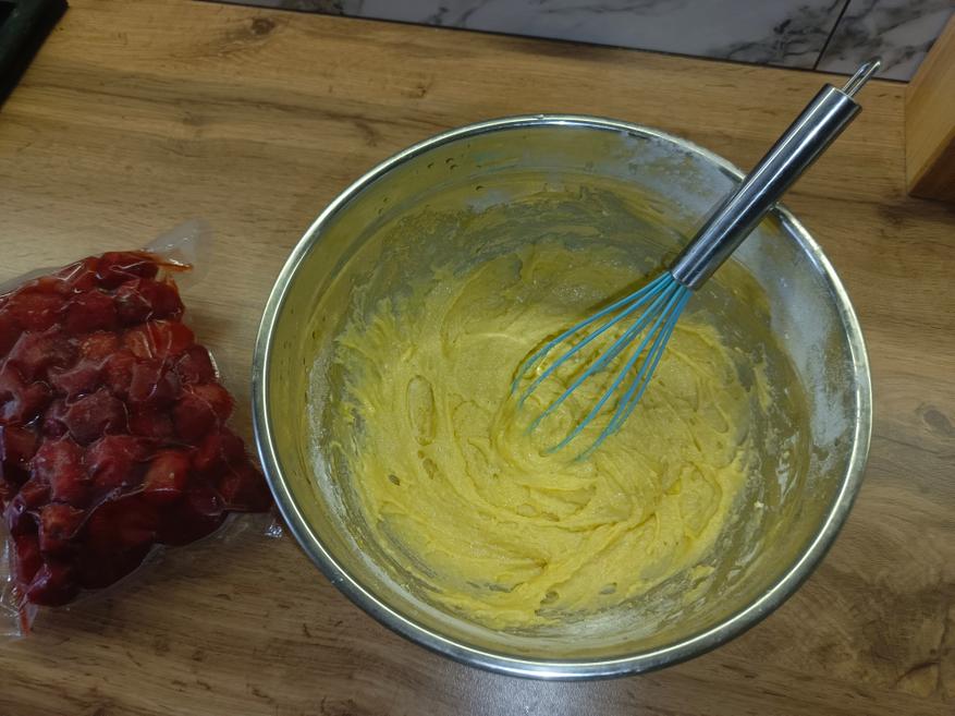 На десерт я решил приготовить что-то вроде клубничного кекса, заодно проверив, насколько качественное антипригарное покрытие у чаши. Некоторые предпочитают дополнительно выстилать дно пергаментной бумагой, но мне такой способ не нравится, поэтому я просто смазываю стенки и дно небольшим кусочком сливочного масла, а уже затем закладываю подготовленные ингредиенты.