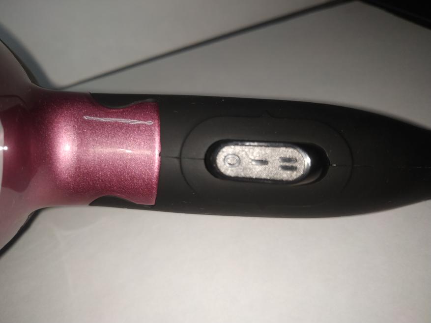 Исполнен в фиолетово-черном цвете, в продаже имеются красно-черные. Состоит из двух частей (ручка складная). Замечаний по сборке нет, все плотно подогнано, без скрипов и люфтов. Размер фена со сложенной ручкой 160х100х70 мм (умещается на мужской ладони), в рабочем виде 160х190х70 мм. Диаметр насадки 45 мм. На рукоятке расположена кнопка переключения режимов, в трех положениях: выкл., средний поток воздуха, максимальный режим.