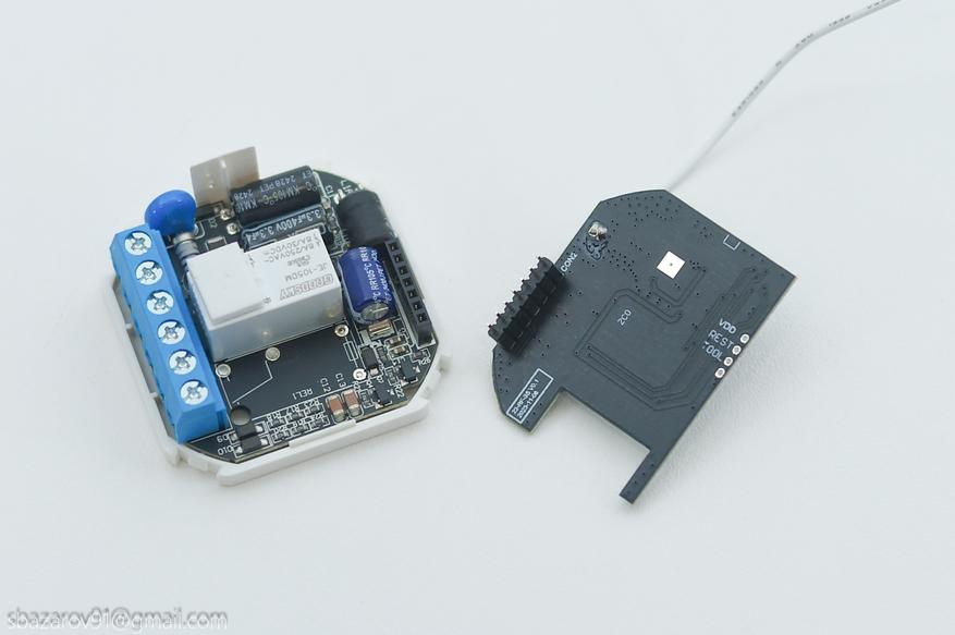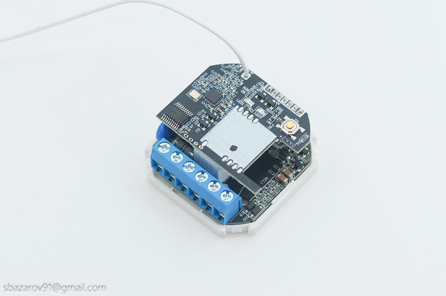 Для привязки выключателей к реле имеется физическая кнопка в правом верхнем углу, а слева от нее красный светодиодный индикатор. Принцип элементарный, удерживаем клавишу до появления мигающего светодиода, после чего жмем на клавишу выключателя. Повторяет до тех пор, пока выключатели не кончатся.