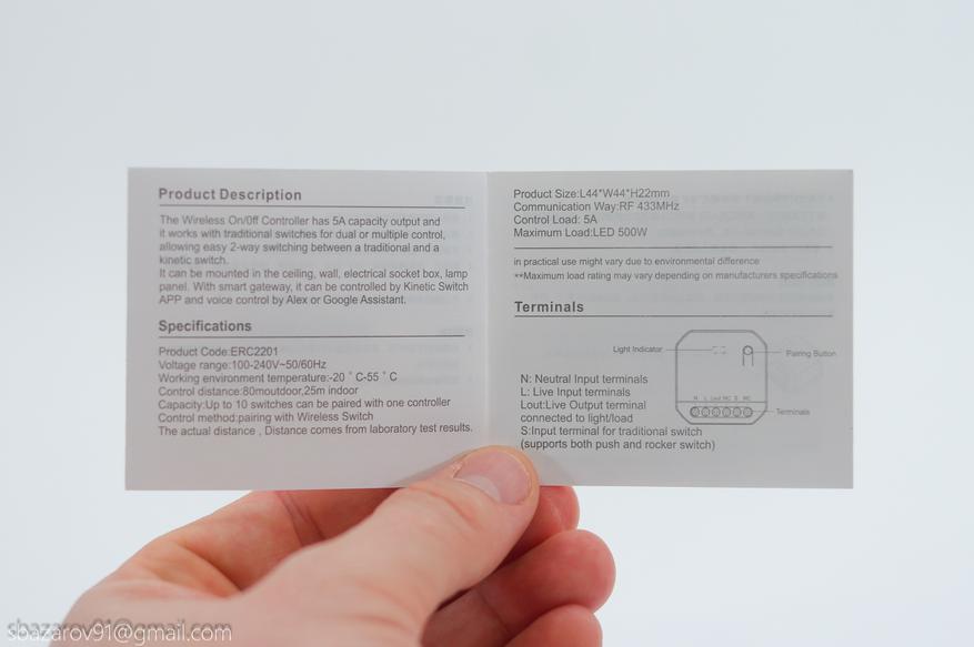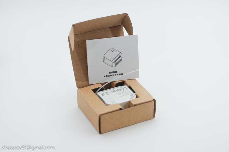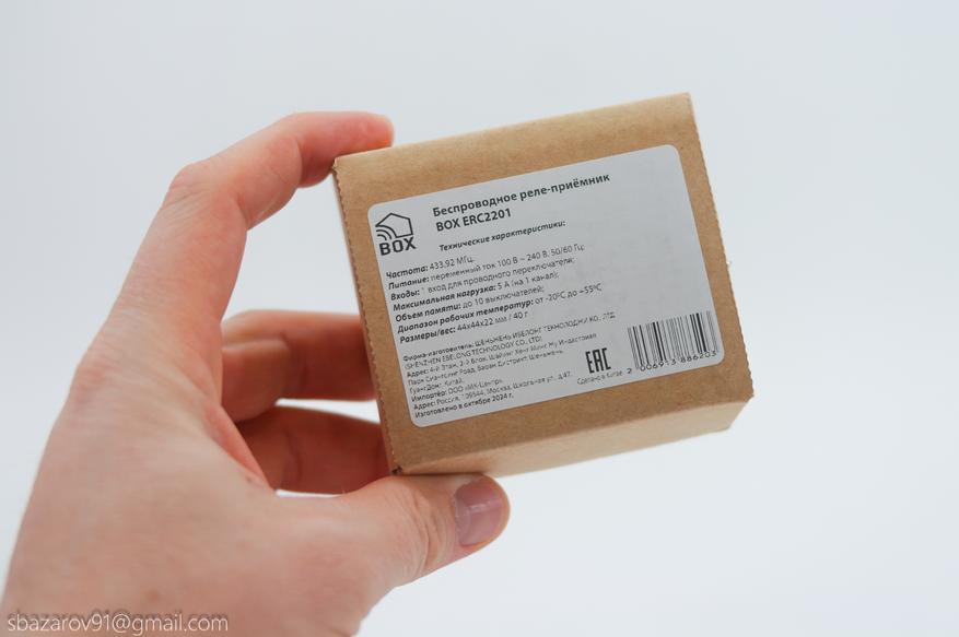 Начнем с беспроводного реле — BOX ERC2201. Поставляется он в картонной коробке с наклейкой с техническими характеристиками. Внутри само реле, концевые наконечники (6шт) и инструкция по эксплуатации. Гарантийный срок — 1 год.